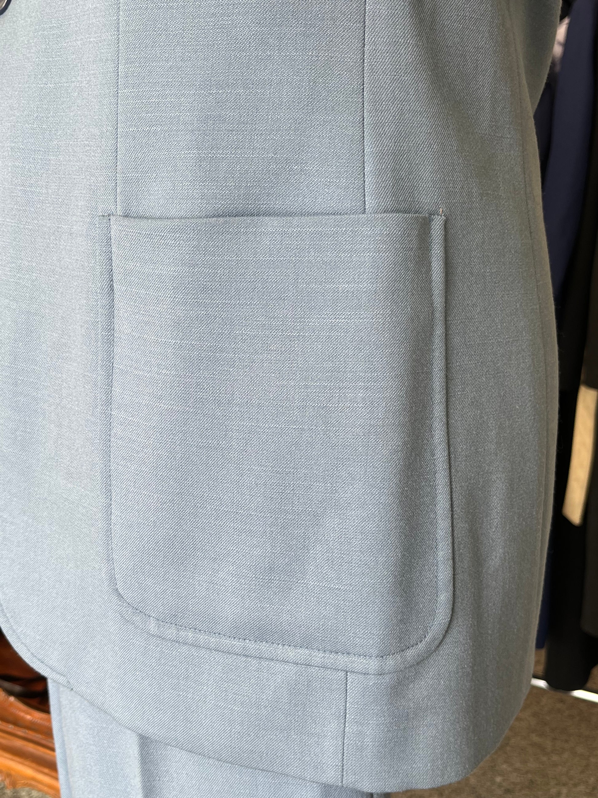 La giacca è un monopetto, due bottoni, baveri a dente ampi e tasche a toppa.