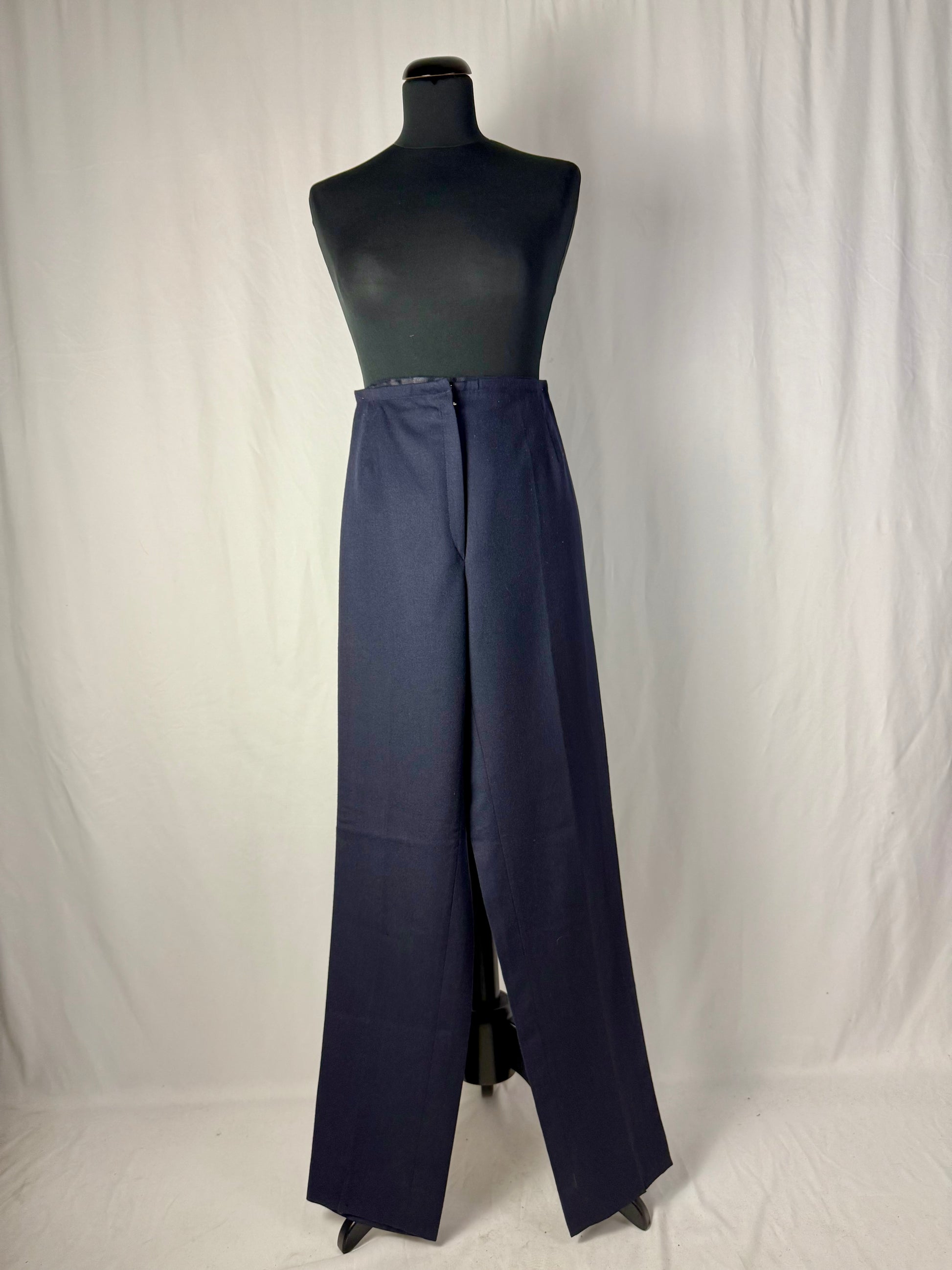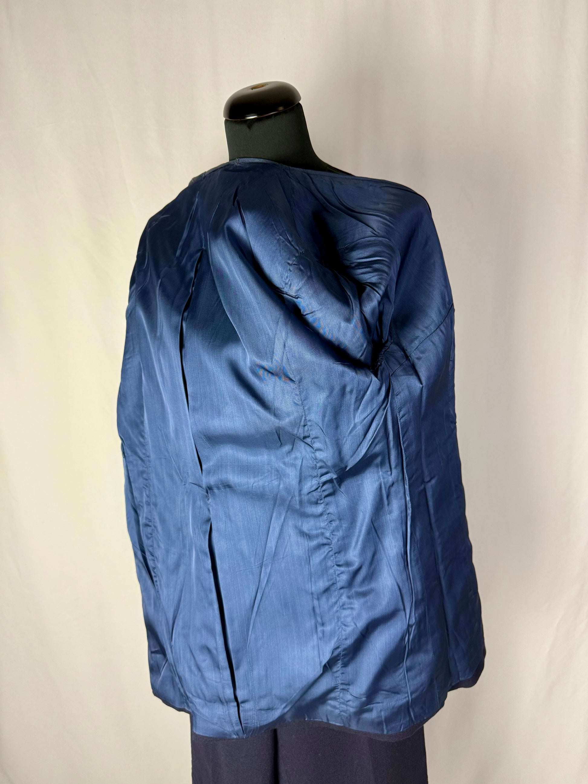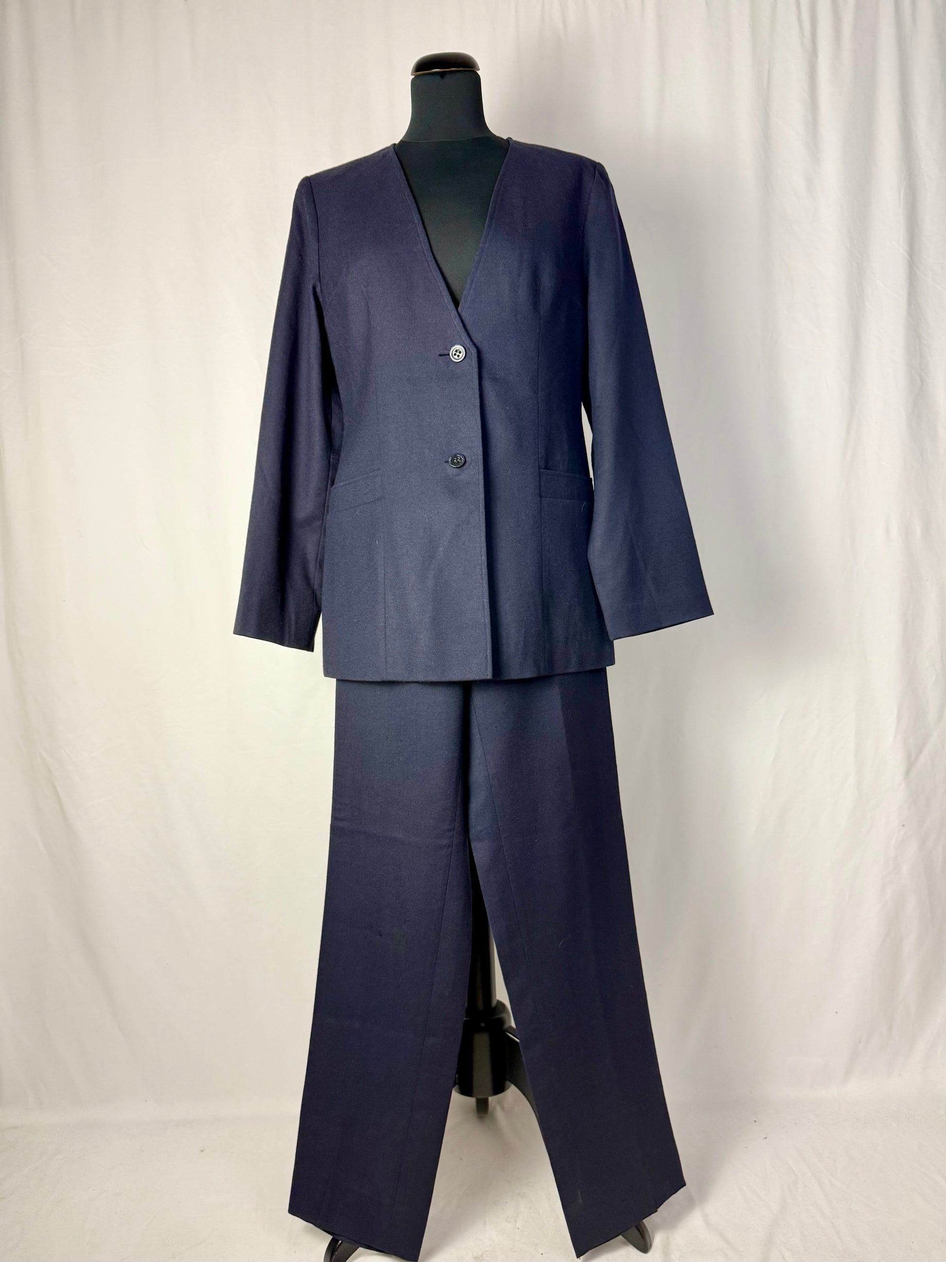 Completo sartoriale in 100% lana colore blu notte, di qualità eccellente, composto da giacca strutturata con scollo a V profondo, chiusura a due bottoni decentrata, tasche a filetto e maniche leggermente svasate — ideale da abbinare a camicia con rouches, blusa in seta o foulard — e pantalone a vita alta dal taglio pulito e dritto con caduta impeccabile.