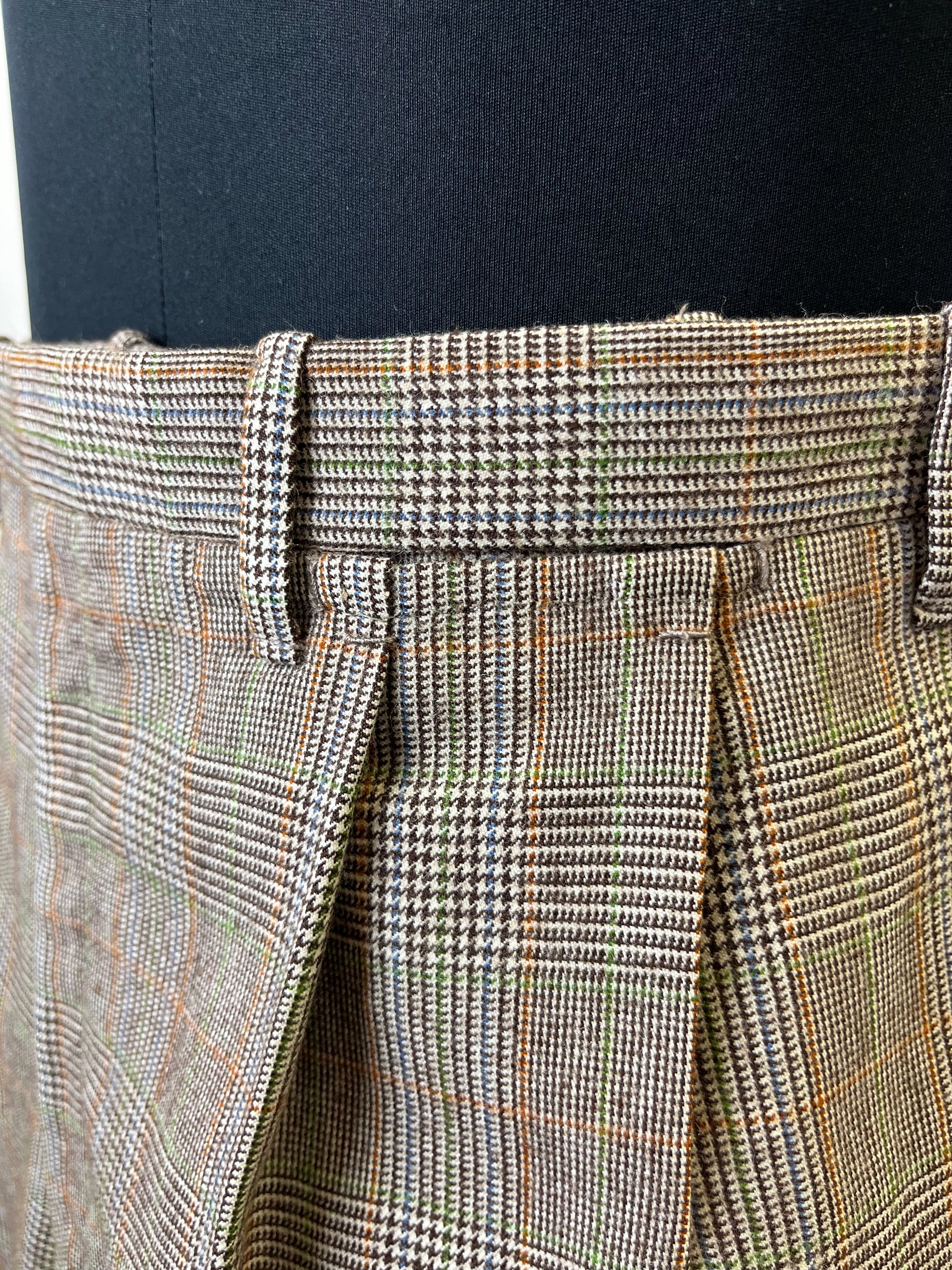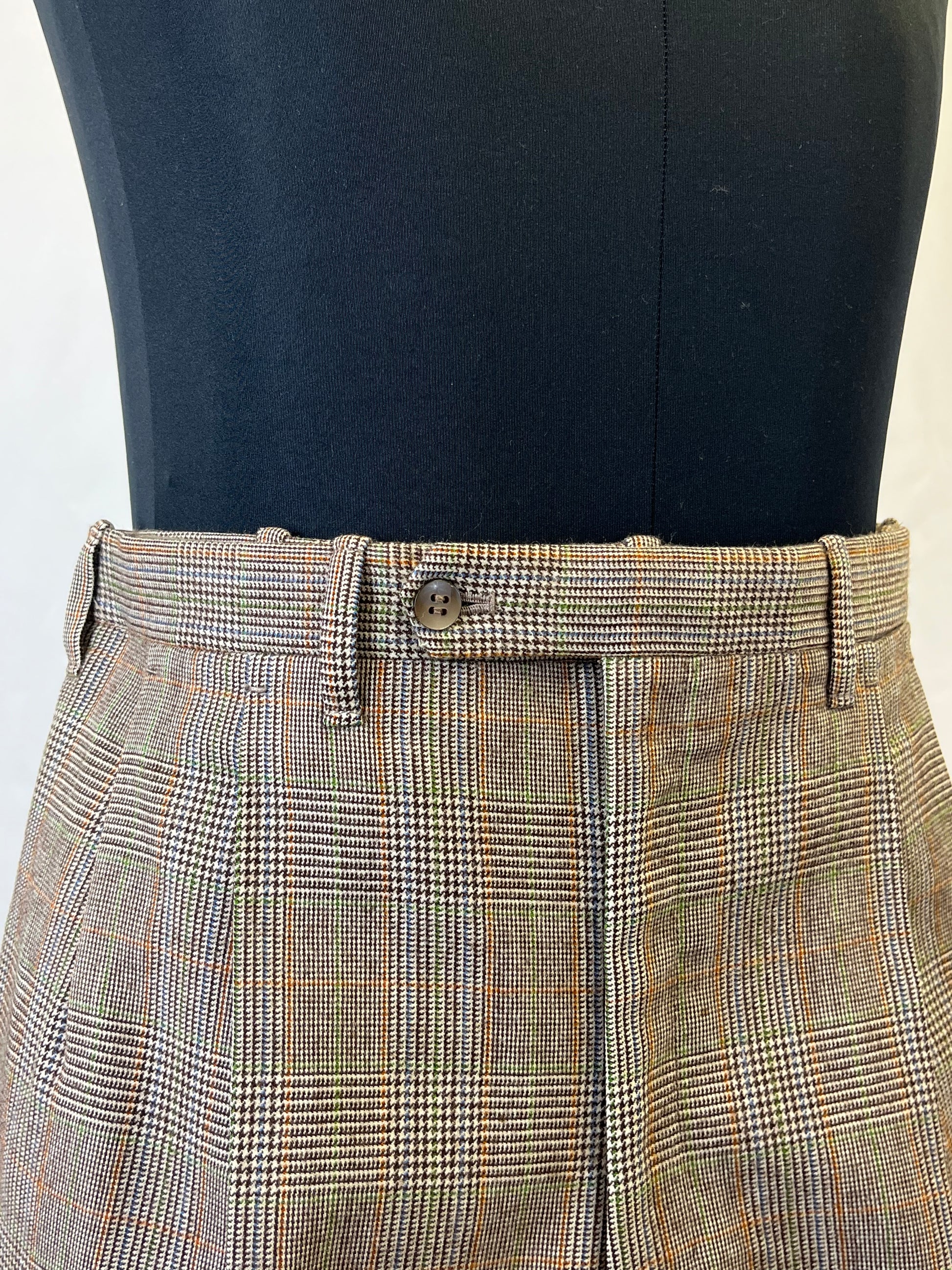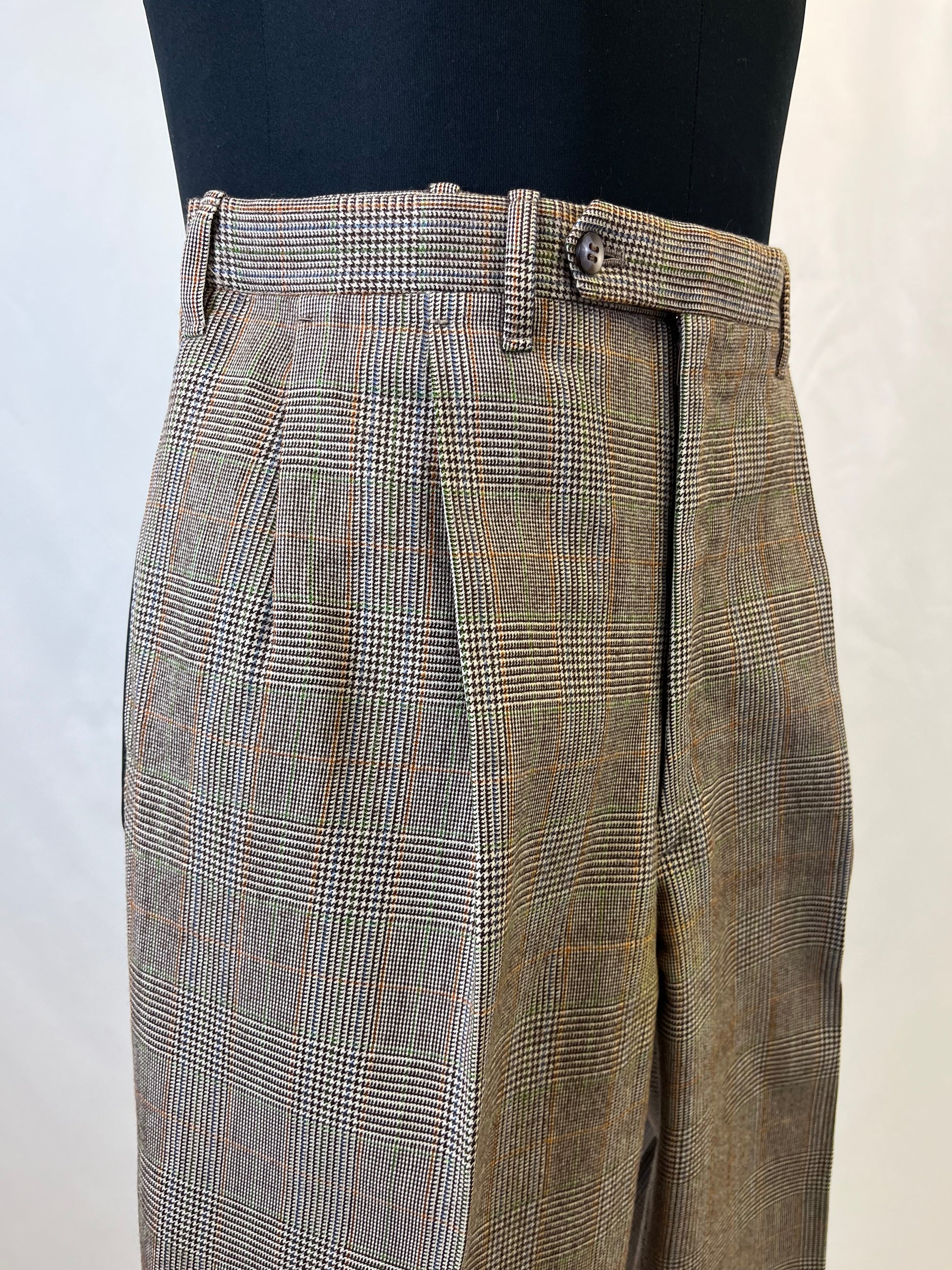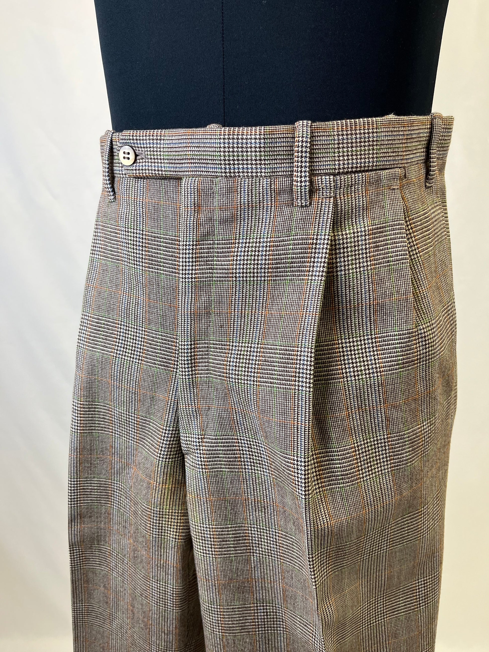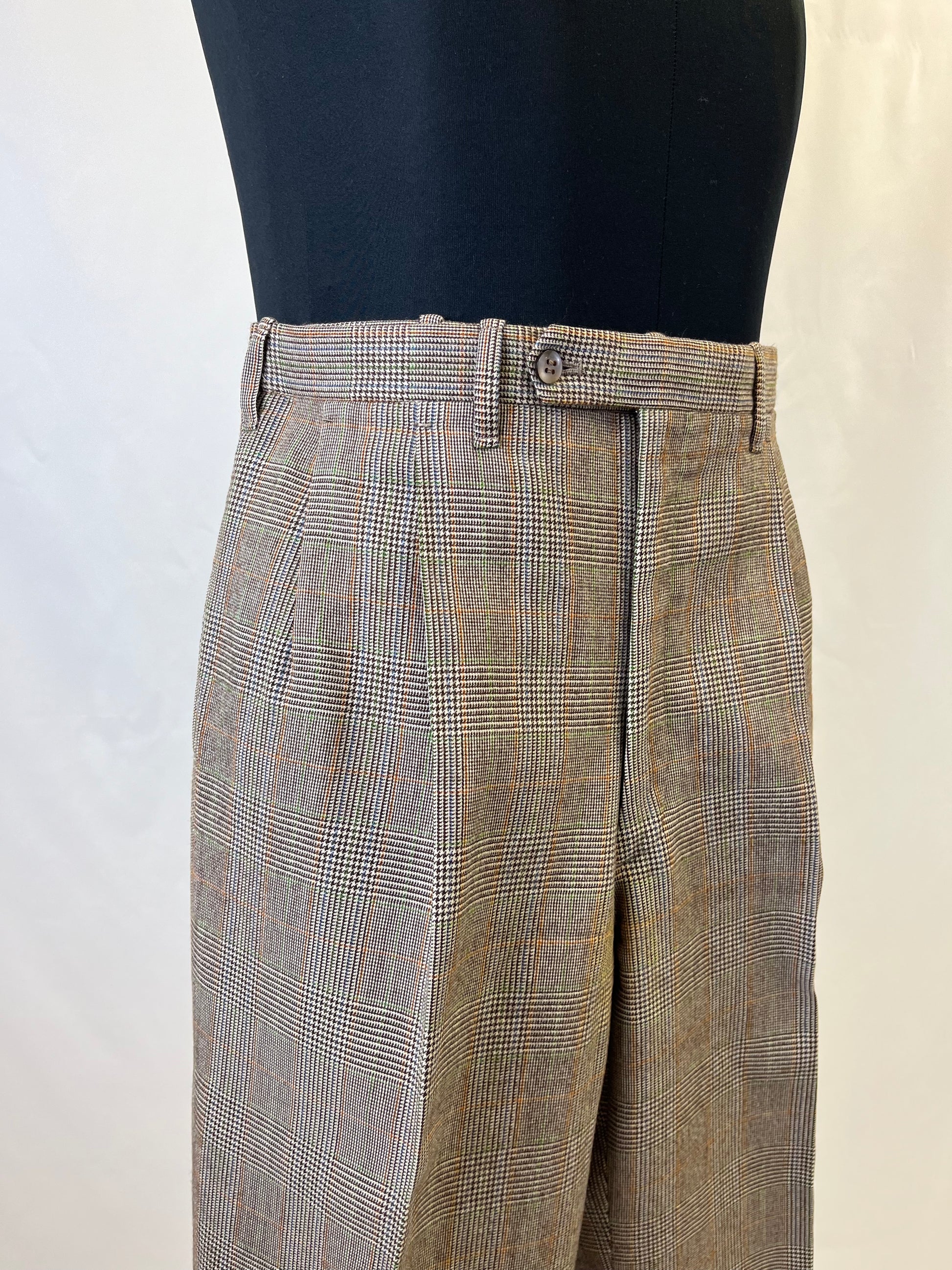 I calzoni hanno un taglio classico, con vita alta, doppia piega in vita e taschino da orologio.