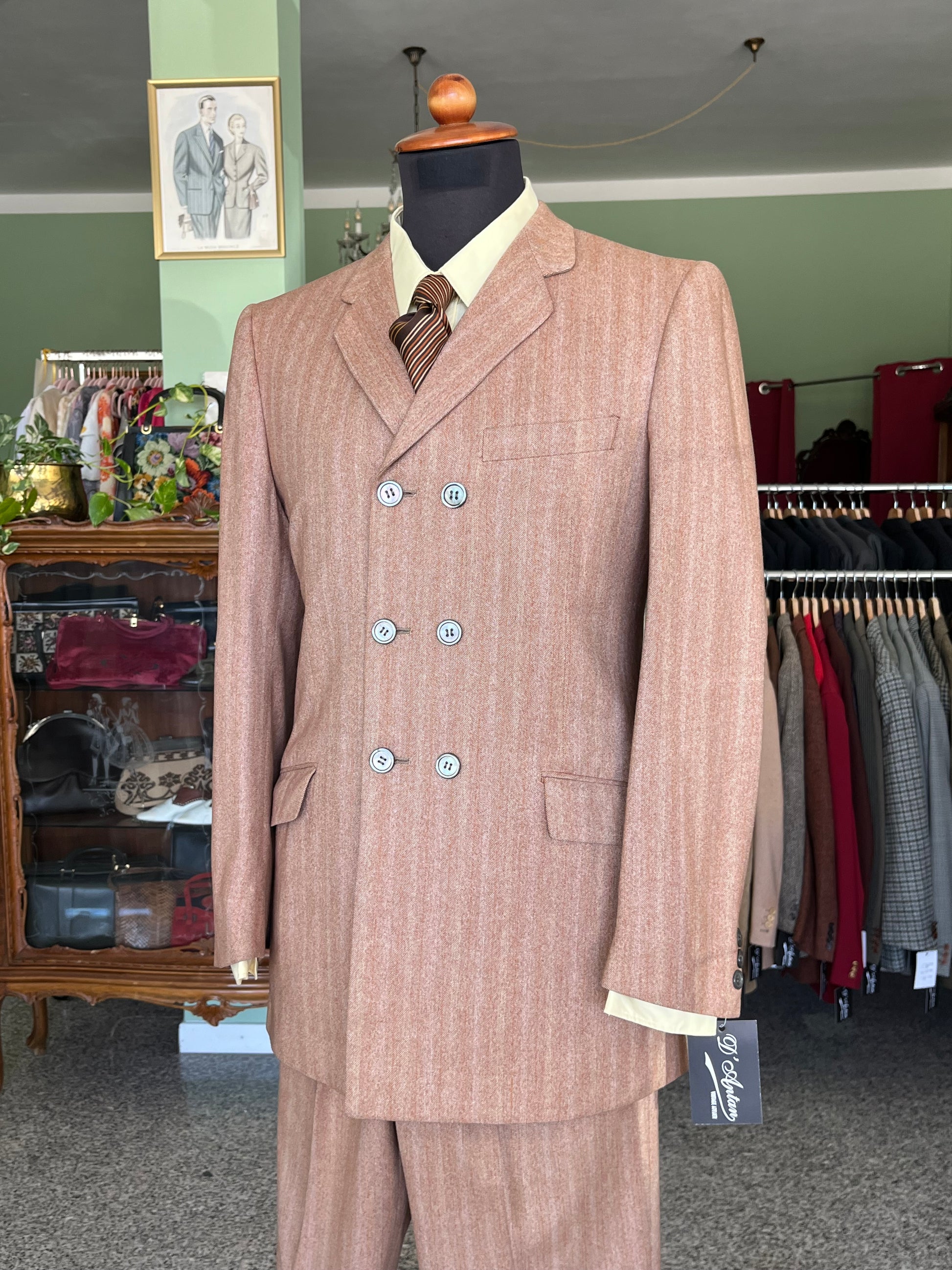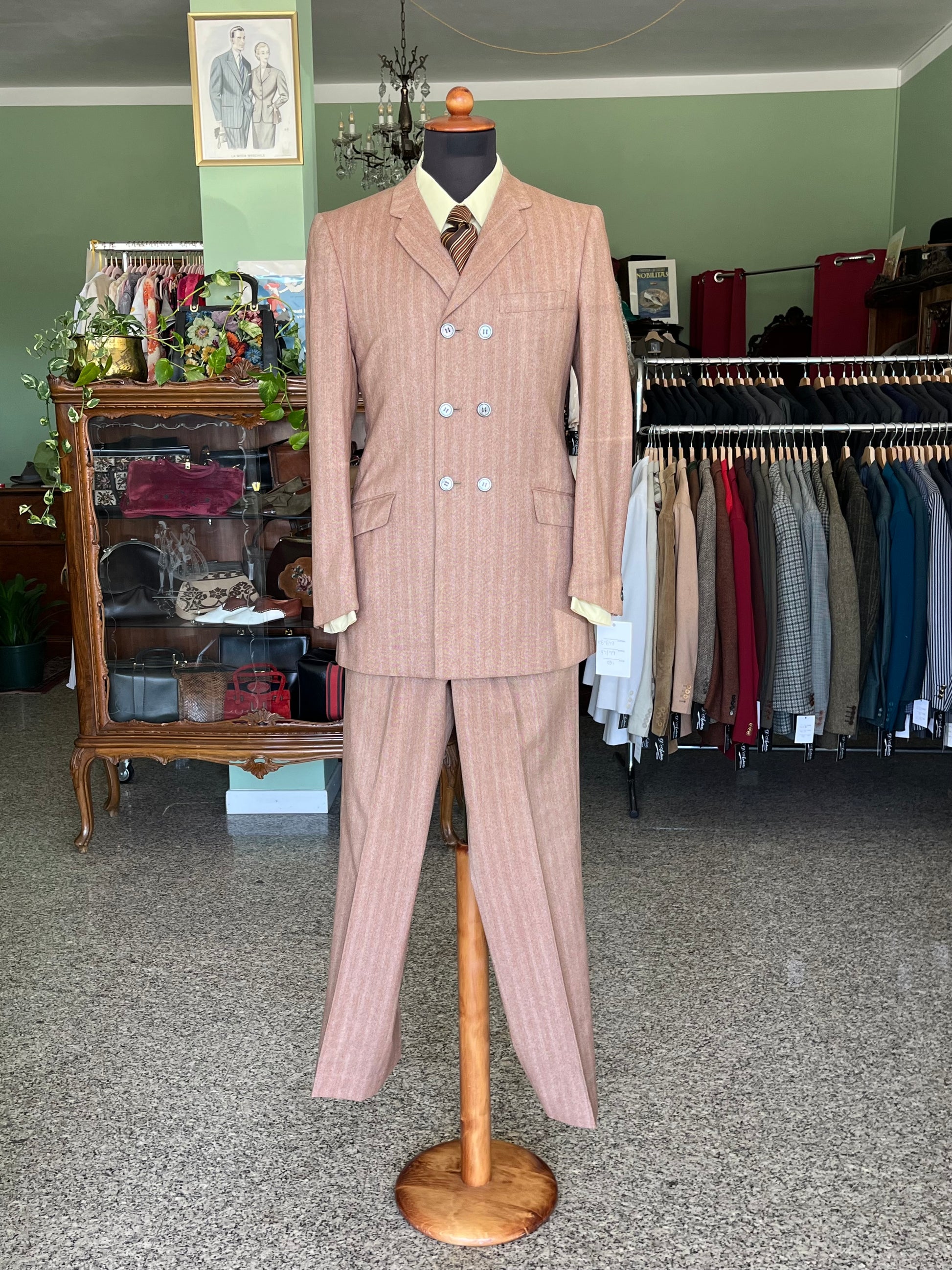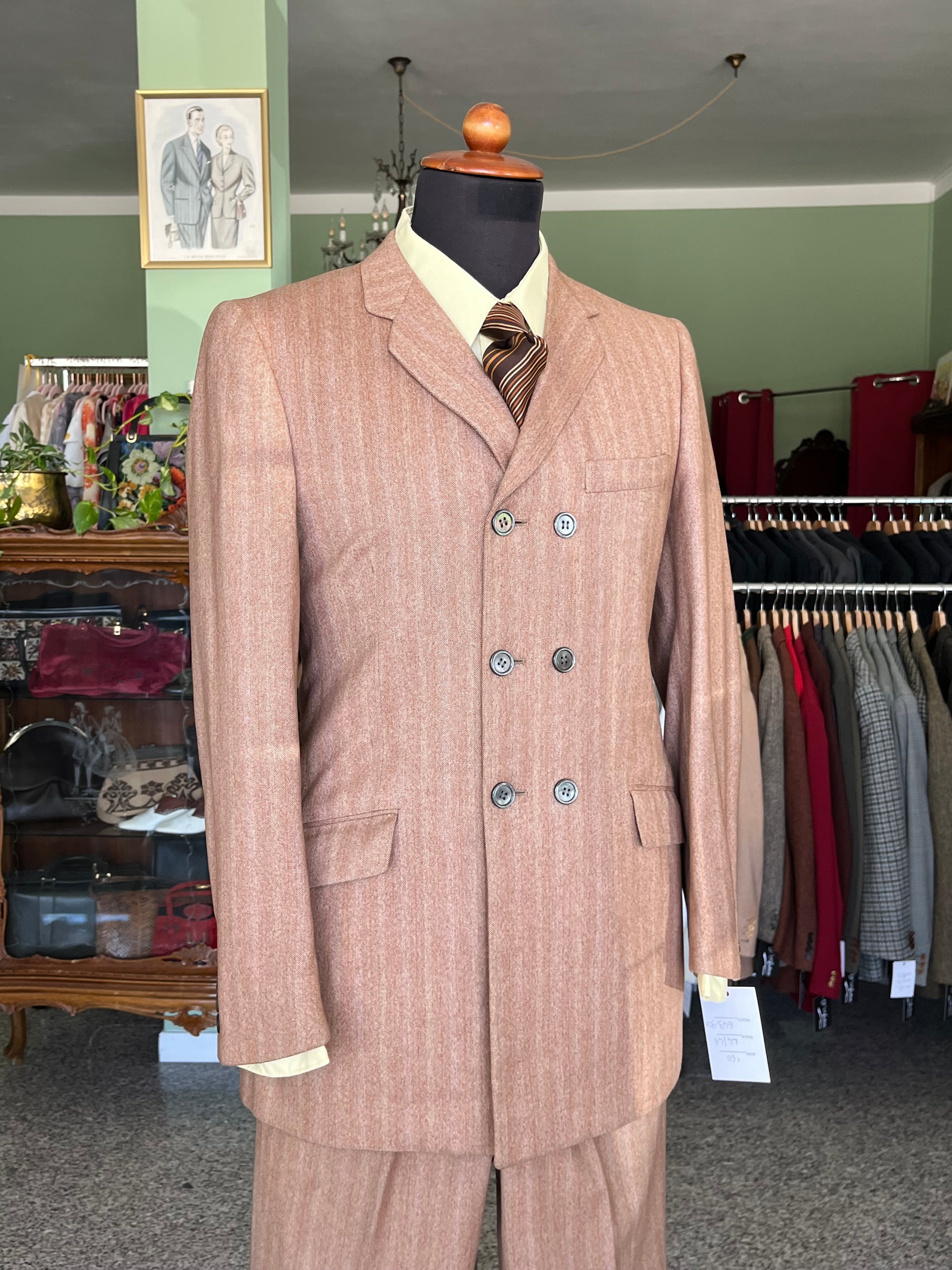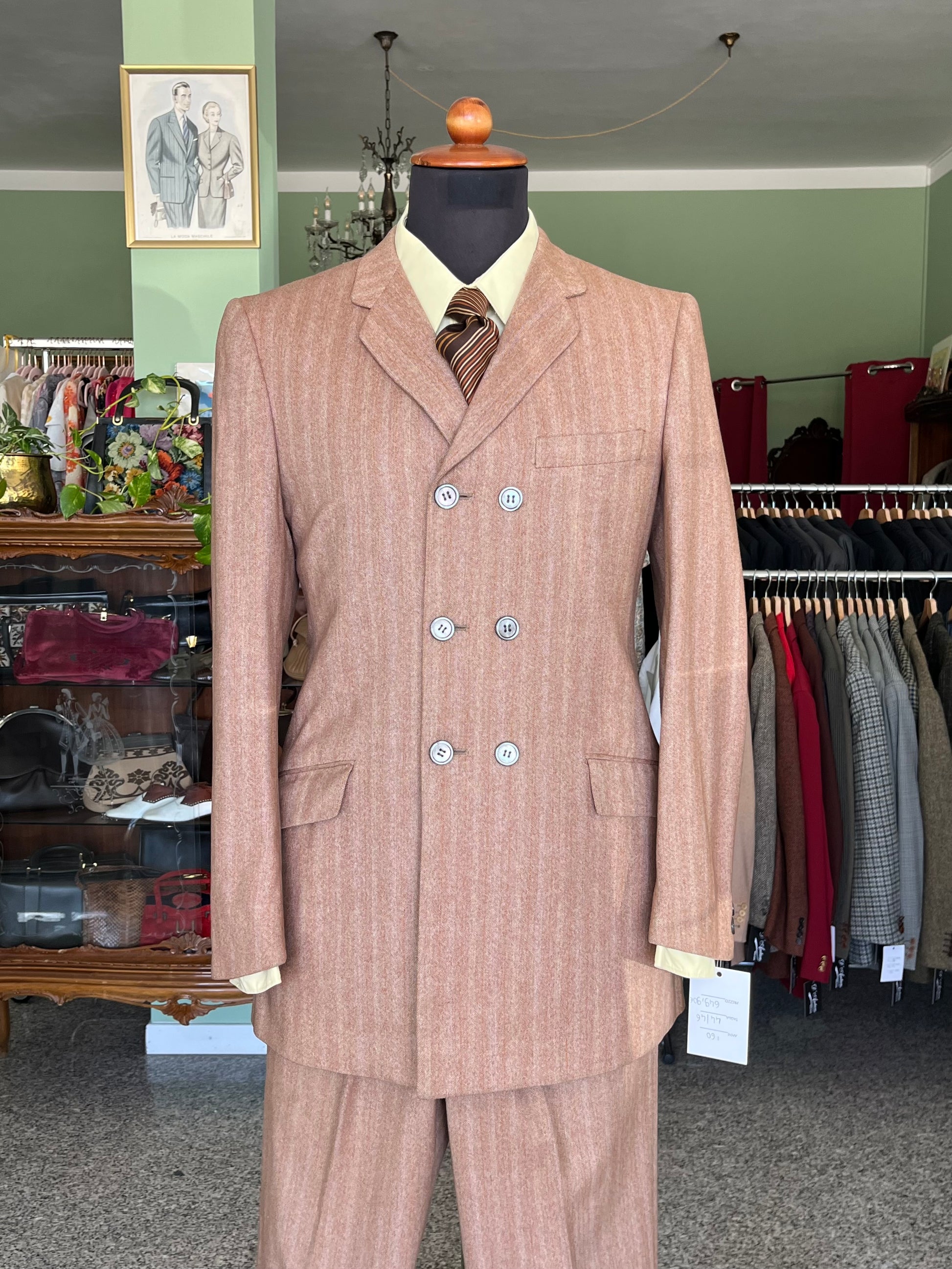Il completo è un esempio dei primissimi esemplari pret-a-porter degli anni ‘60, con le caratteristiche stilistiche dell’epoca ed una rara conformazione dopppiopetto.