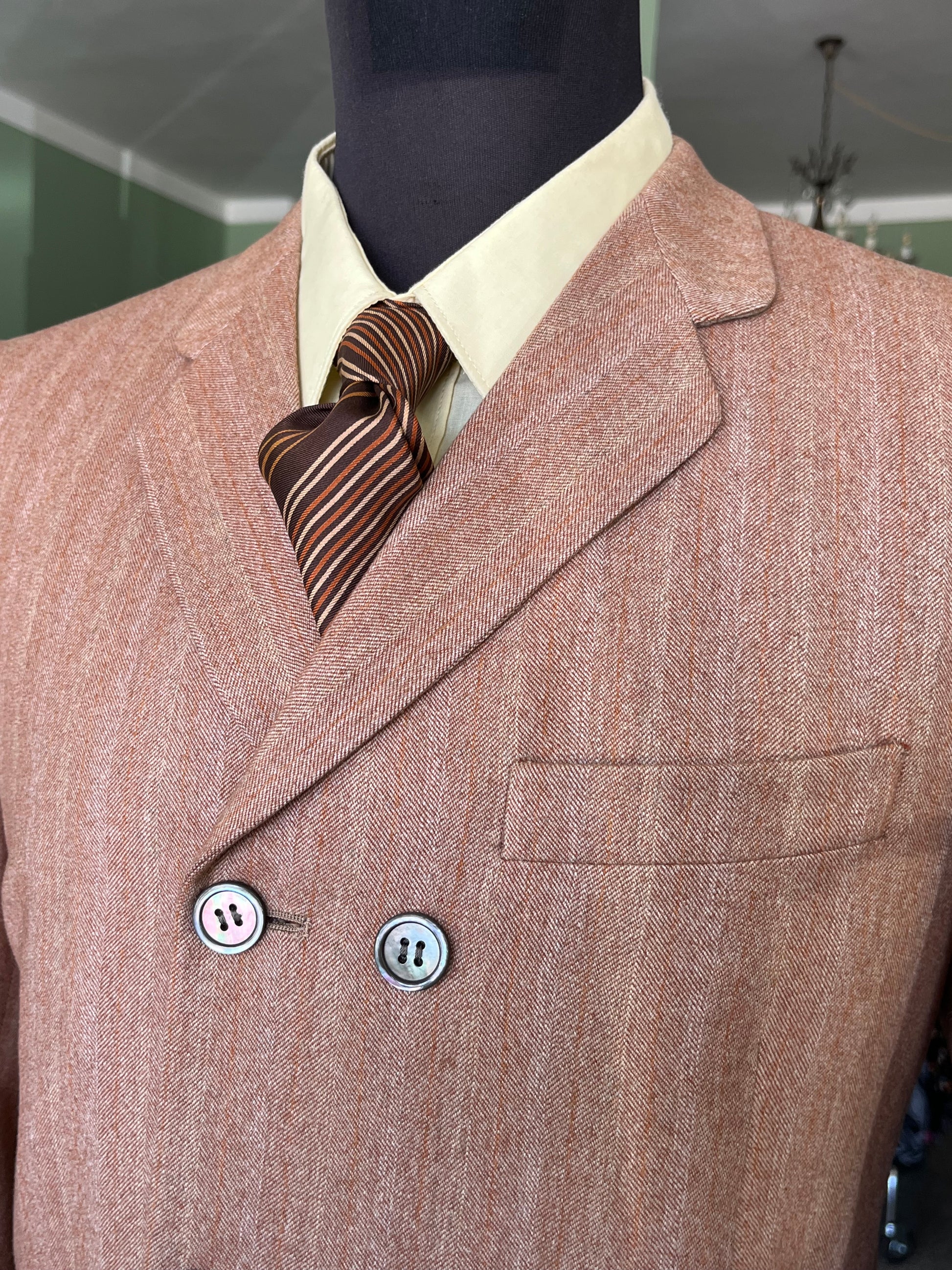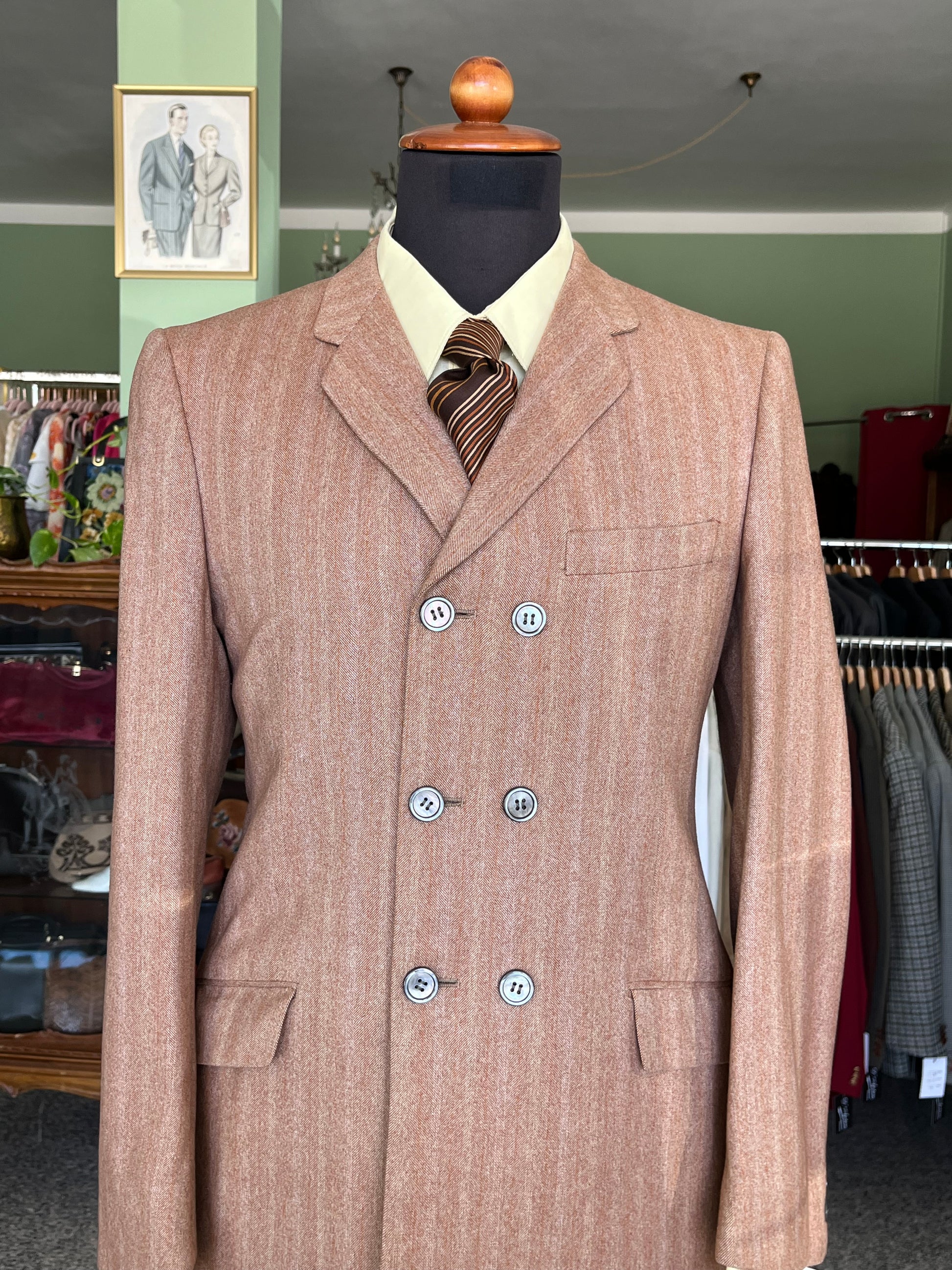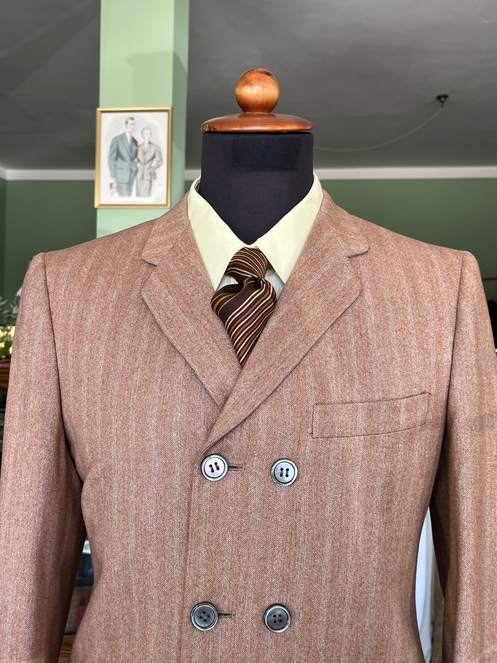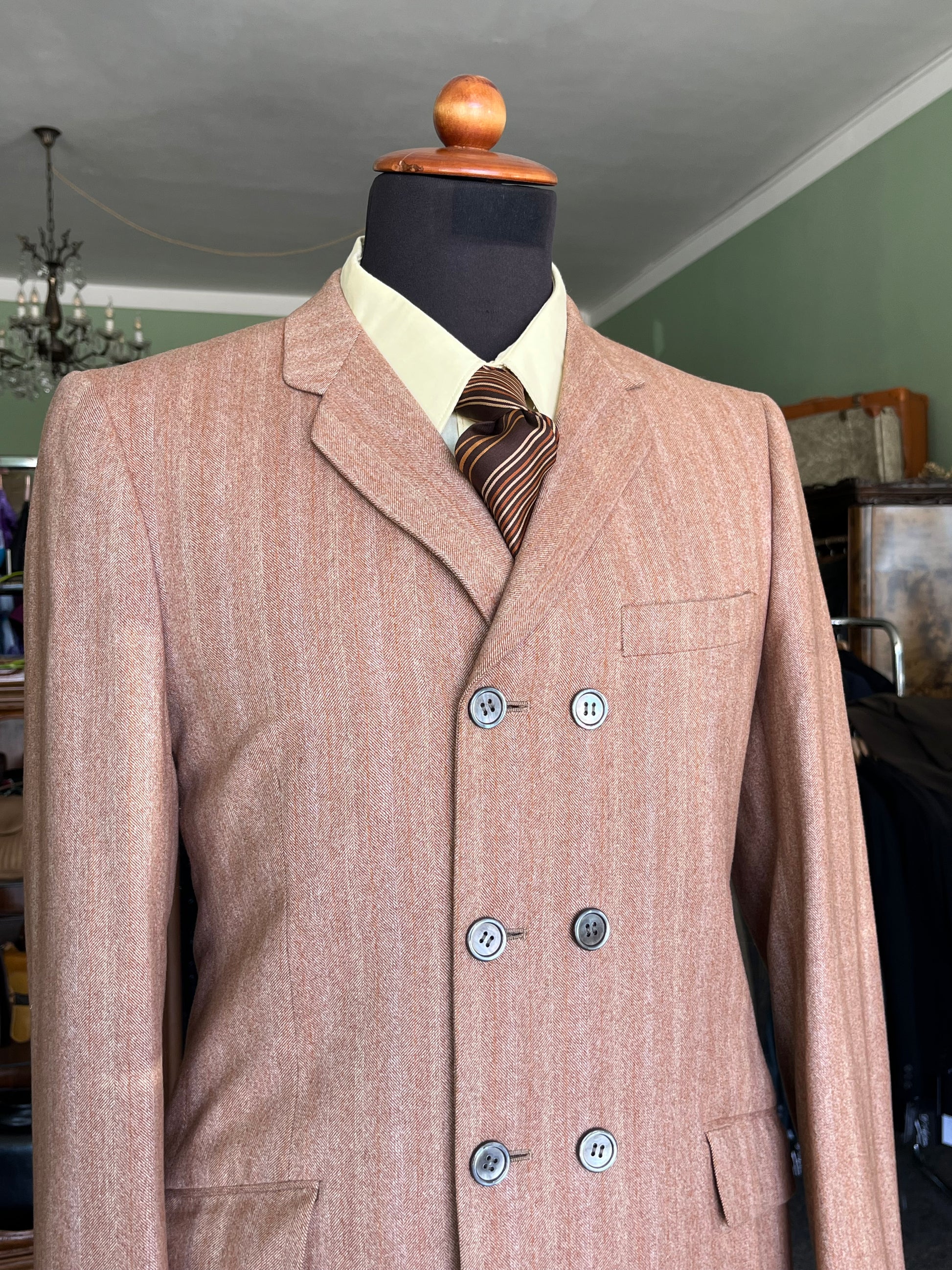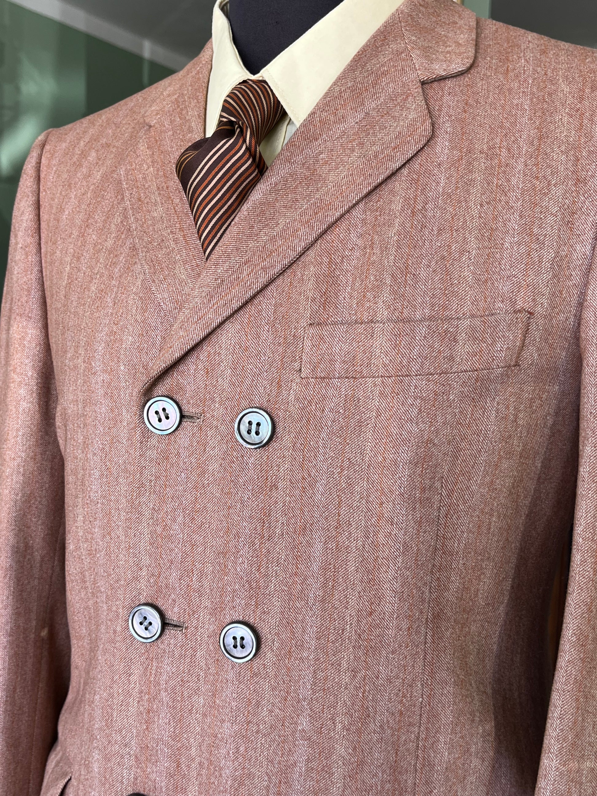 Il completo è un esempio dei primissimi esemplari pret-a-porter degli anni ‘60, con le caratteristiche stilistiche dell’epoca ed una rara conformazione dopppiopetto.