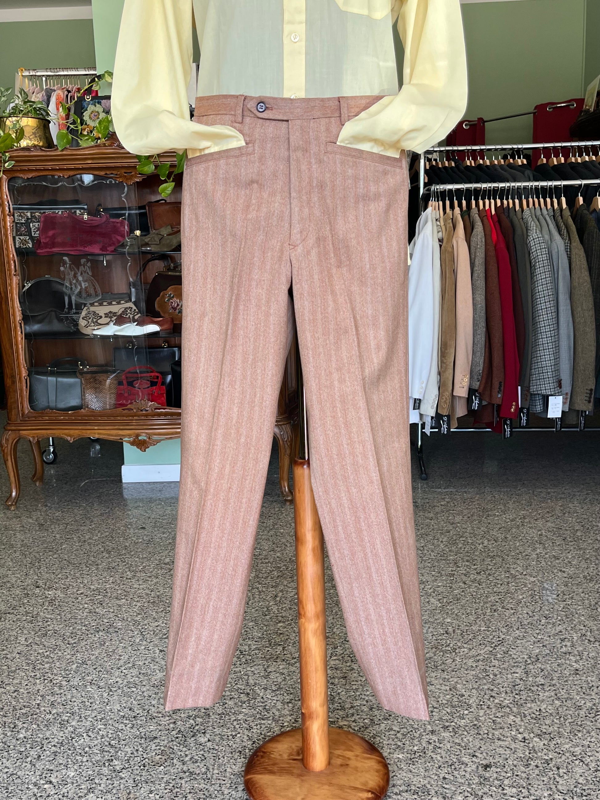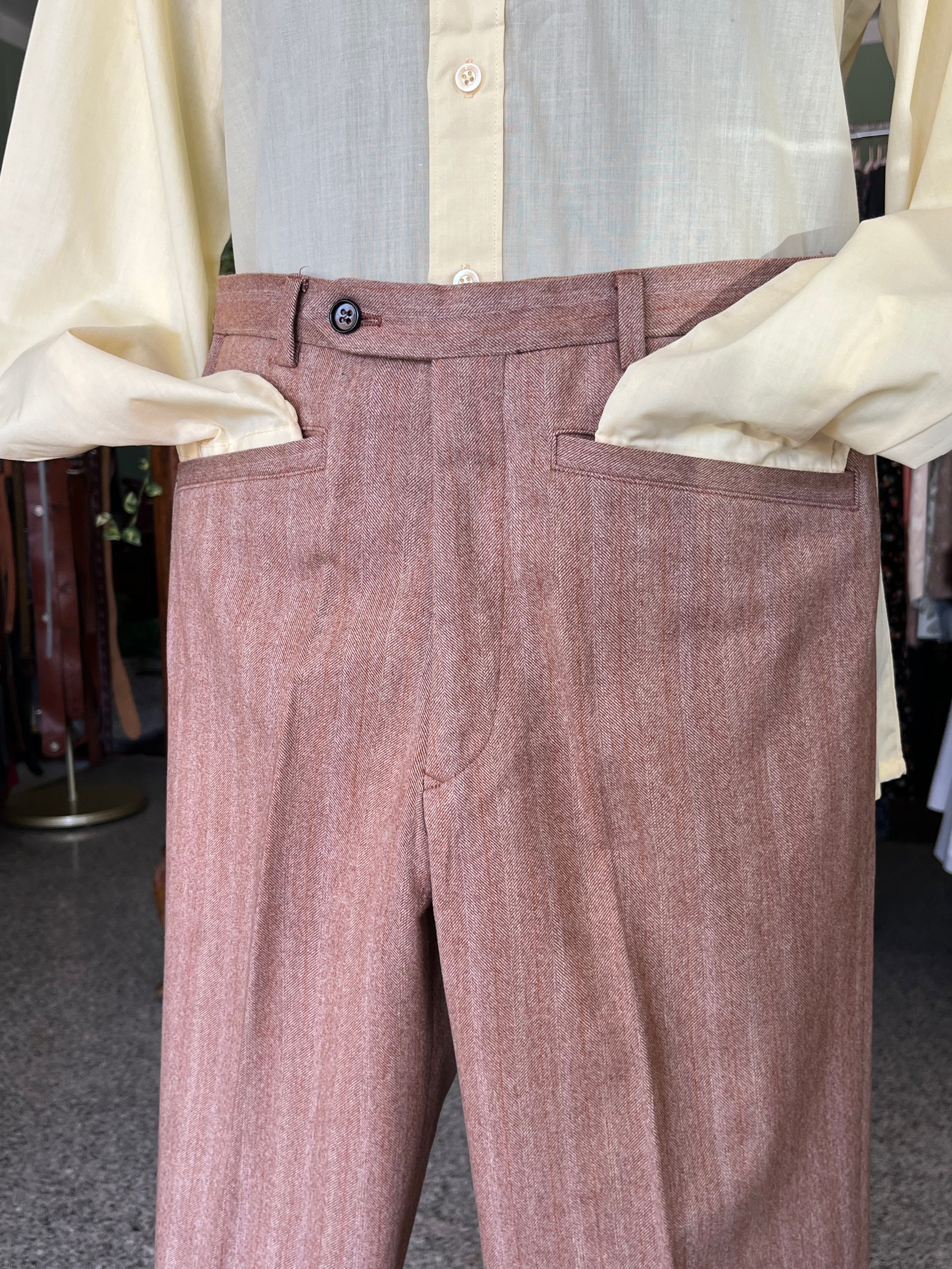 I calzoni hanno un taglio classico, a vita alta, tanche alla carrettiera, taschino da orologio e gamba drotta.