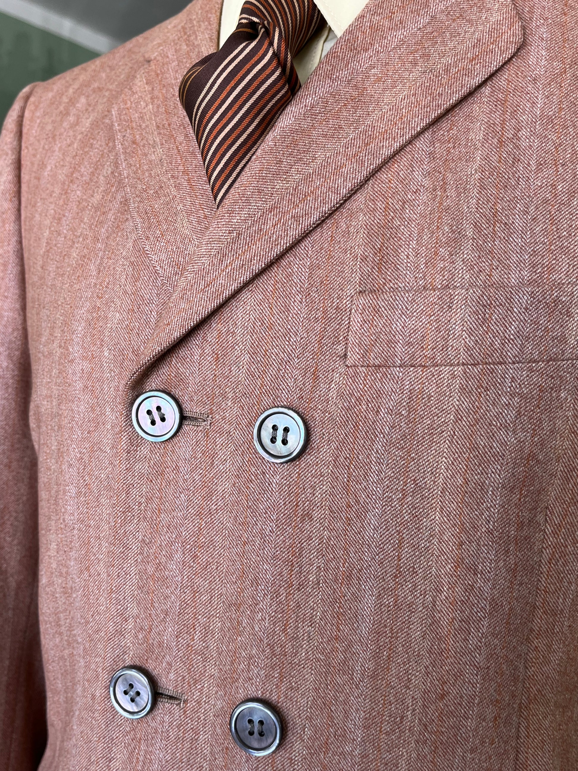 La giacca è un doppiopetto, con abbottonatura 6x3, baveri a dente, tasche a pattina di sbieco e faldone sul retro.