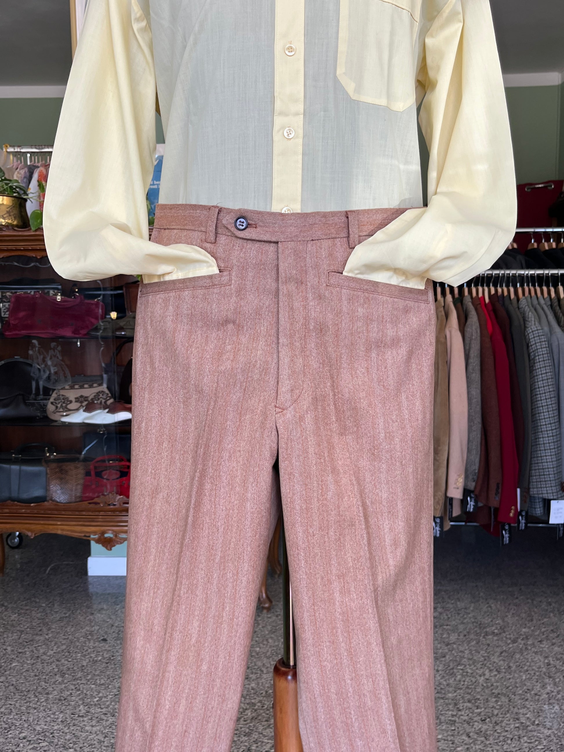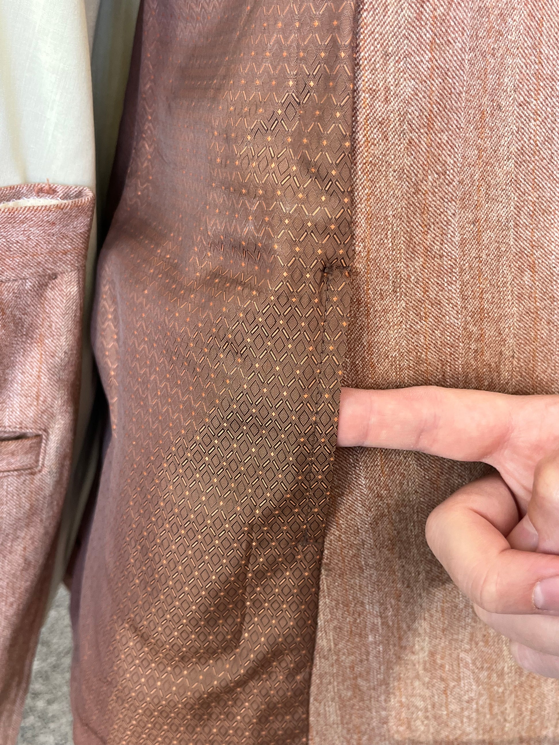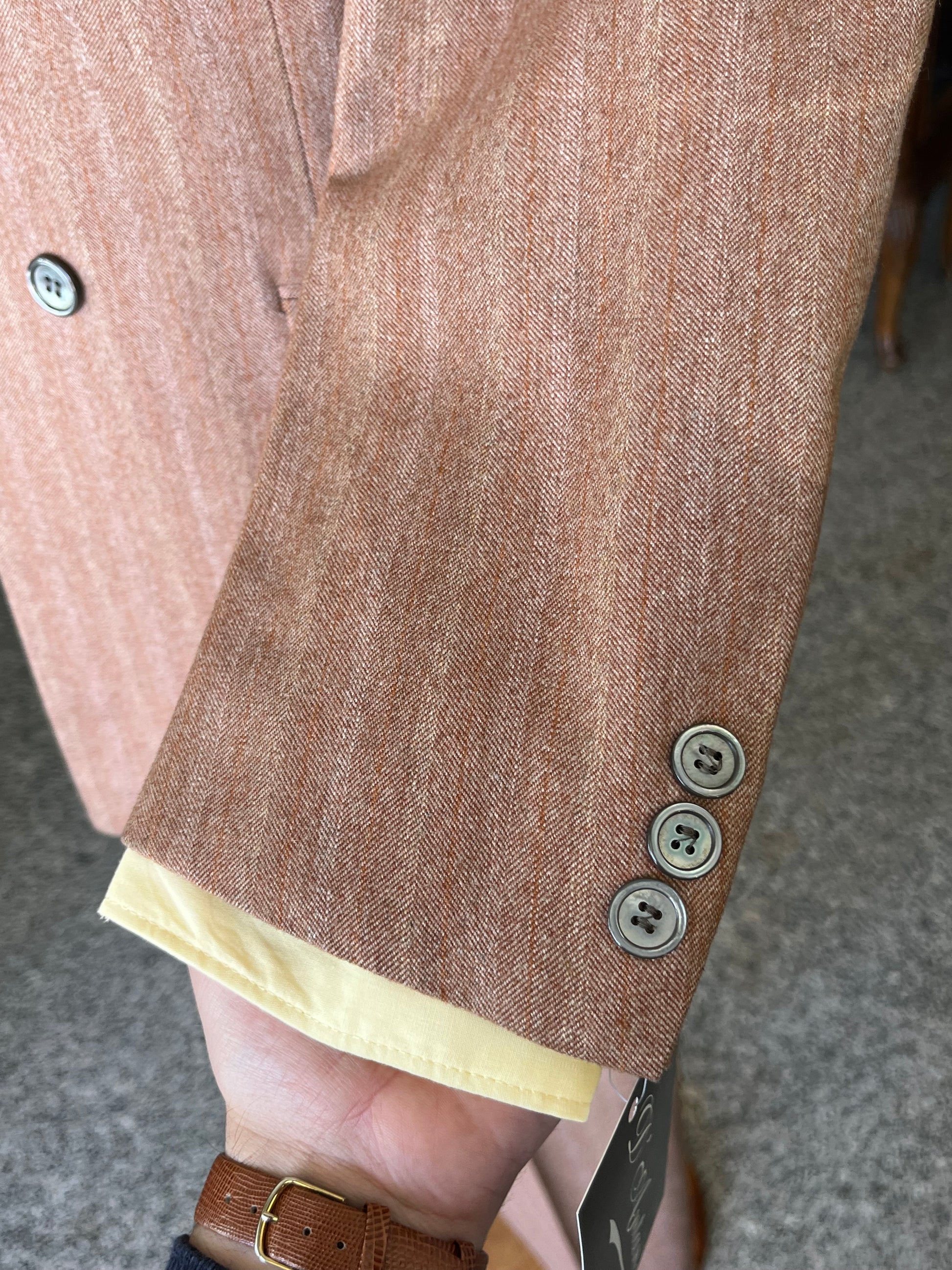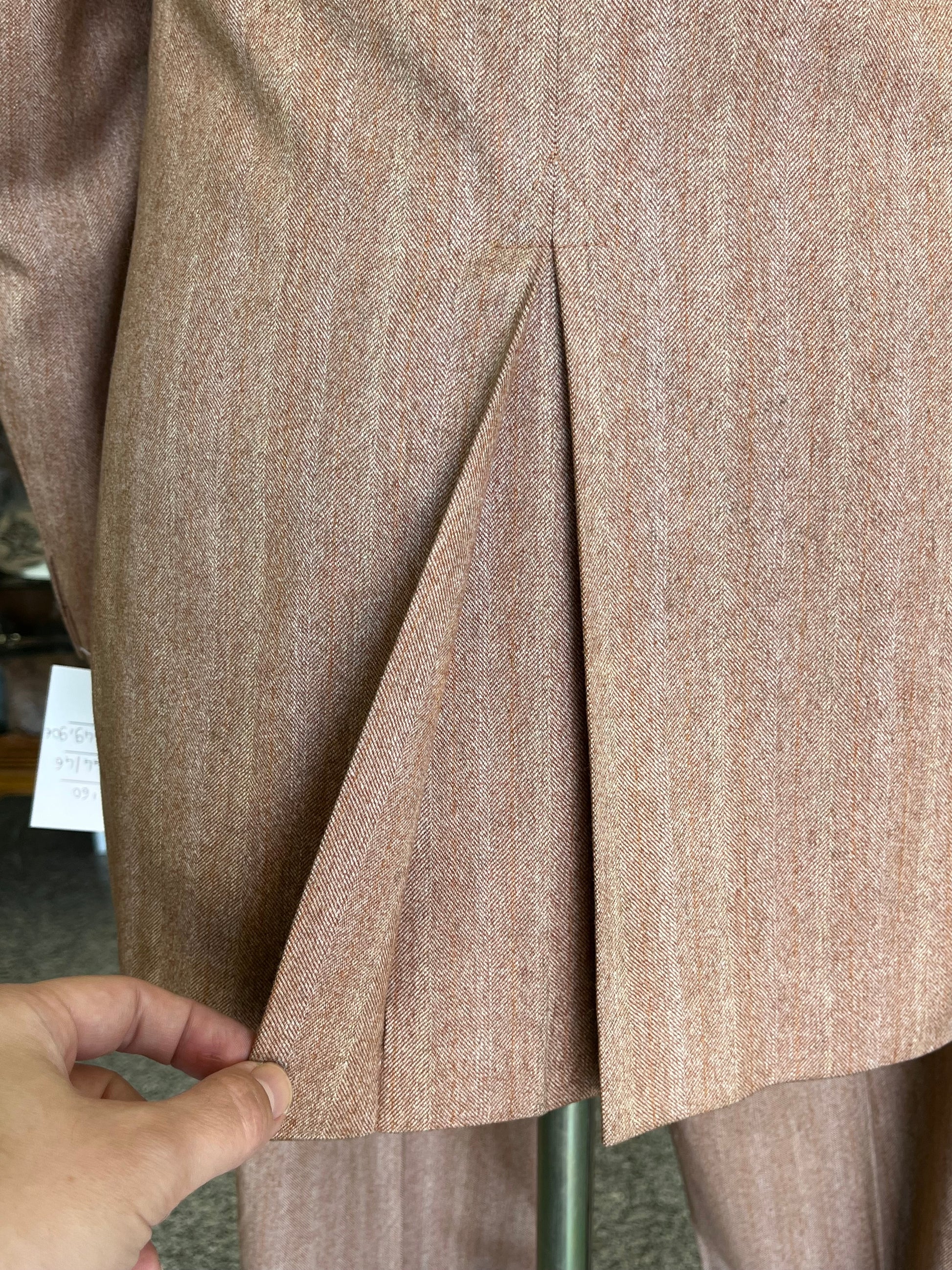 Il tessuto è 100% pura lana, tipo tweed, di un particolarissimo color aranciato.