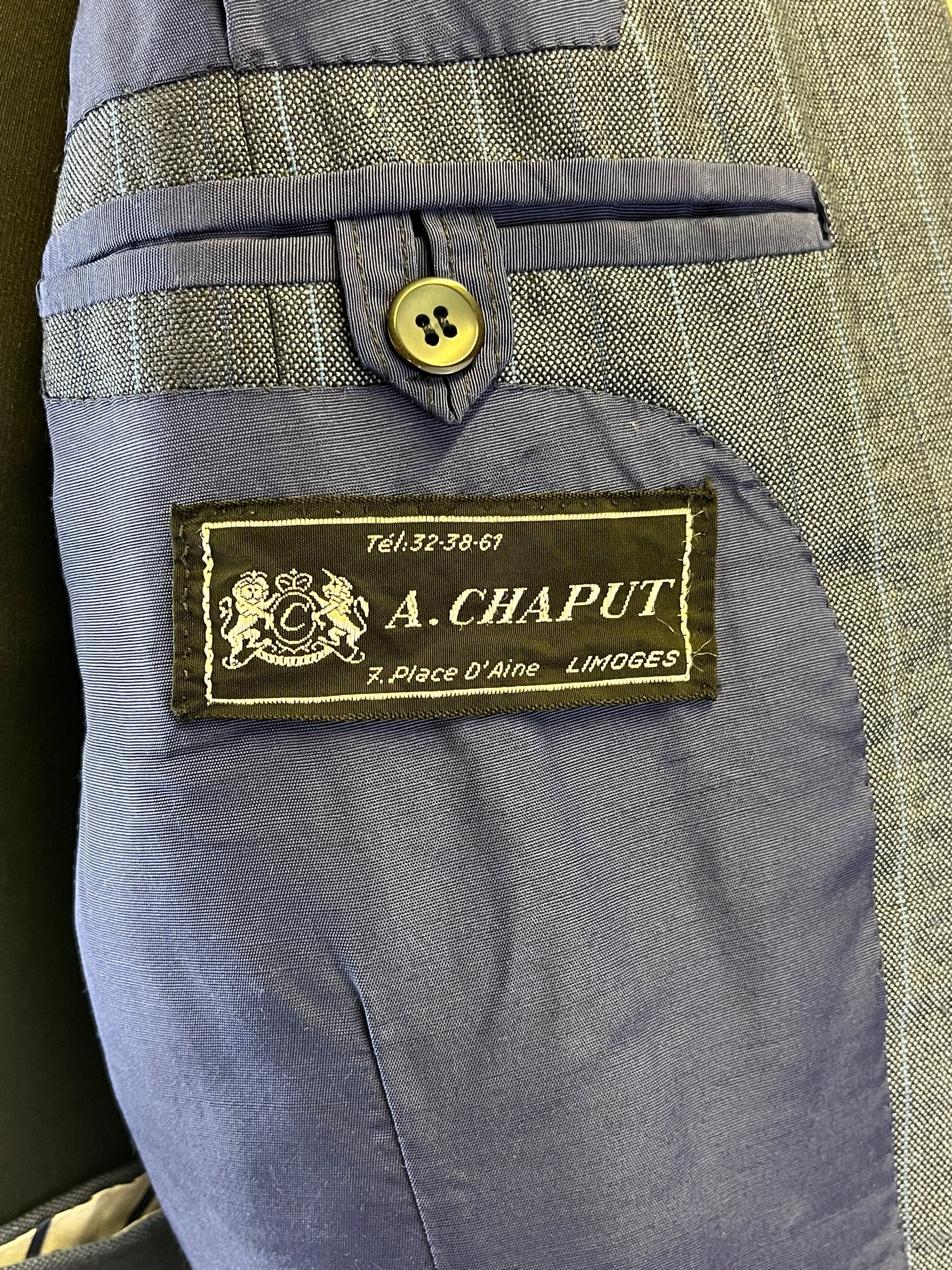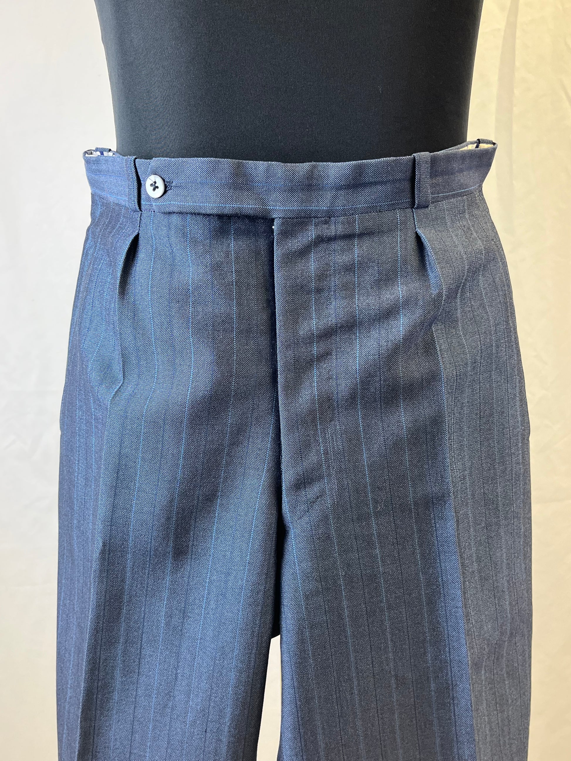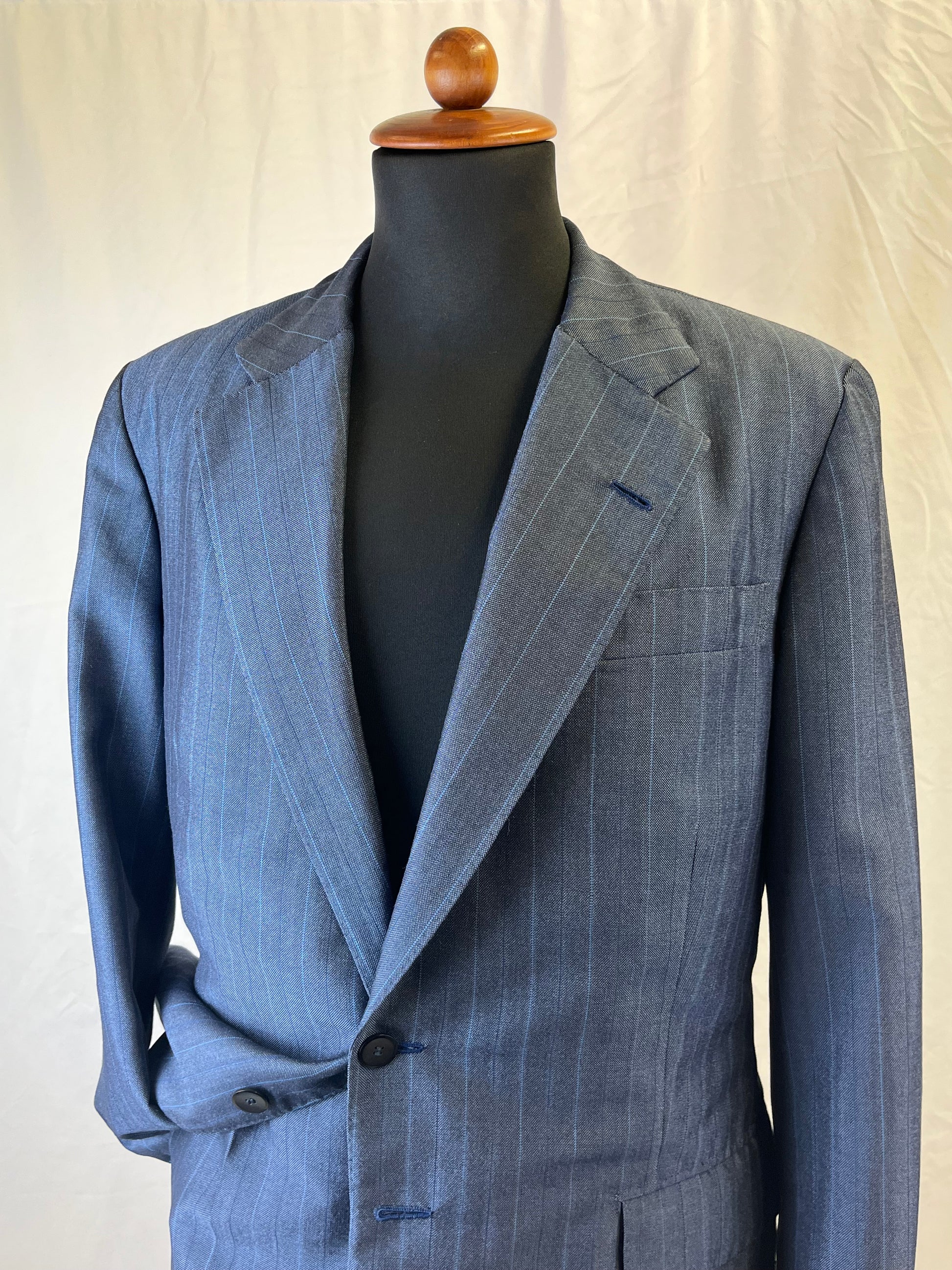 Il tessuto è un misto fresco di lana e seta (che gli conferisce lucentezza, di color avio, gessato di celeste. Ideale per la mezza stagione.