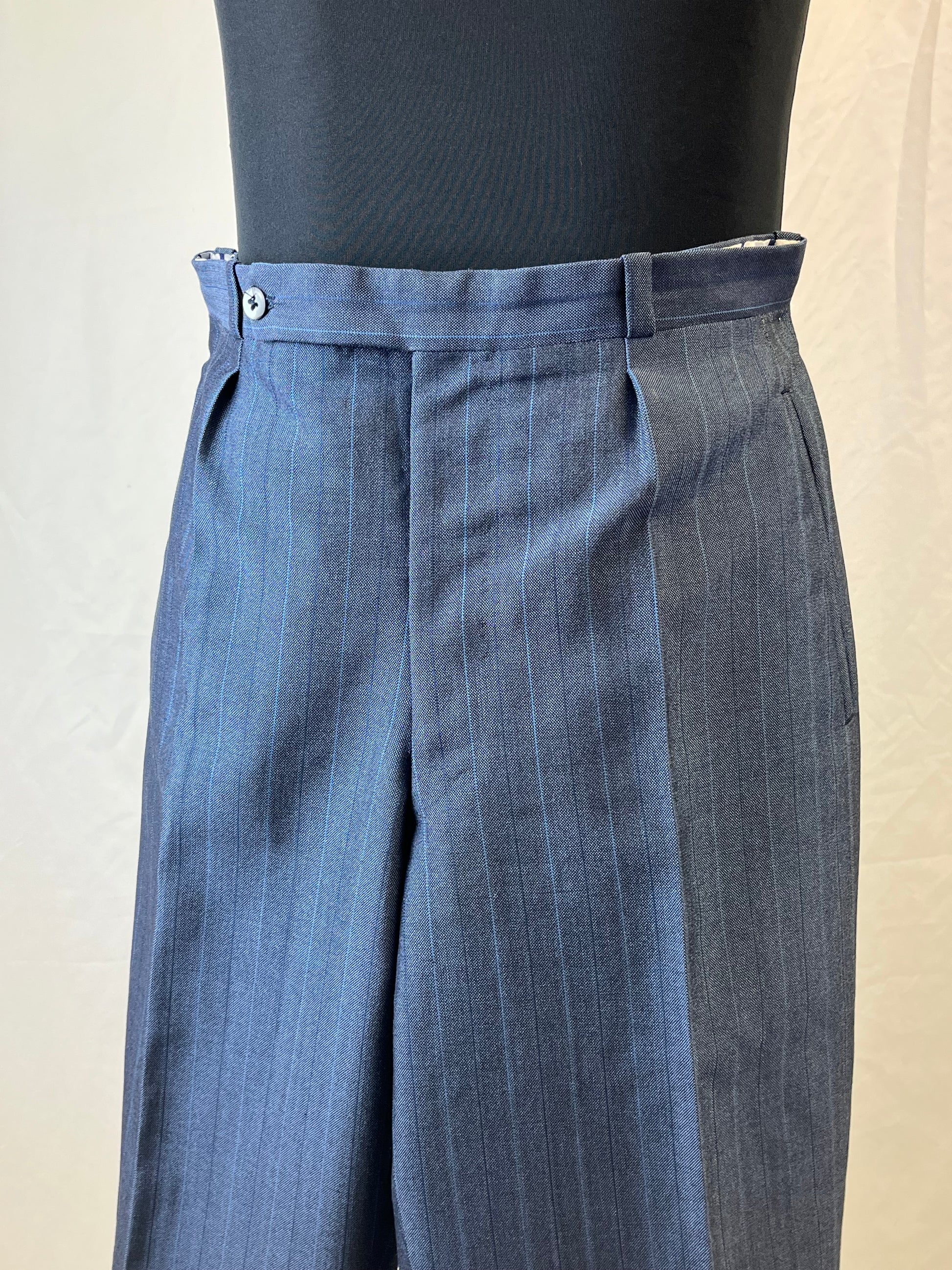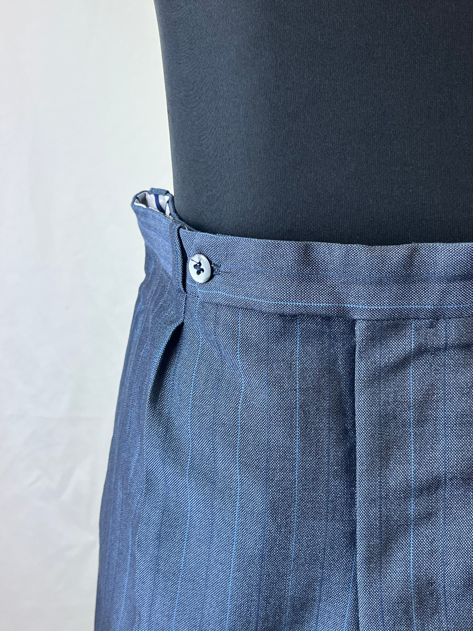 I calzoni hanno un taglio classico, a vita alta, con piega singola all’inglese in vita e gamba dritta.