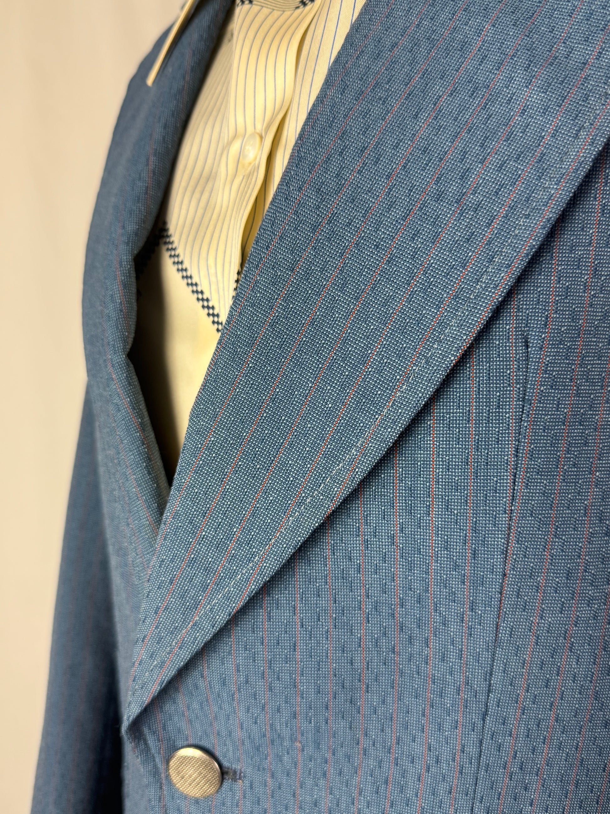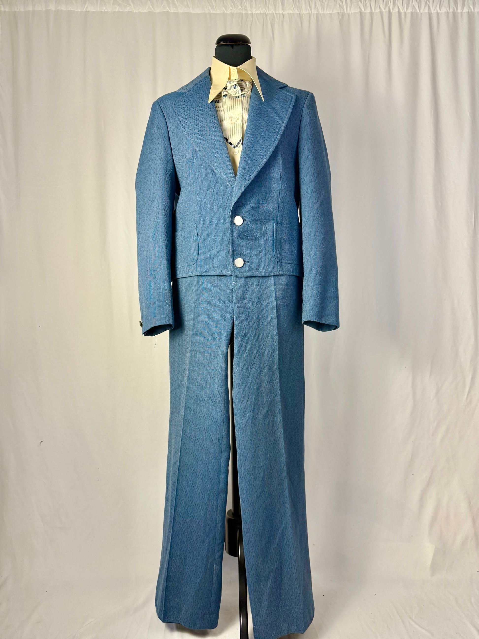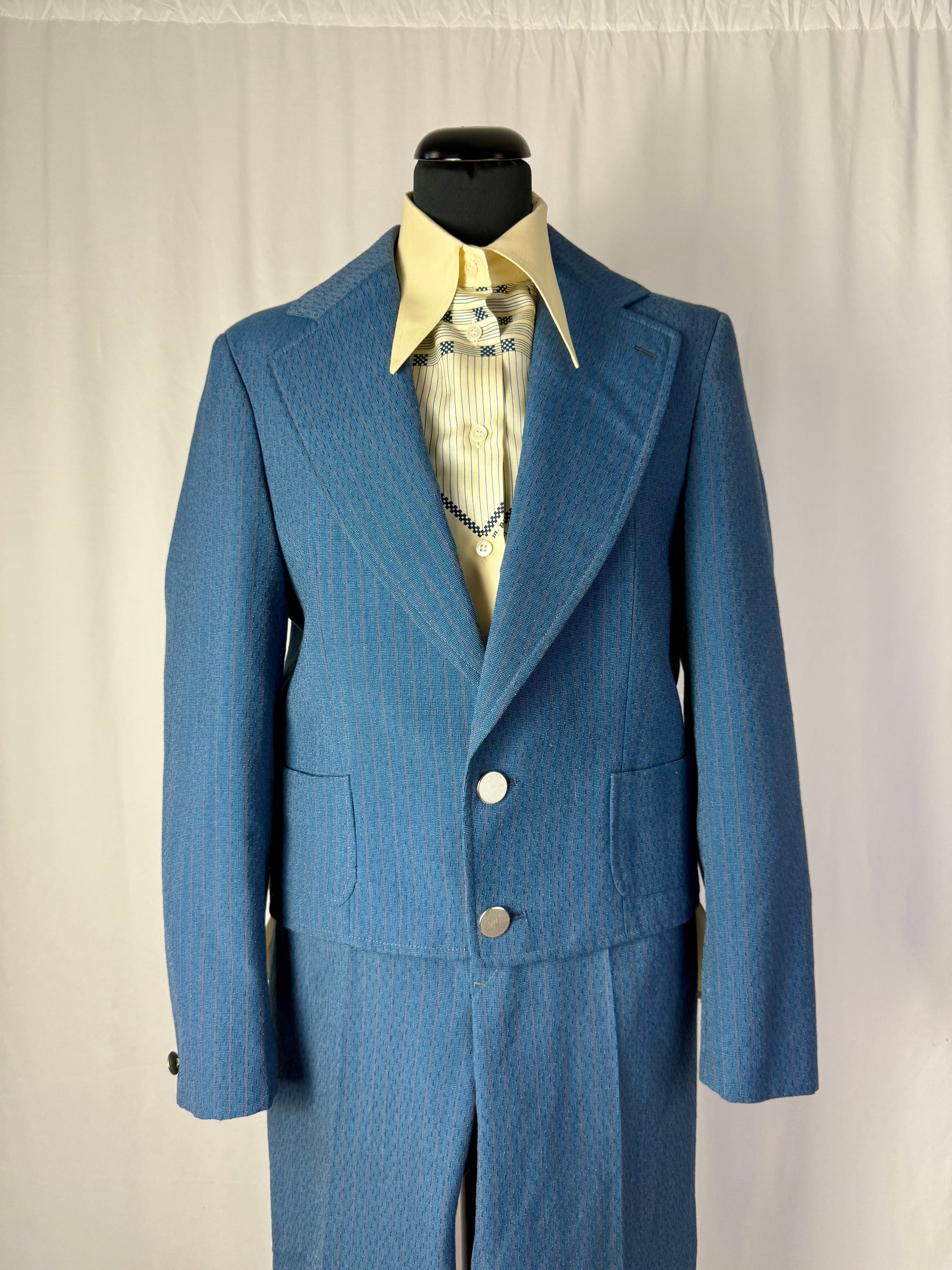 Questo completo anni ’70 esprime la disinvoltura e il fascino rétro tipici del decennio, con un tocco di eleganza sartoriale. La giacca corta, dal taglio pulito e linee leggermente svasate, si abbina perfettamente al pantalone a vita media e fondo svasato, che slancia la figura e richiama l’estetica libera e sofisticata di quegli anni. Il Tessuto è blu cobalto dalla mano compatta.