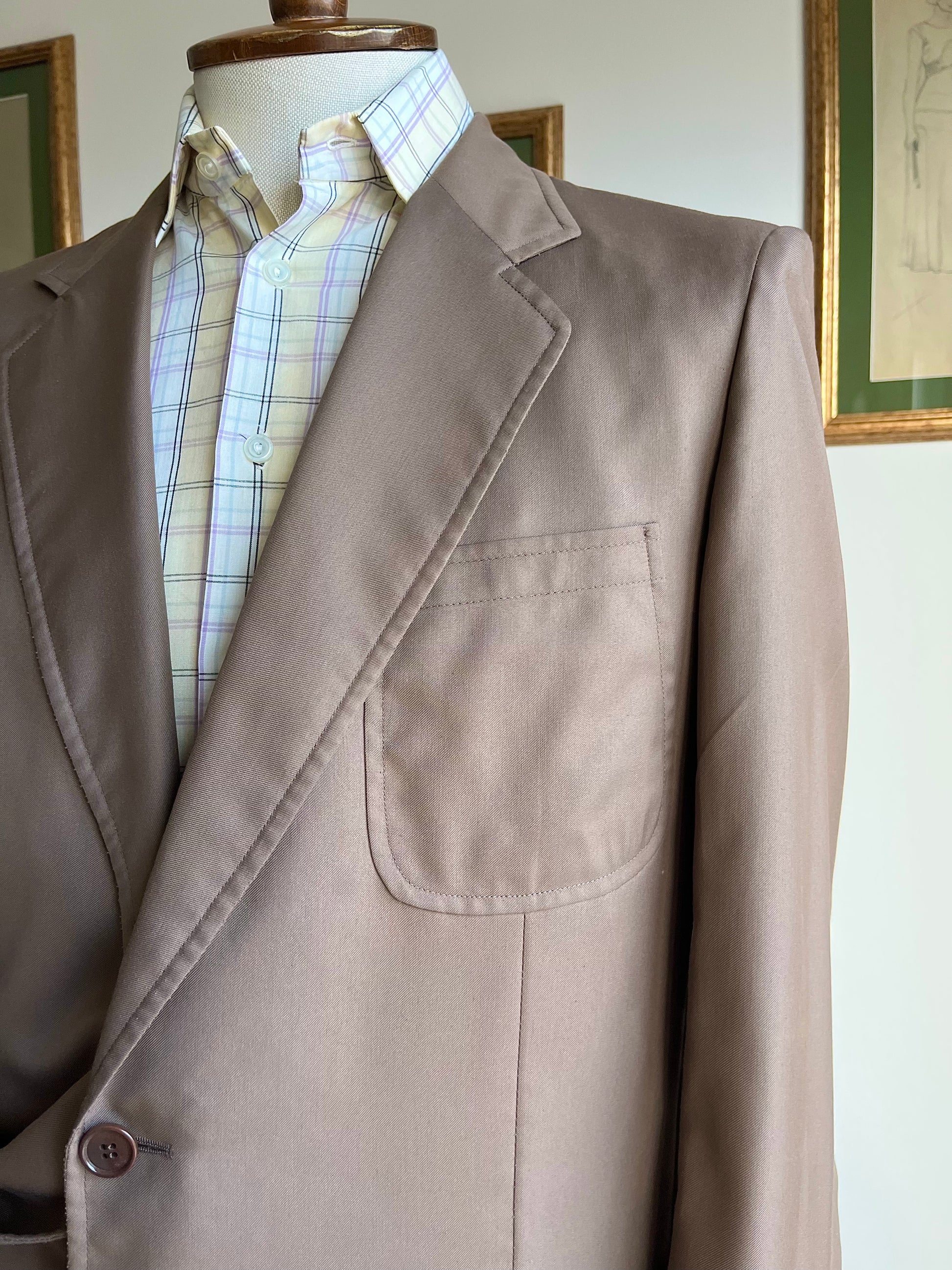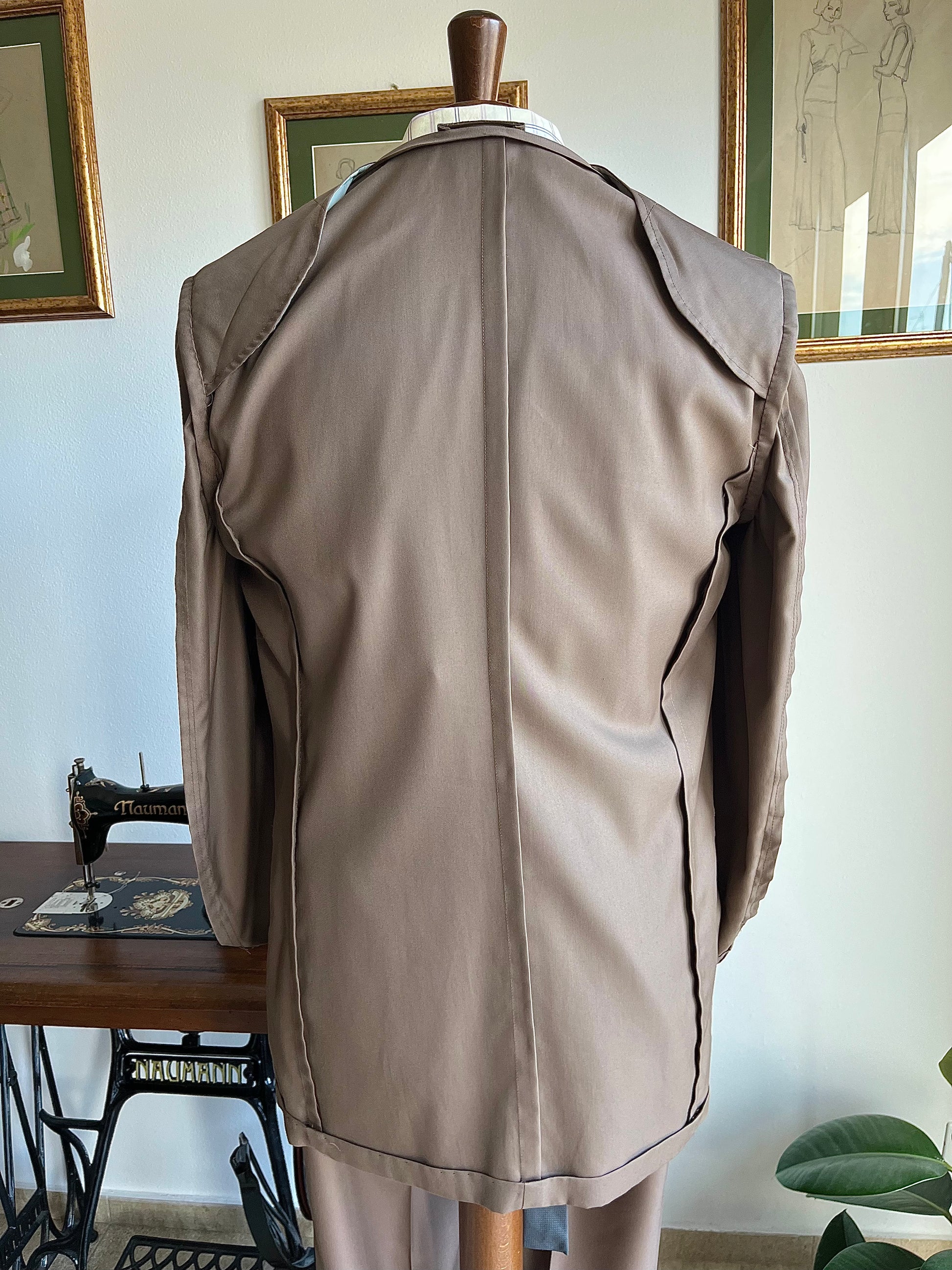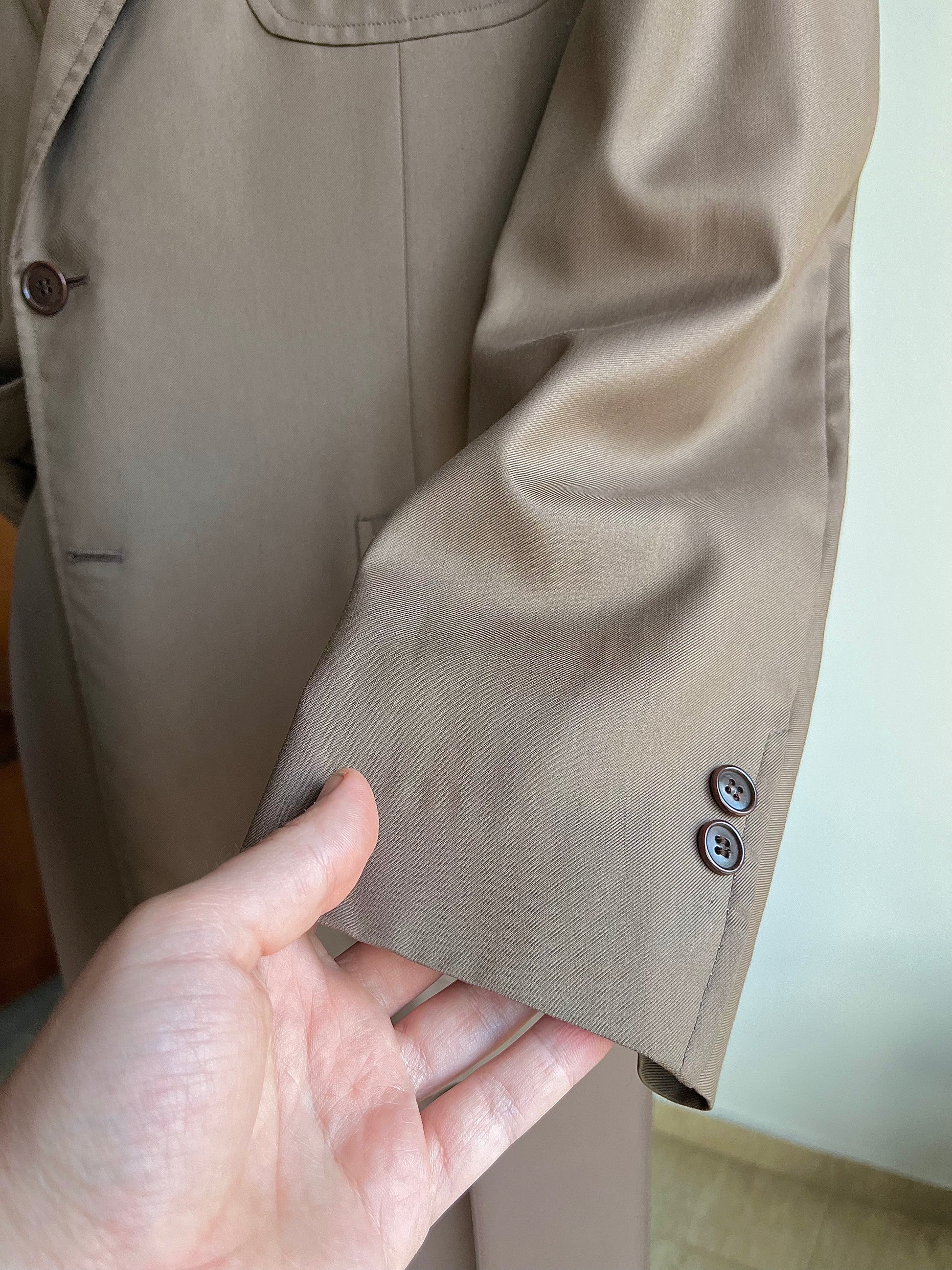La giacca è un monopetto, due bottoni, baveri a dente, tasche a topa e nessuno spacco sul retro. Si presenta come sfoderata.