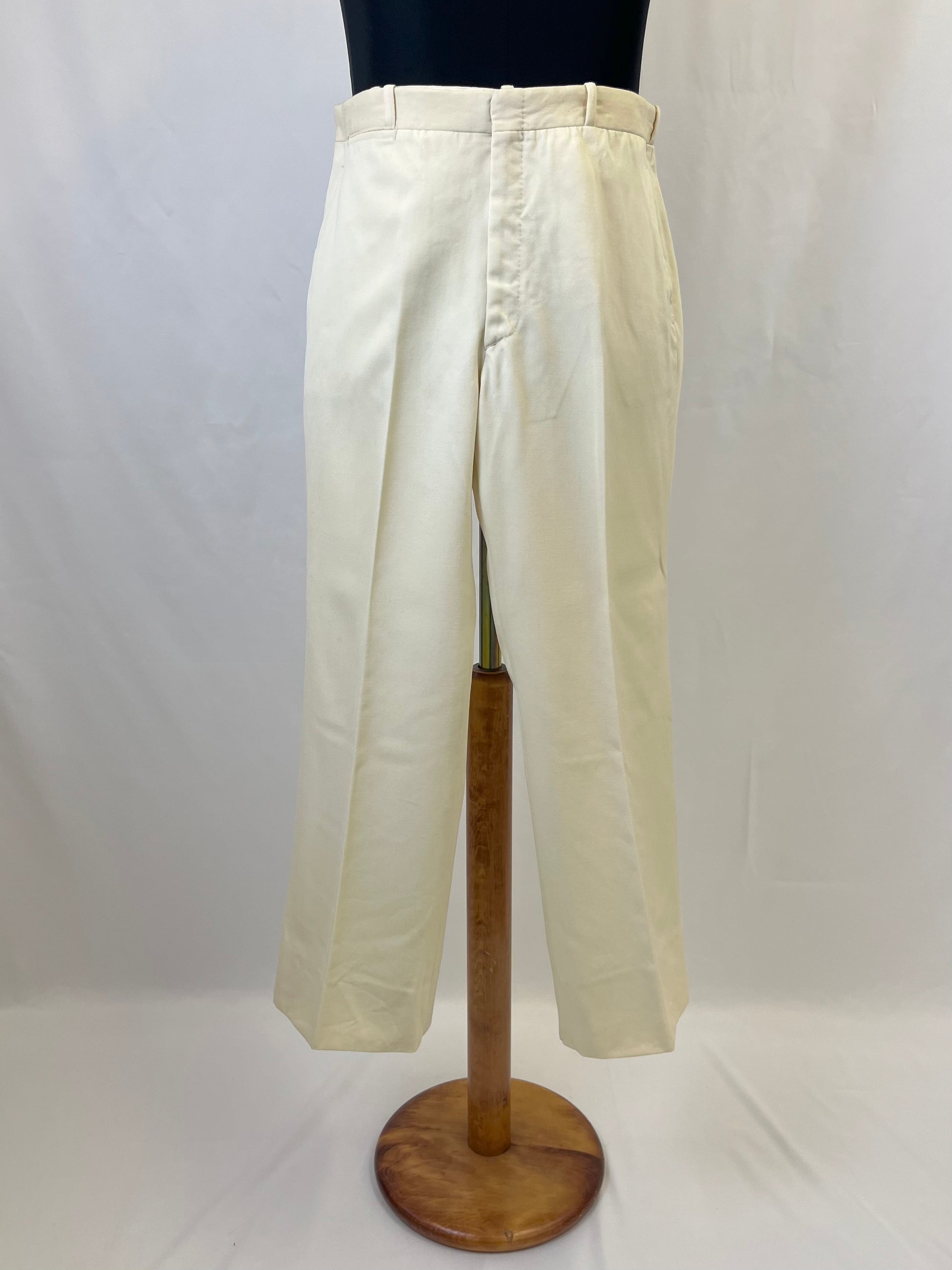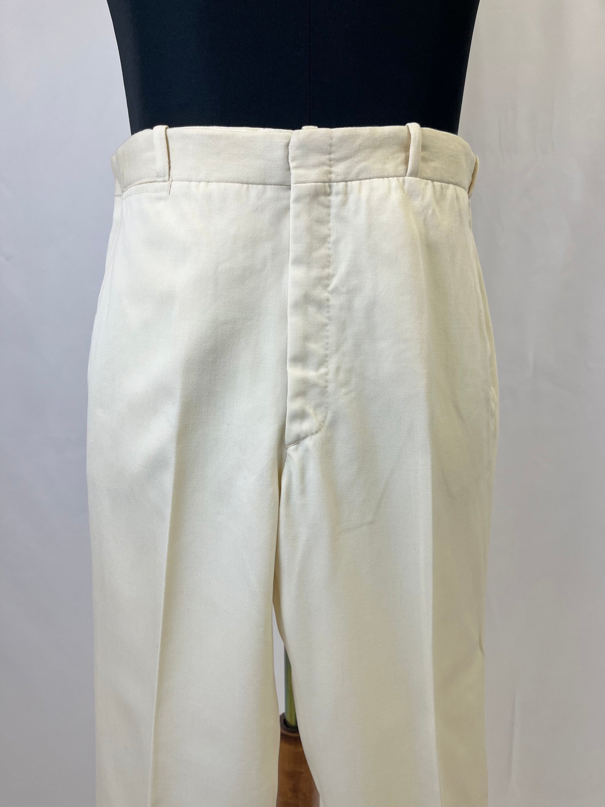 I calzoni hanno un taglio leggermente svasato, con vita alta e taschino da orologio.