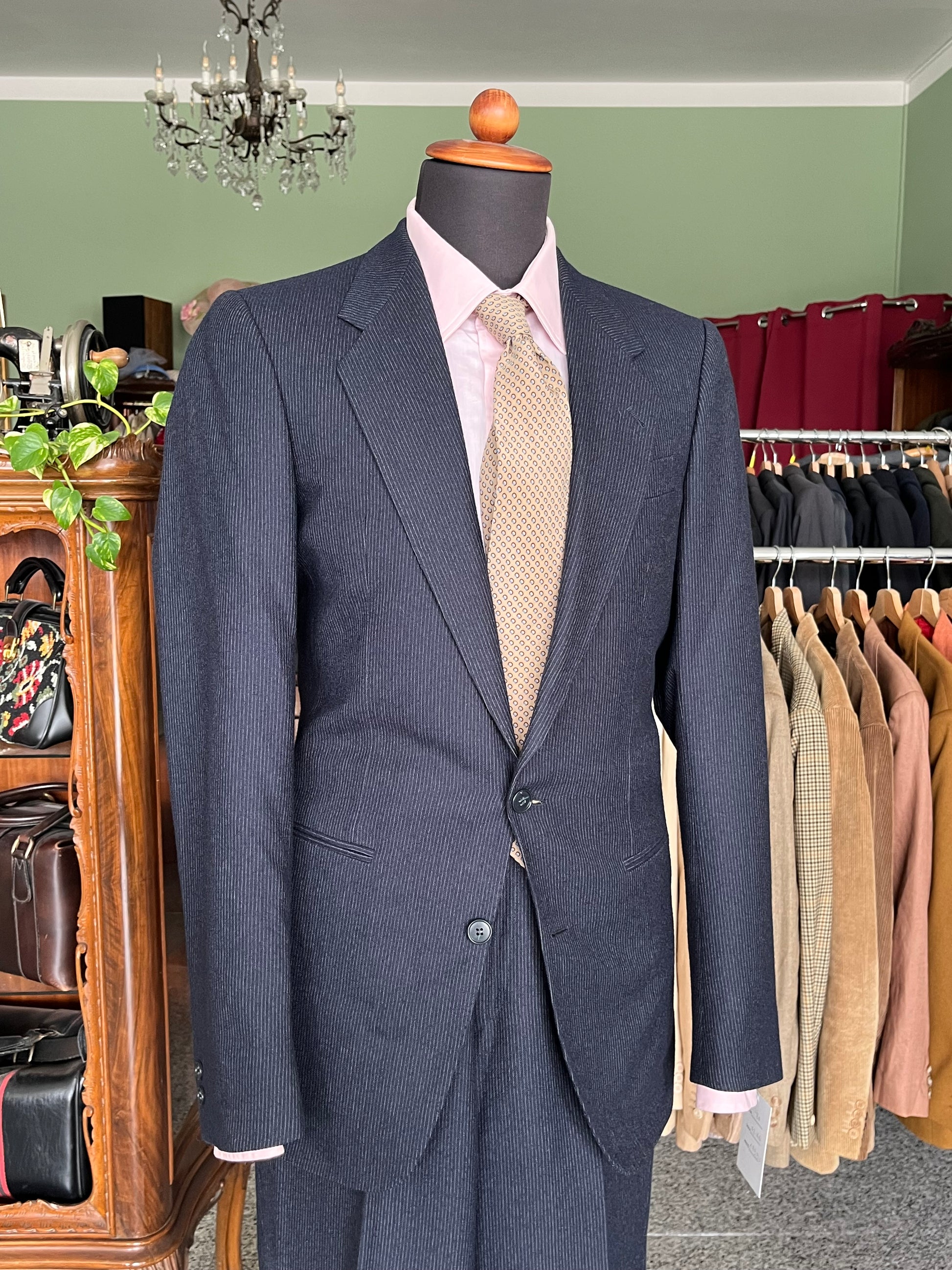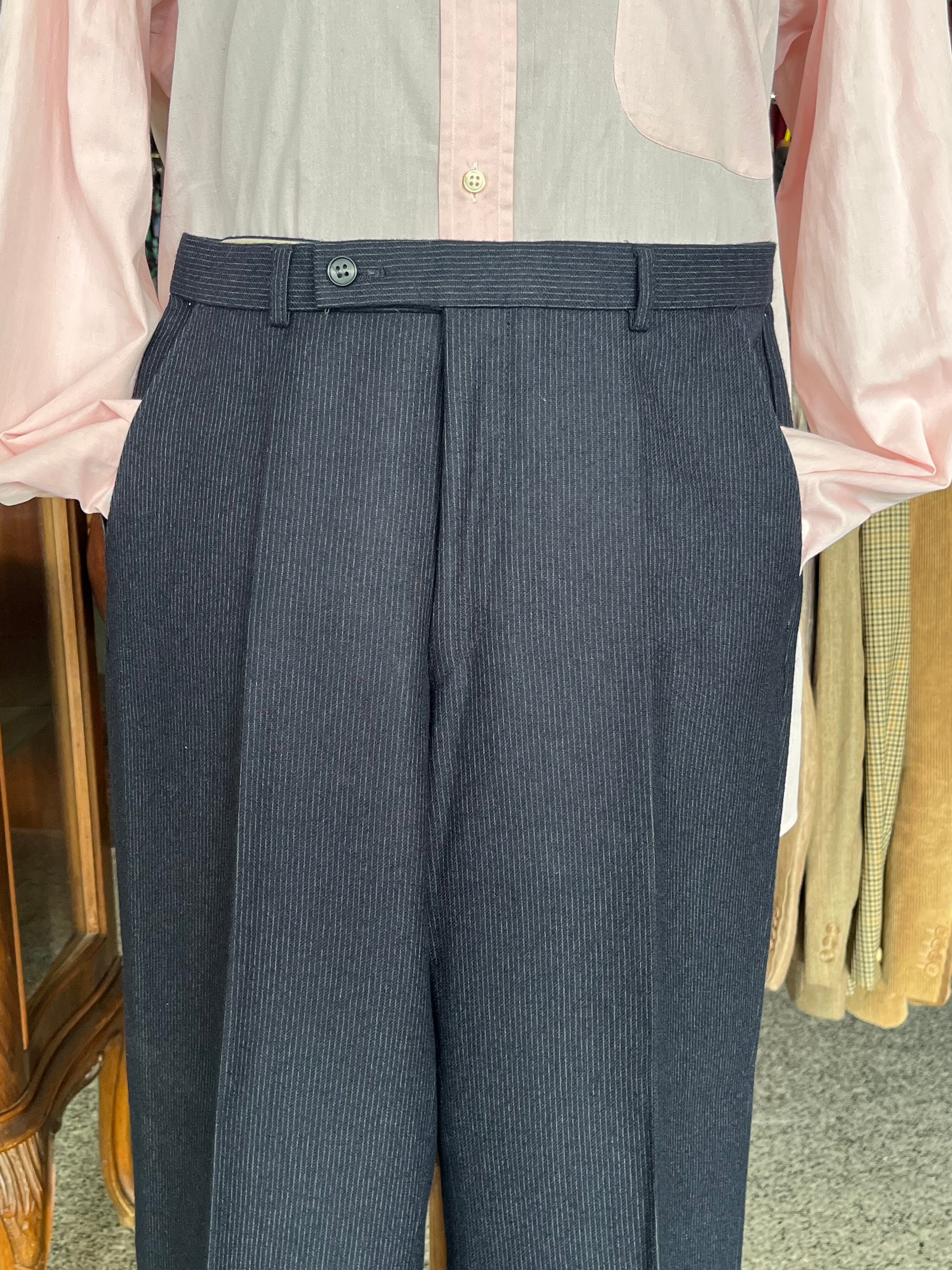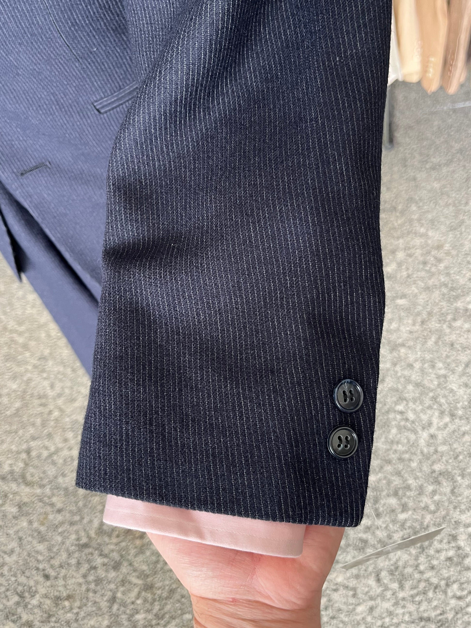 Il tessuto è una pura flanella di lana, blu notte gessato.