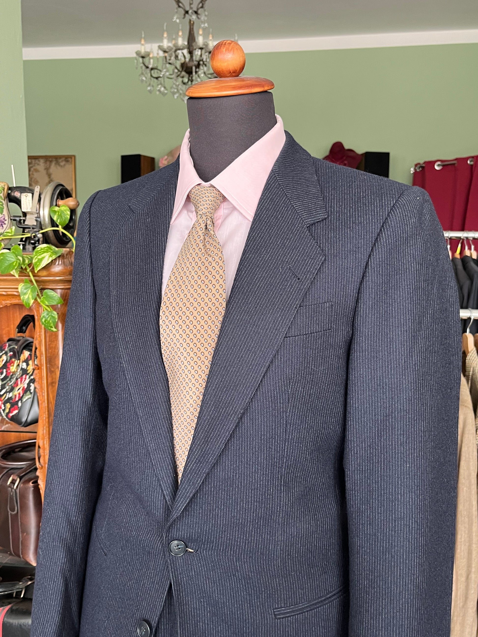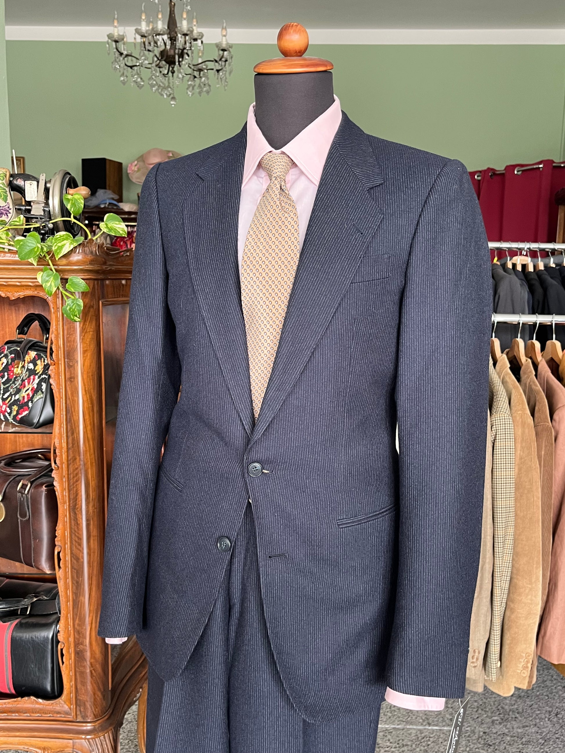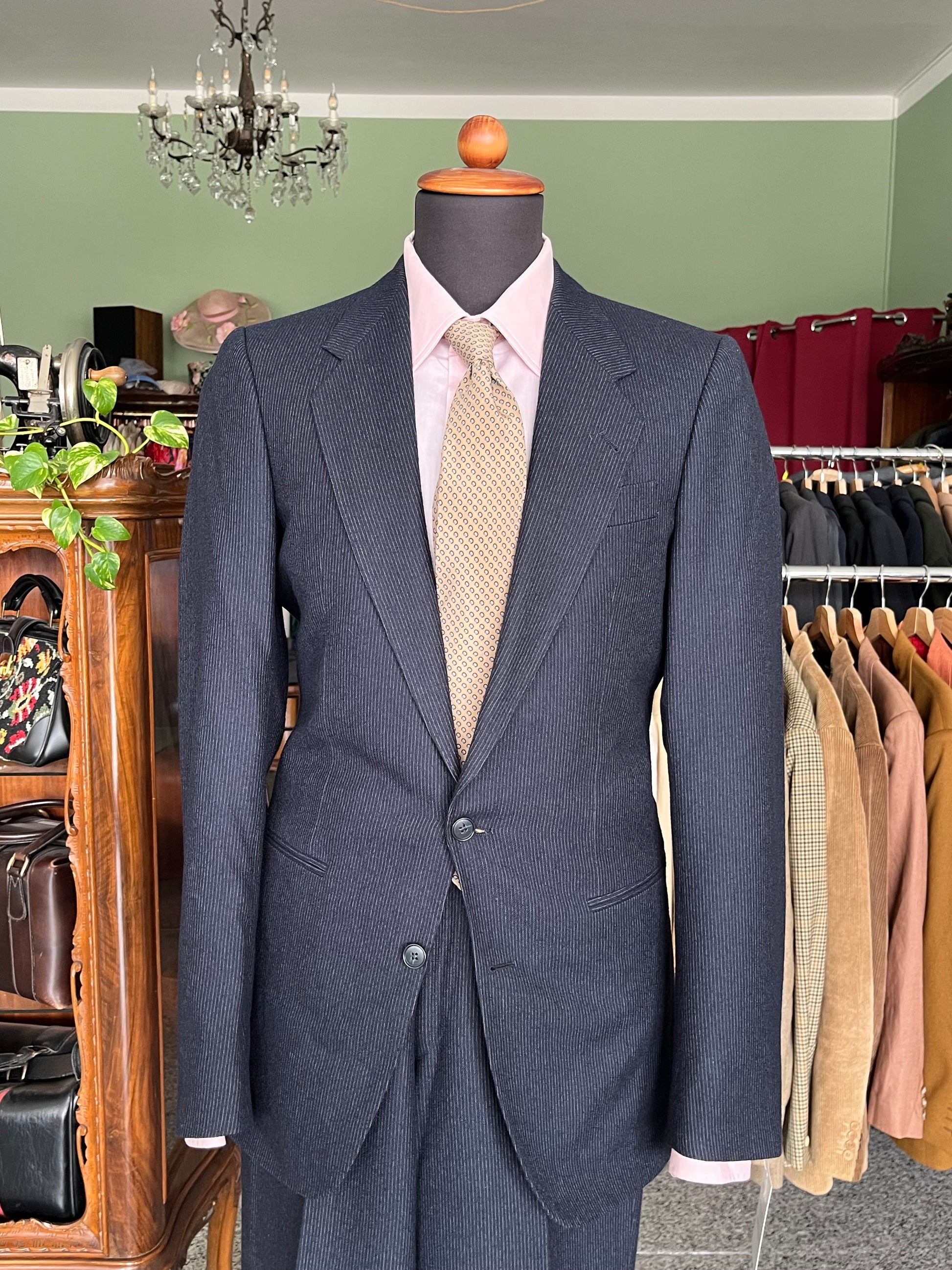 Il tessuto è una pura flanella di lana, blu notte gessato.