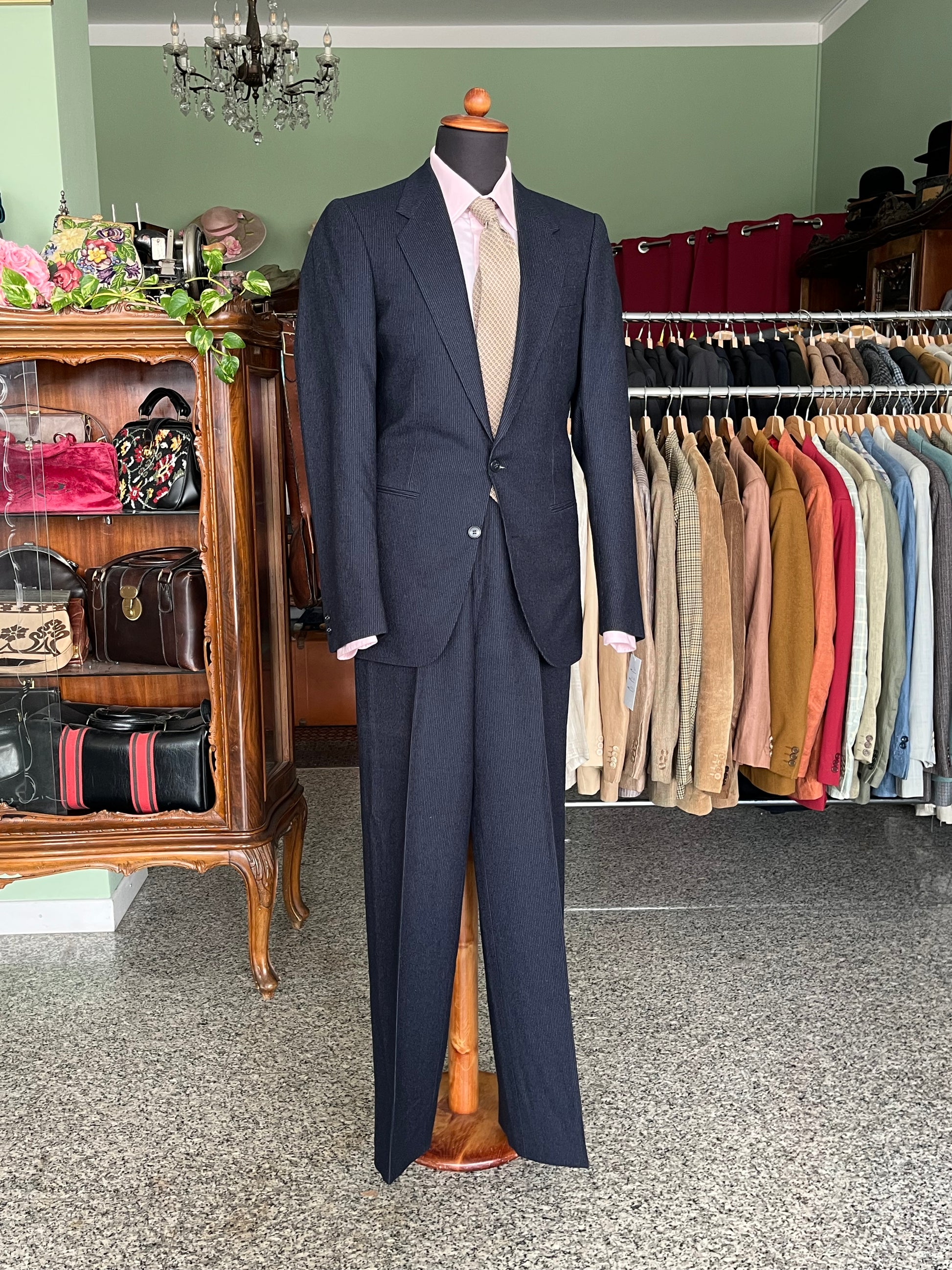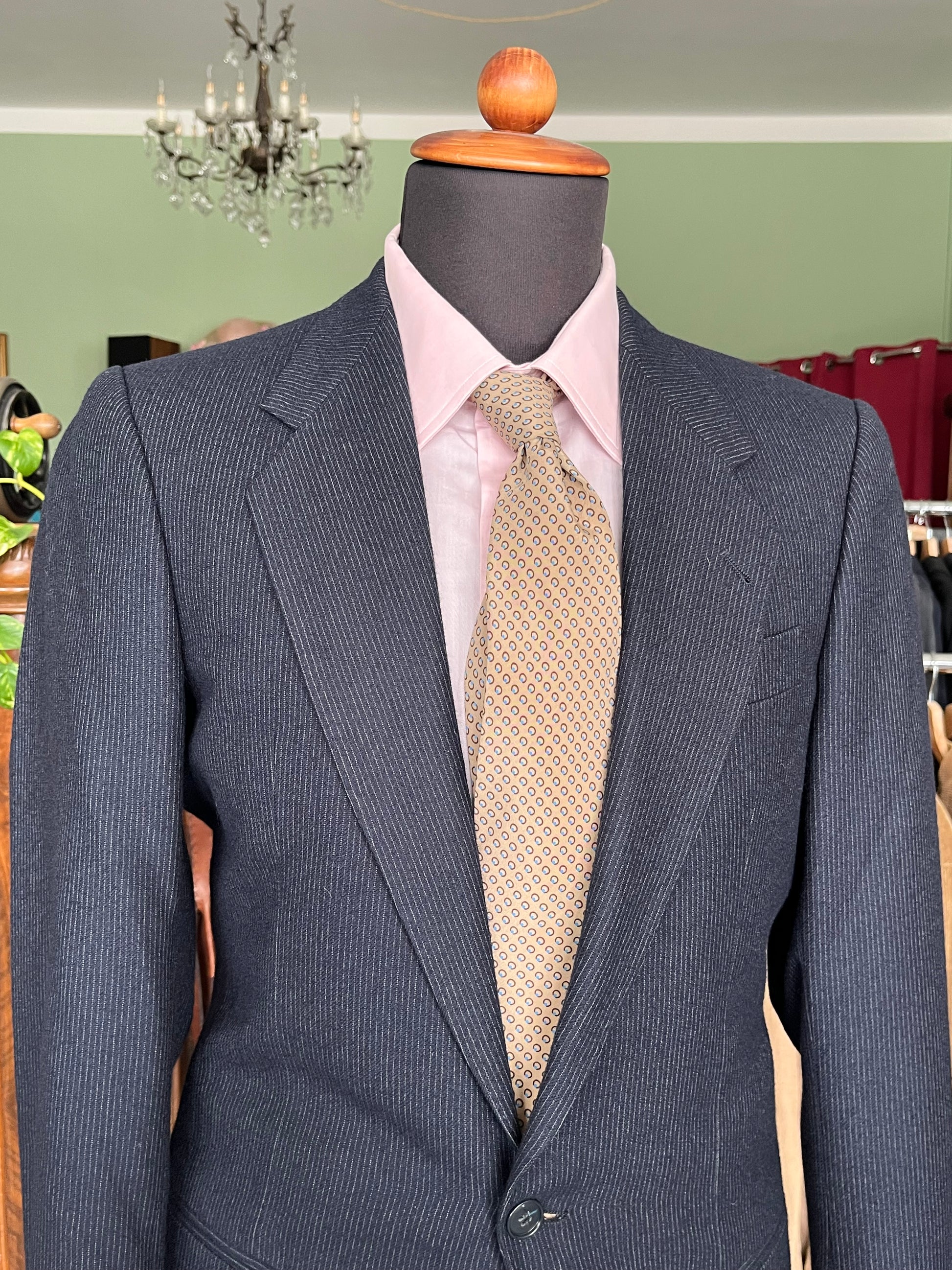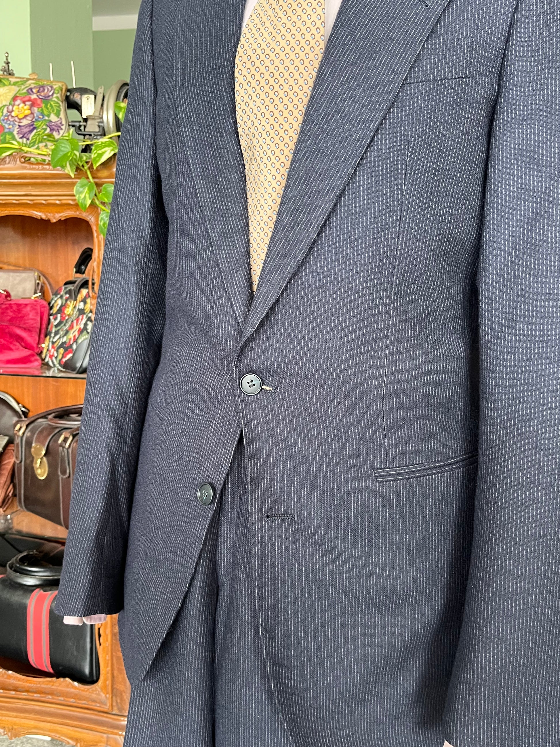 La giacca è un monopetto, due bottoni, baveri a dente e tasche a filetto.