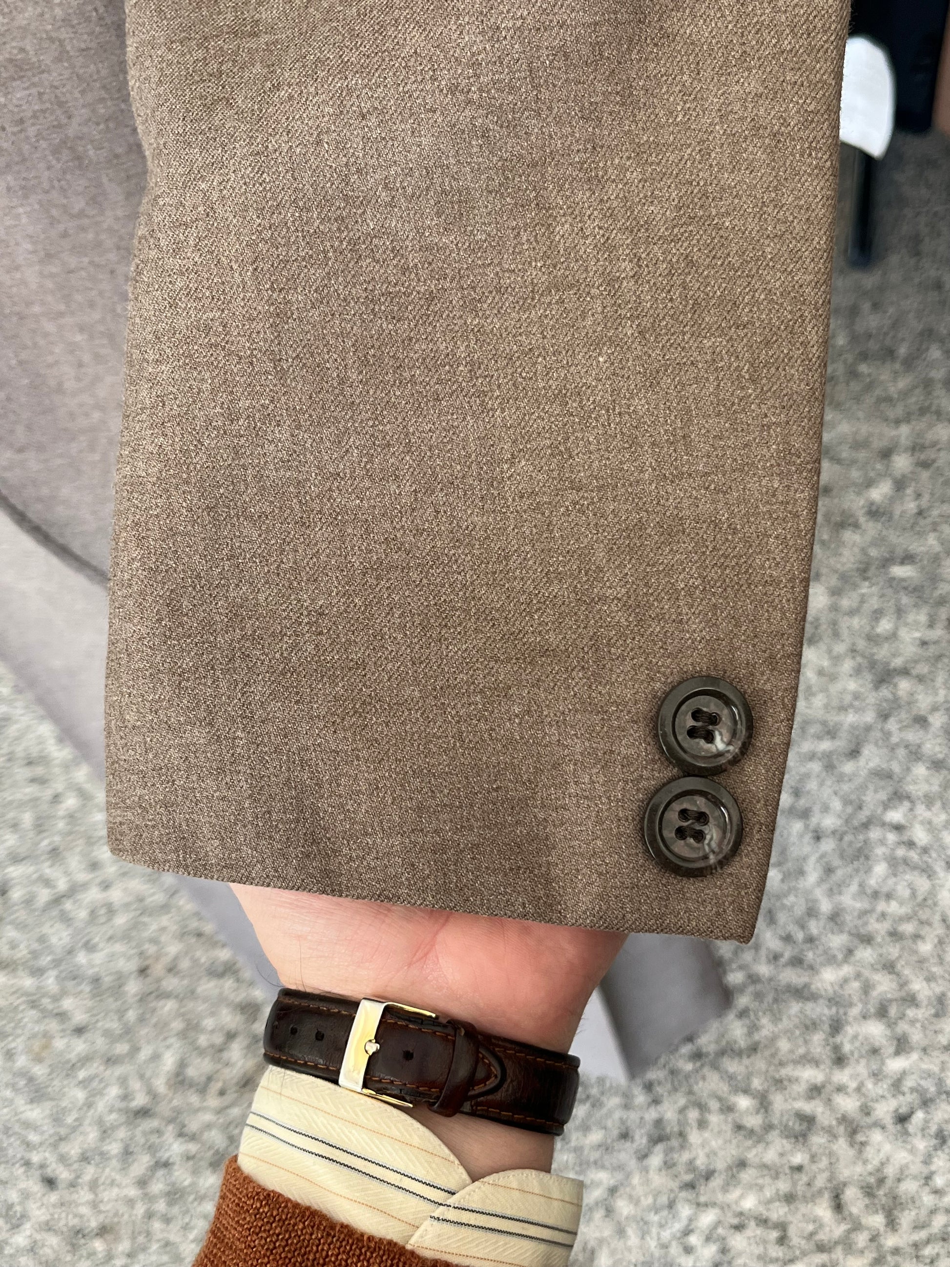 La giacca è un monopetto, due bottoni, baveri a dente e tasche a toppa e martingala cucita sul retro (in pieno stile anni ‘30).