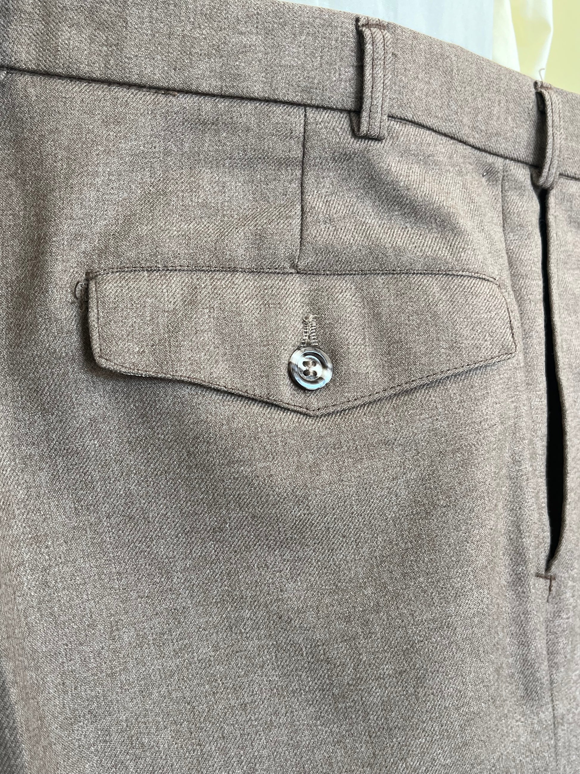 I calzoni hanno un taglio classico, con vita alta, doppia piega in vita all’inglese, tasche a pagina sul retro e fondo svasato.