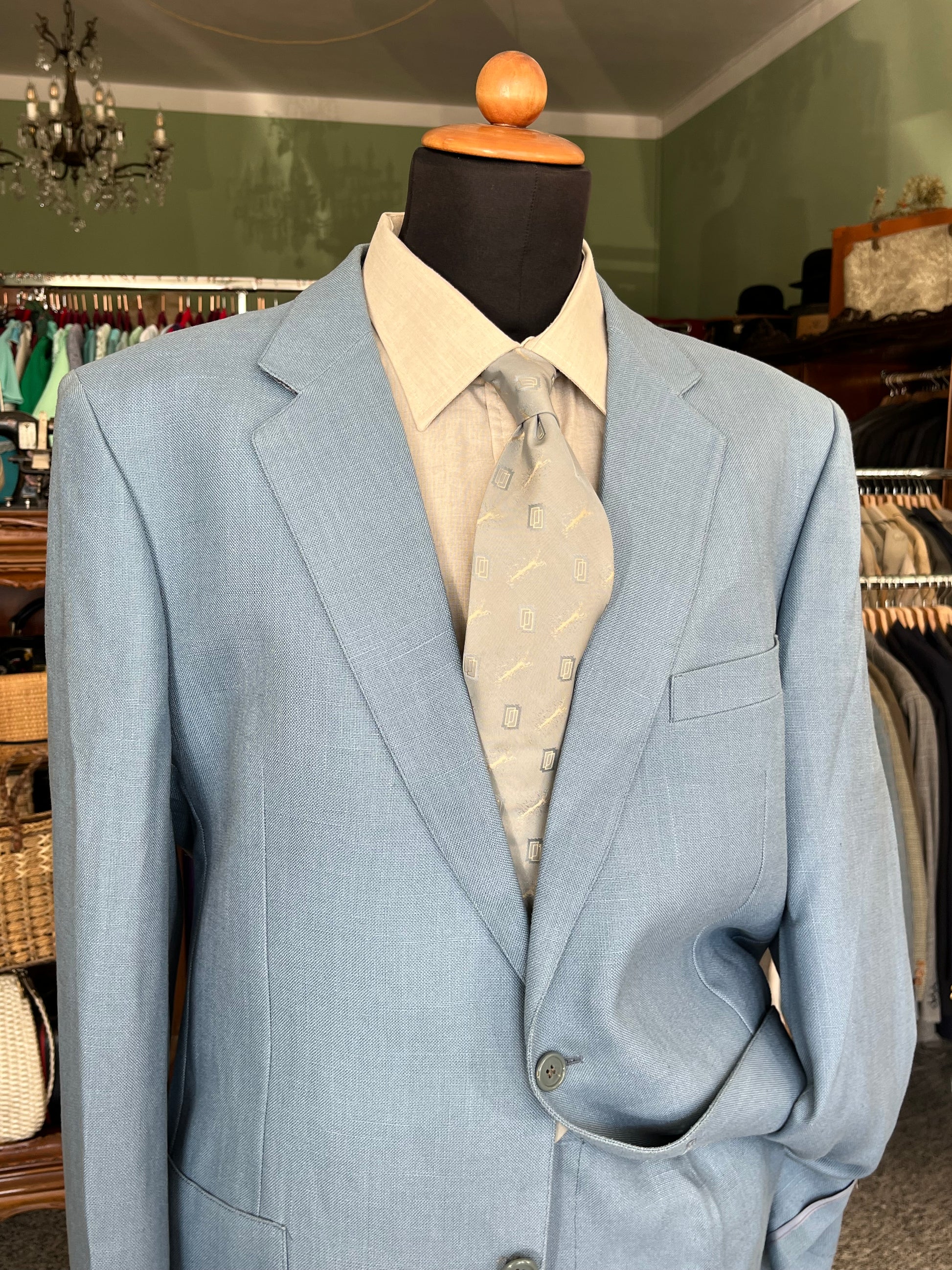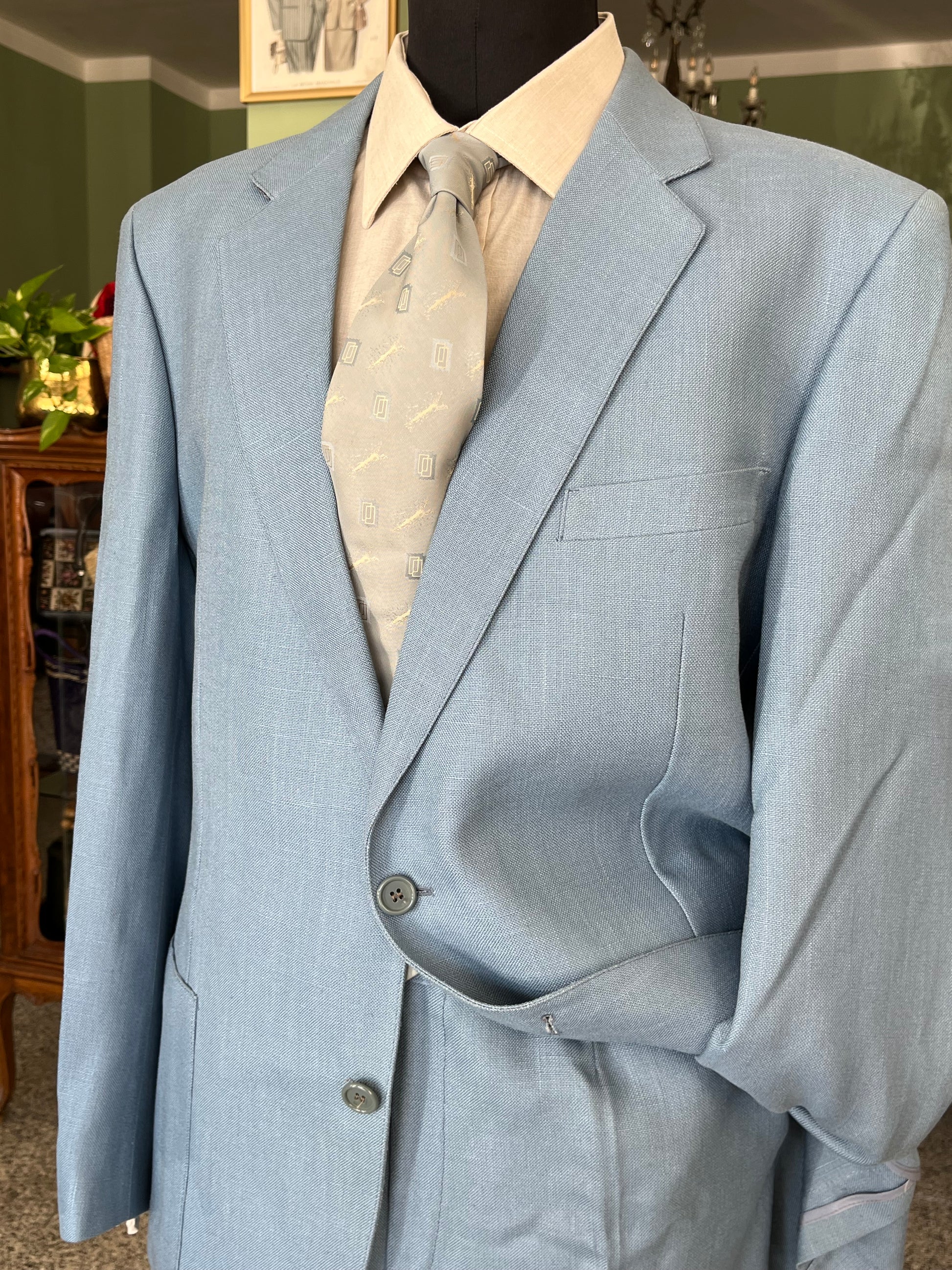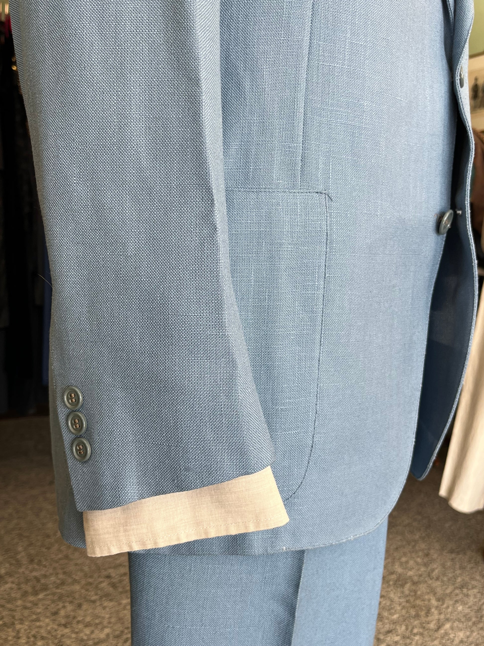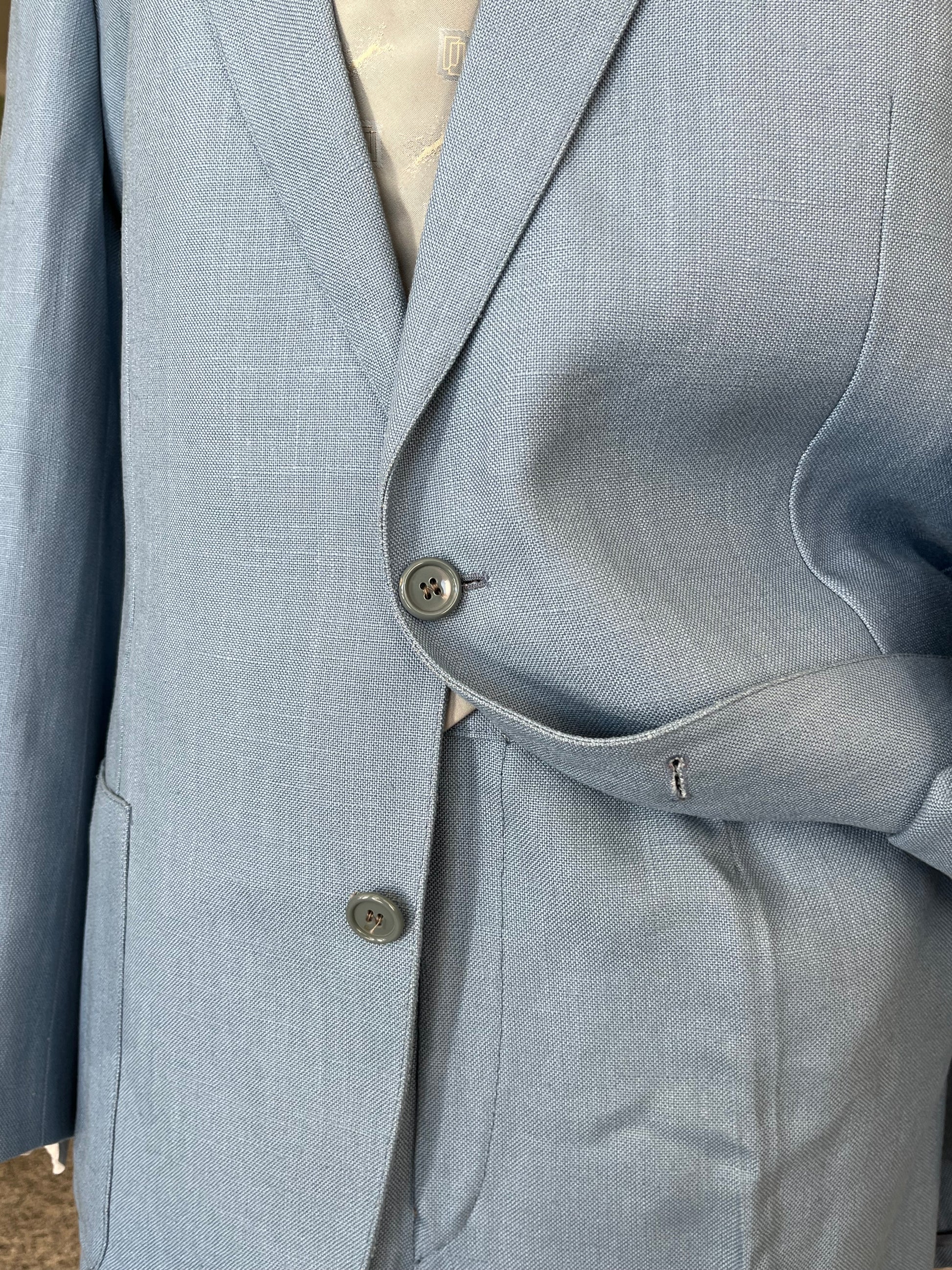 Il tessuto è una viscosa di pesantezza media, di uno stupendo color celeste. All’epoca pensato per l’estate ora ideale per la mezza stagione.