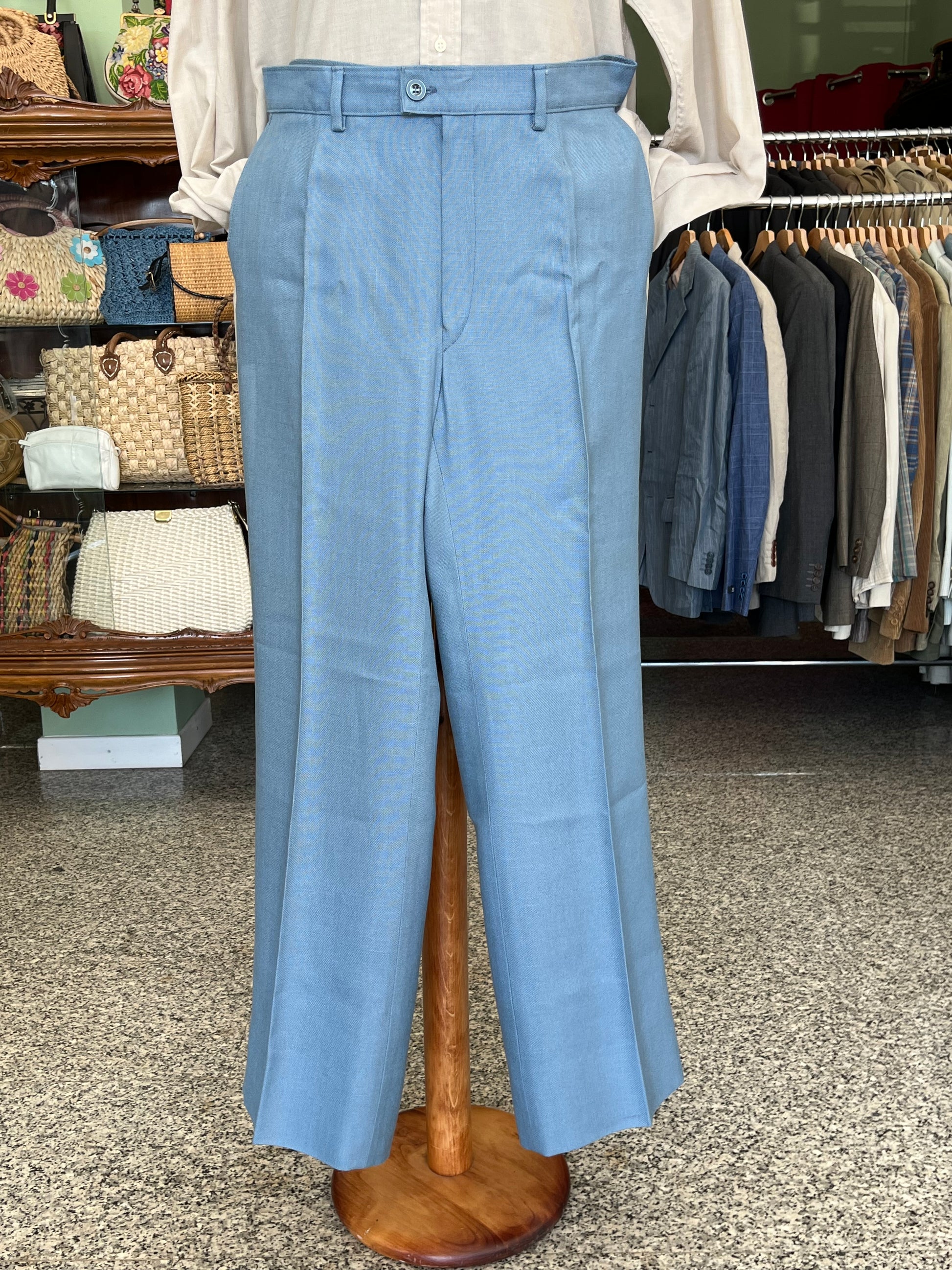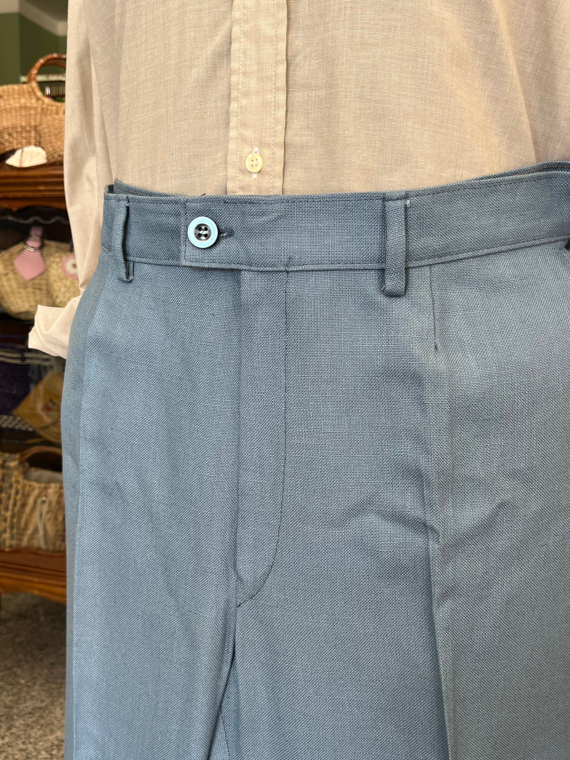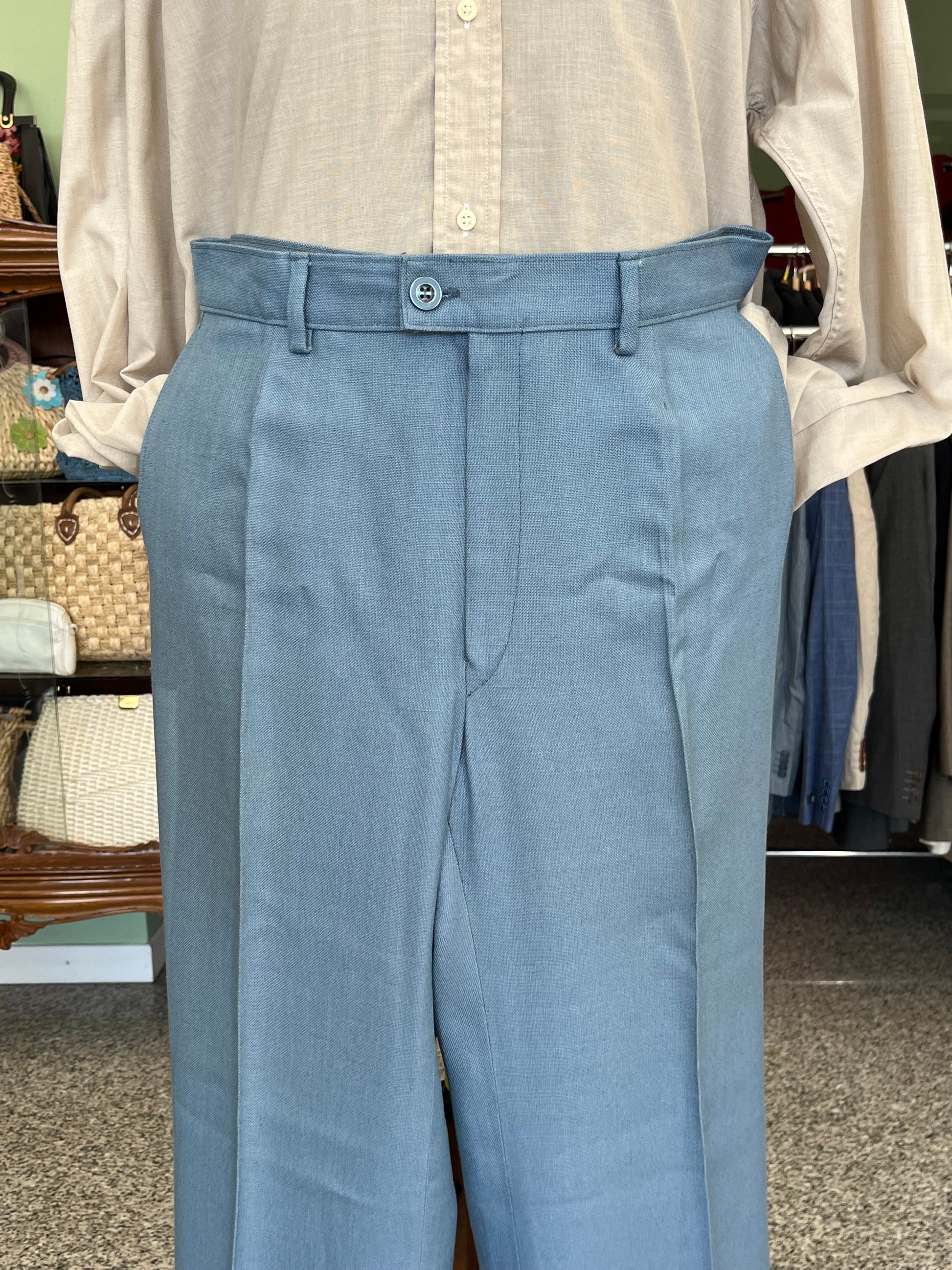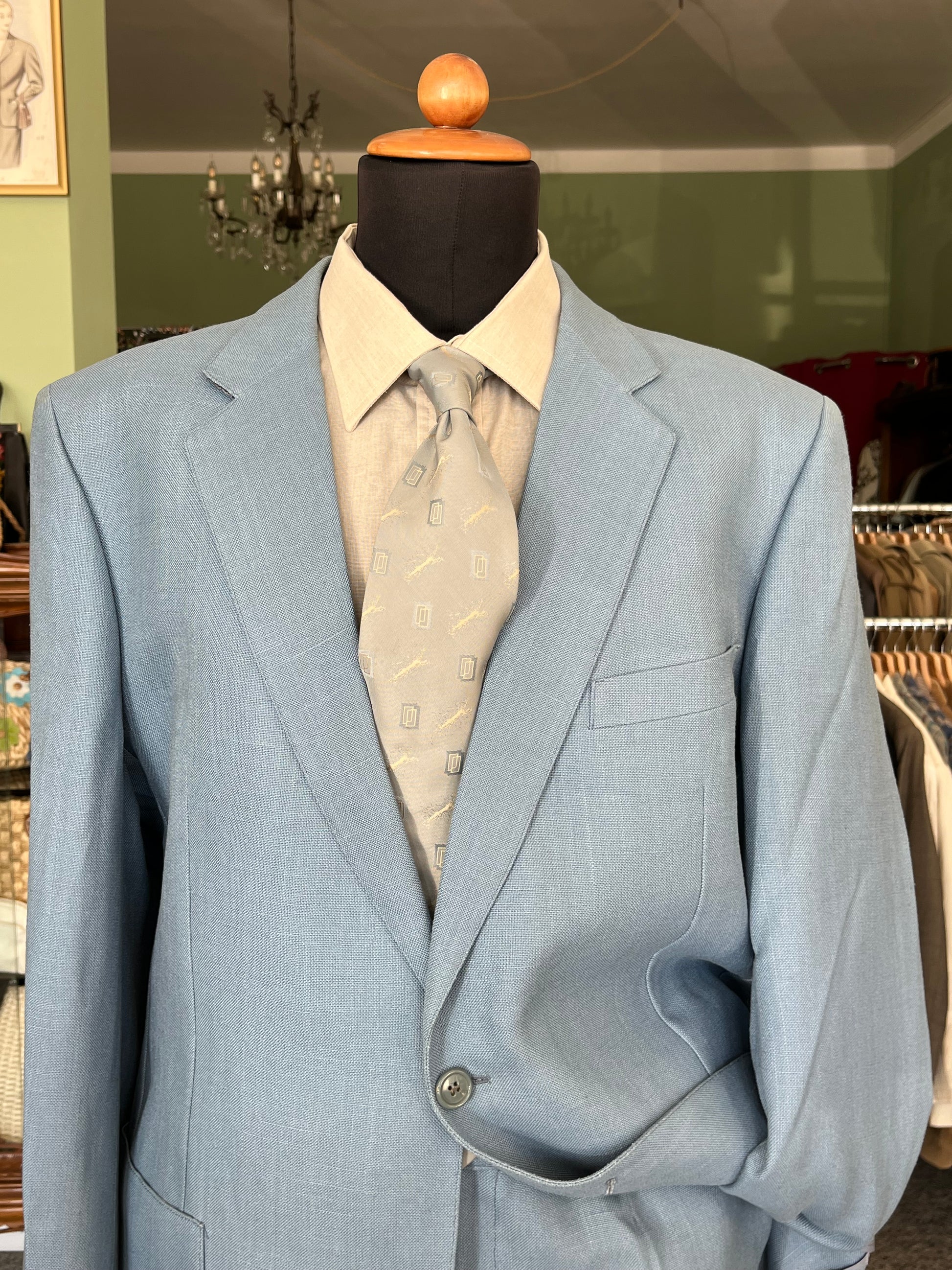 Il tessuto è una viscosa di pesantezza media, di uno stupendo color celeste. All’epoca pensato per l’estate ora ideale per la mezza stagione.