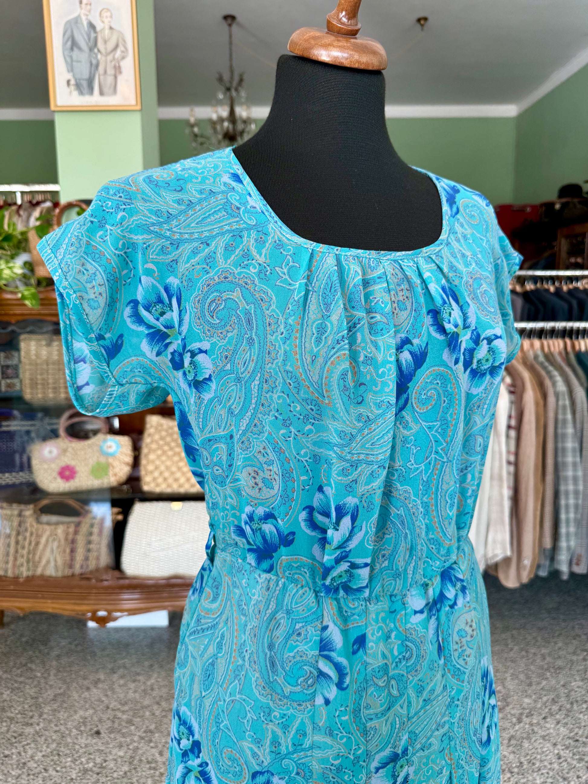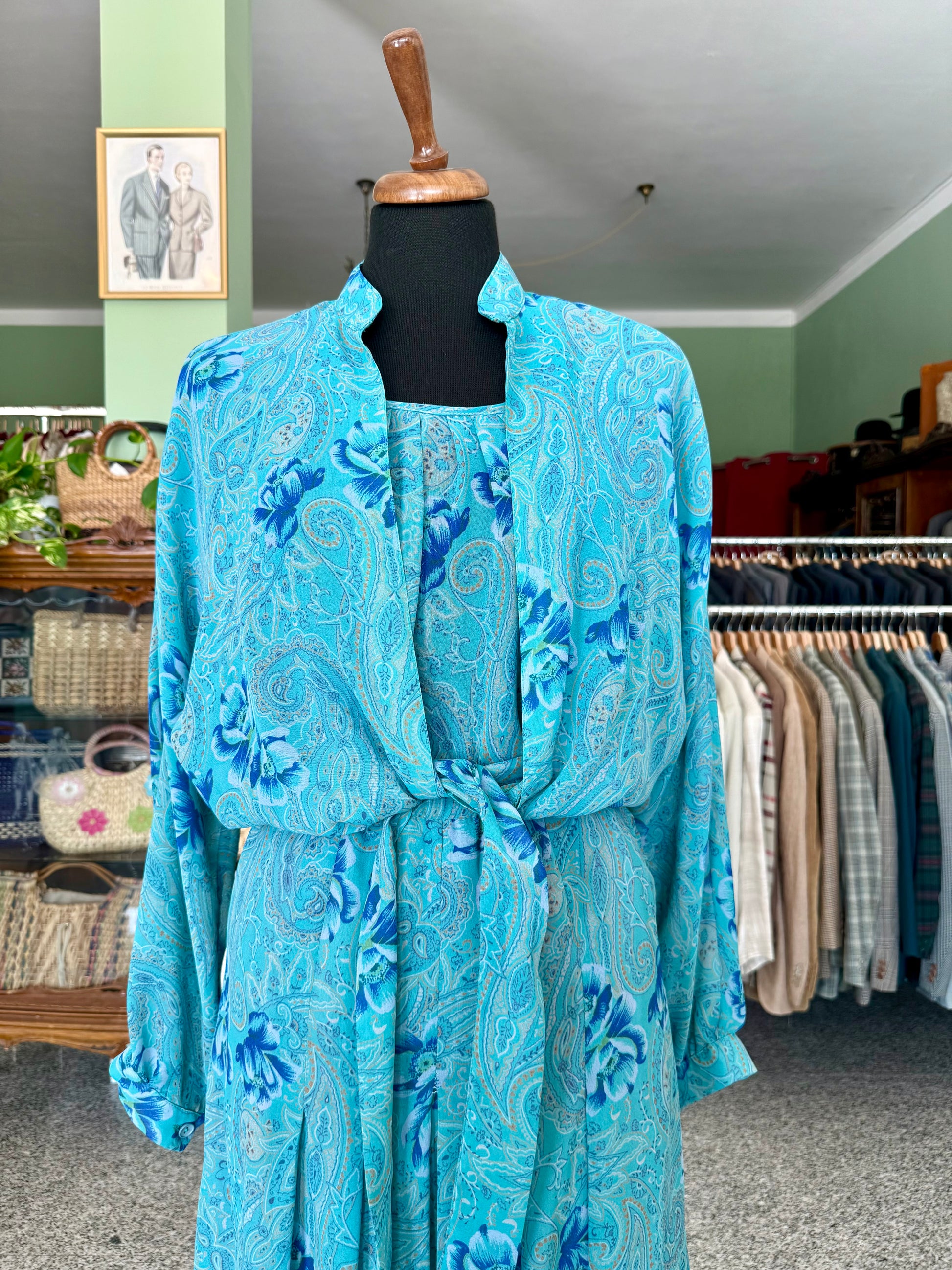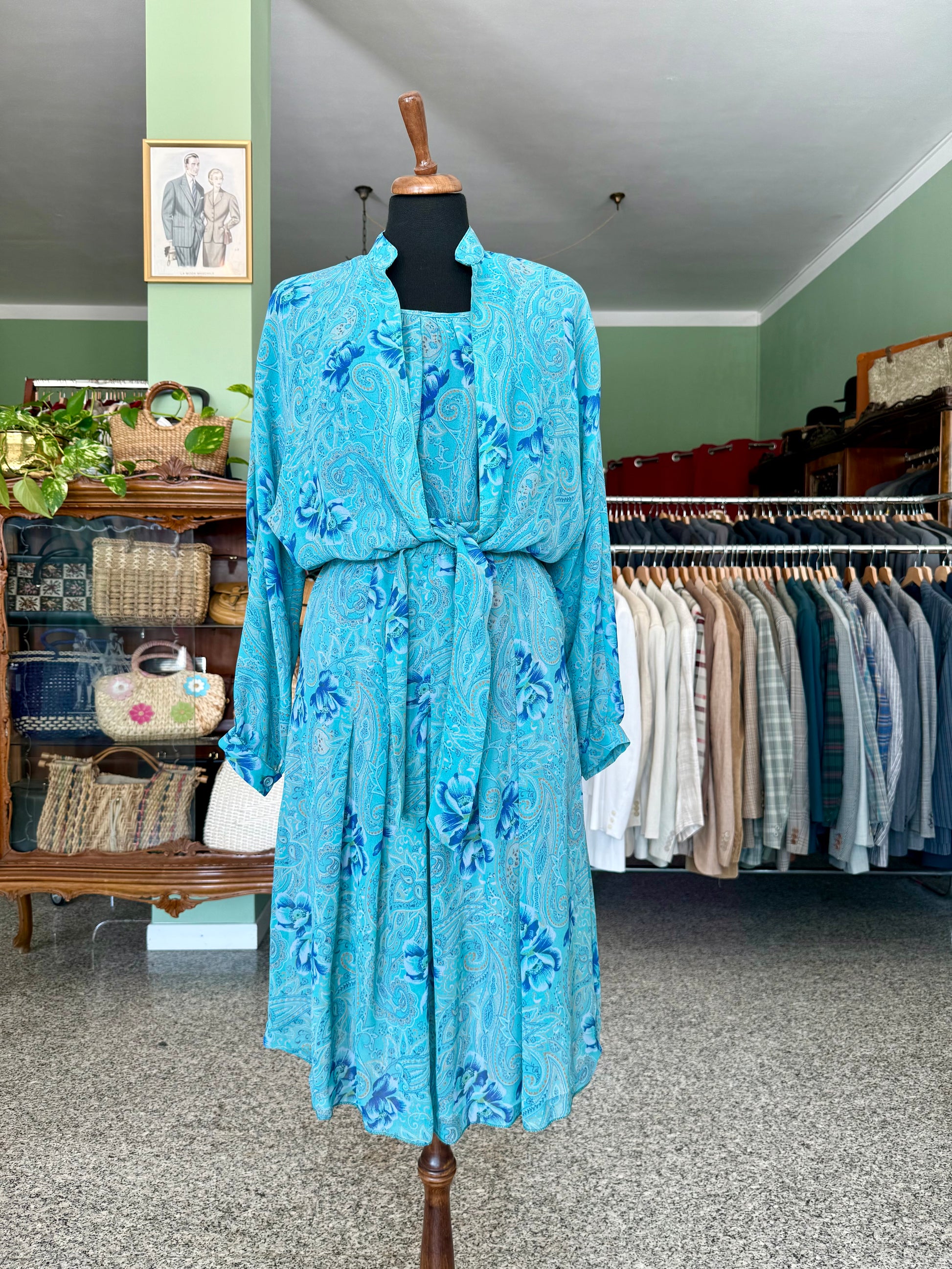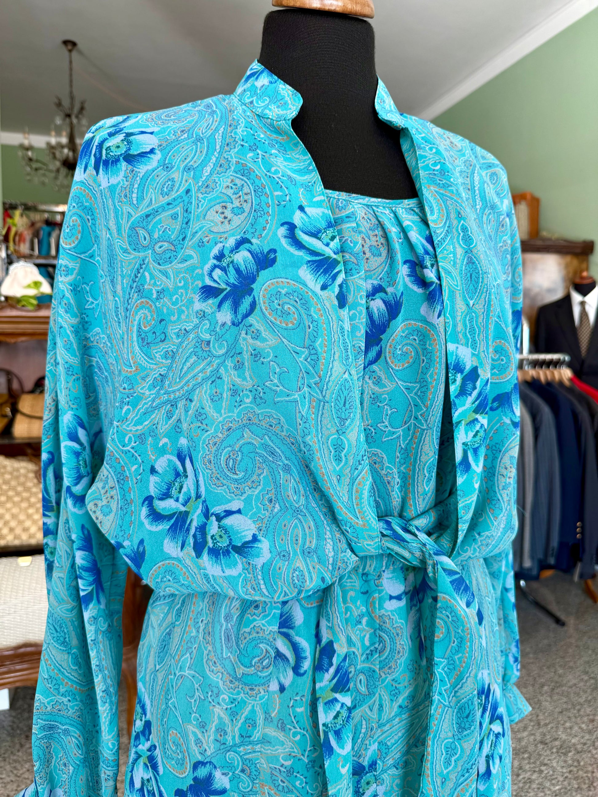 Elegante completo vintage anni ’70 composto da abito midi e bolerino coordinato nello stesso tessuto leggero e fluido, caratterizzato da una vivace fantasia paisley nei toni del turchese con fiori blu. L’abito ha un taglio morbido e femminile con punto vita definito, mentre il bolerino con colletto stondato e cintura da annodare aggiunge un tocco raffinato e versatile. Indossati insieme o separati, sono perfetti per creare un look elegante e senza tempo