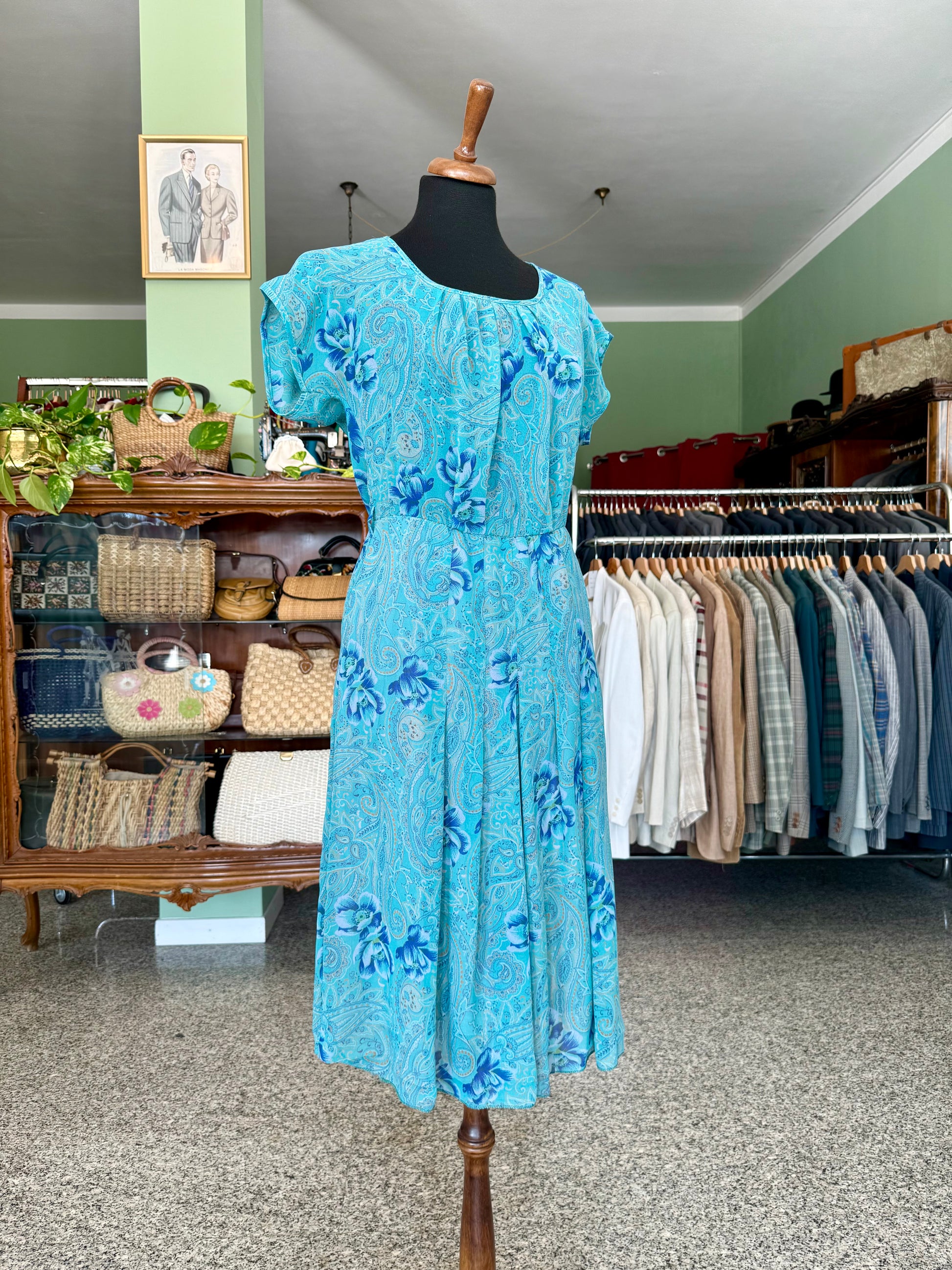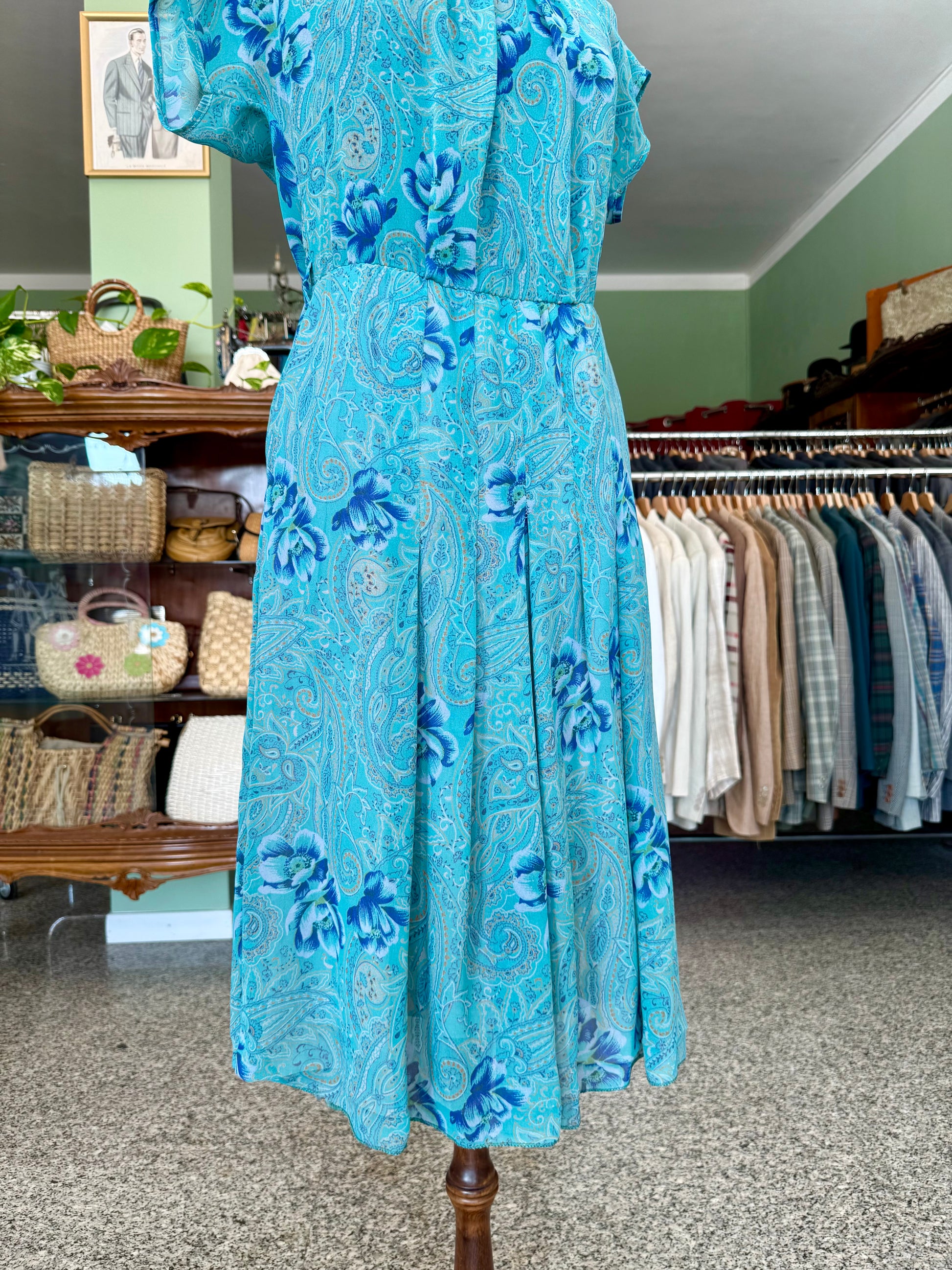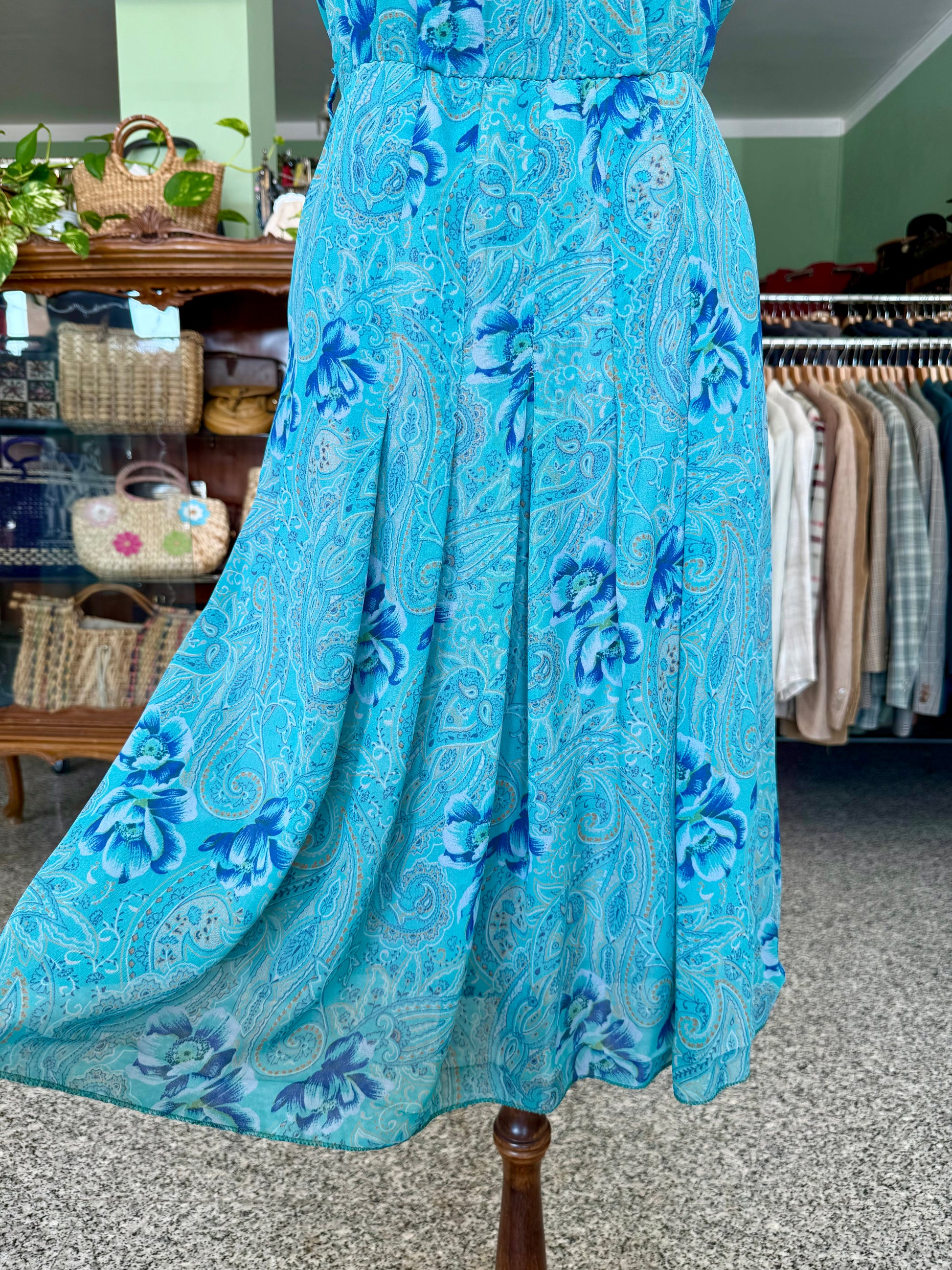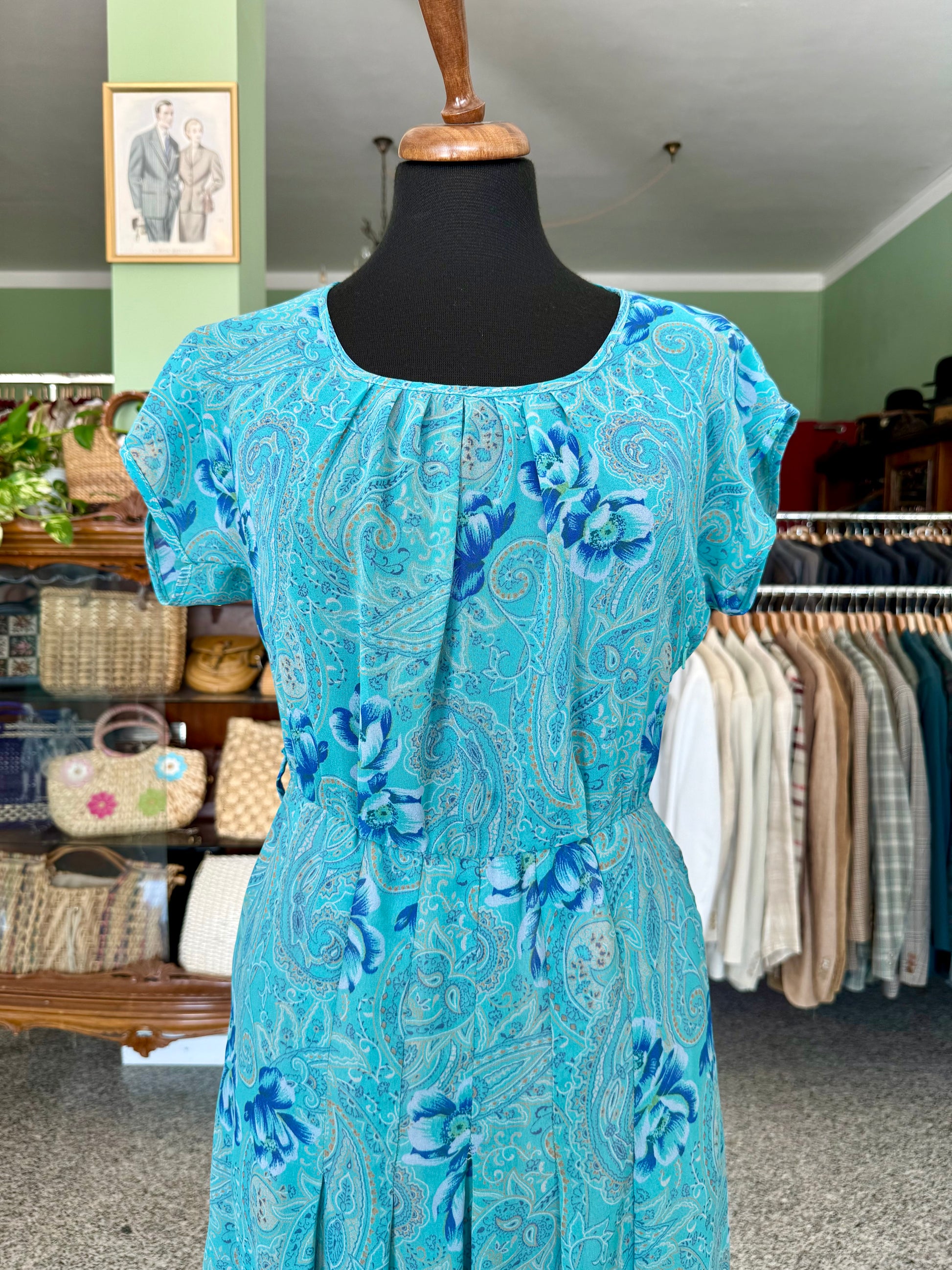 Elegante completo vintage anni ’70 composto da abito midi e bolerino coordinato nello stesso tessuto leggero e fluido, caratterizzato da una vivace fantasia paisley nei toni del turchese con fiori blu. L’abito ha un taglio morbido e femminile con punto vita definito, mentre il bolerino con colletto stondato e cintura da annodare aggiunge un tocco raffinato e versatile. Indossati insieme o separati, sono perfetti per creare un look elegante e senza tempo