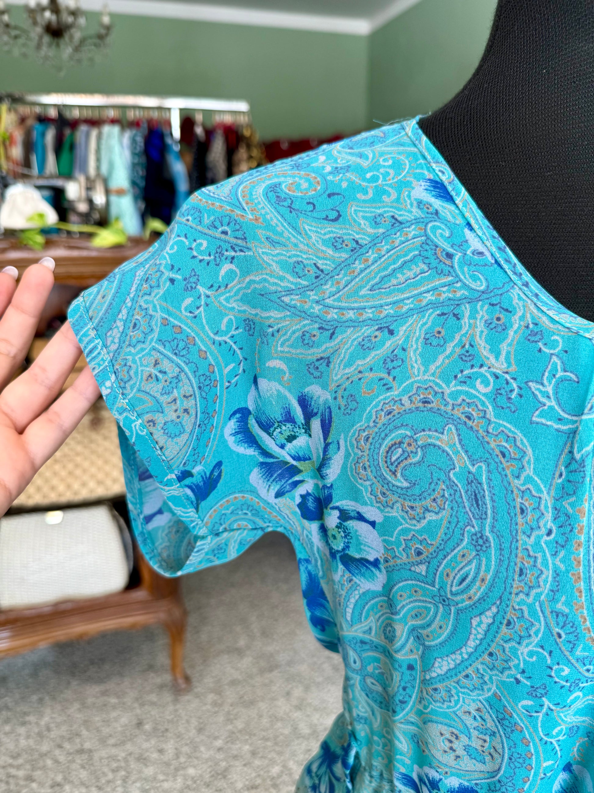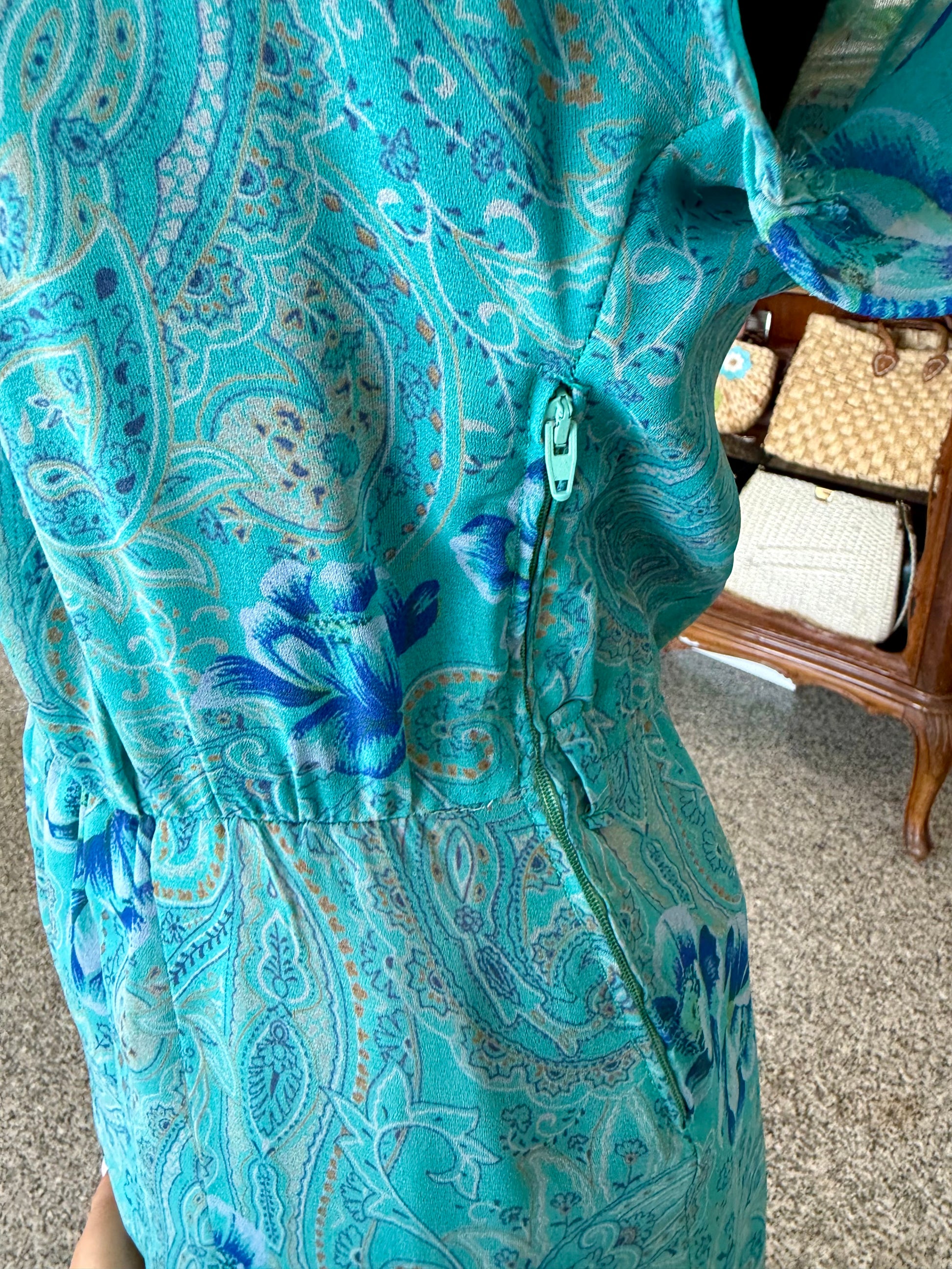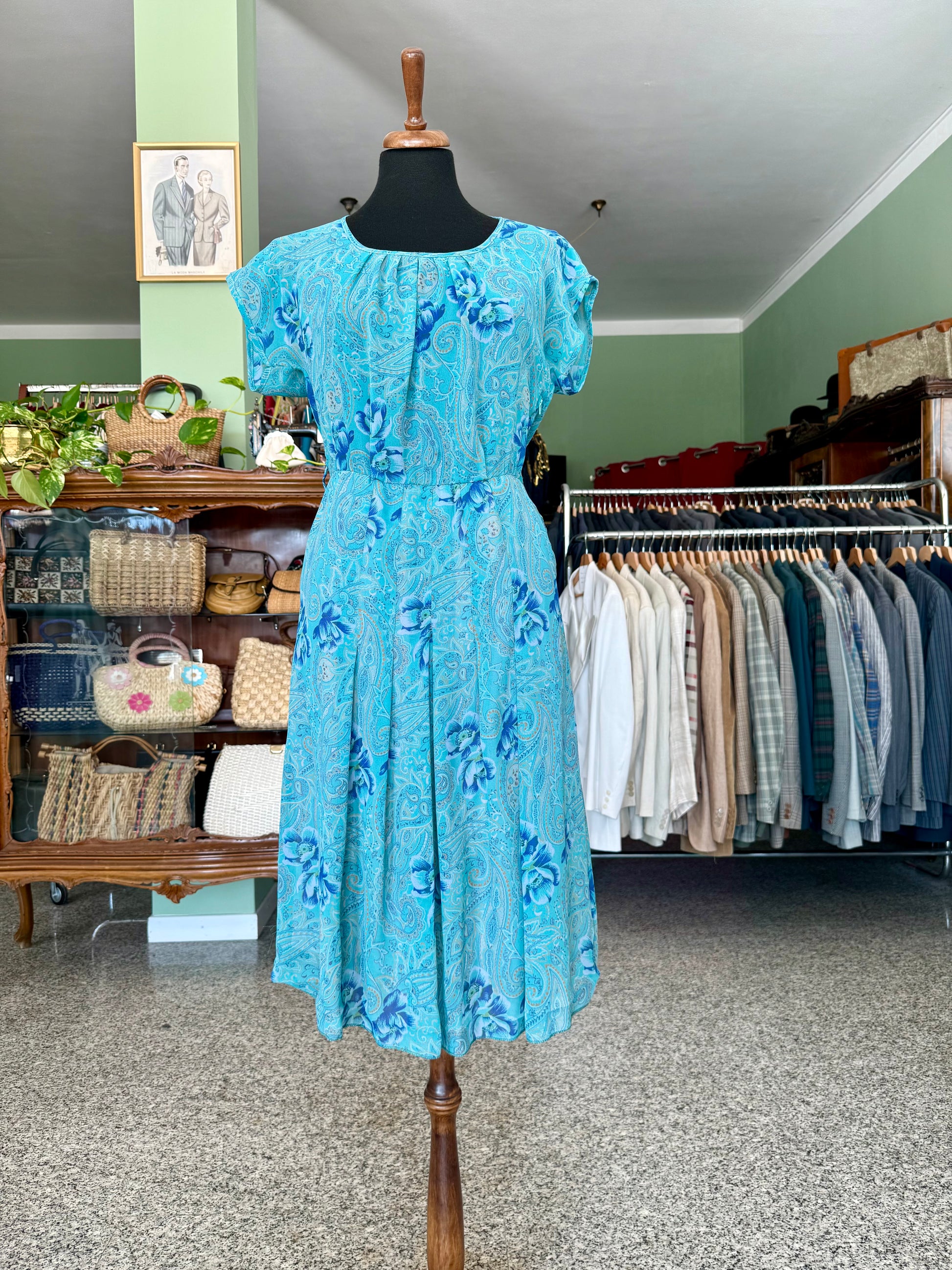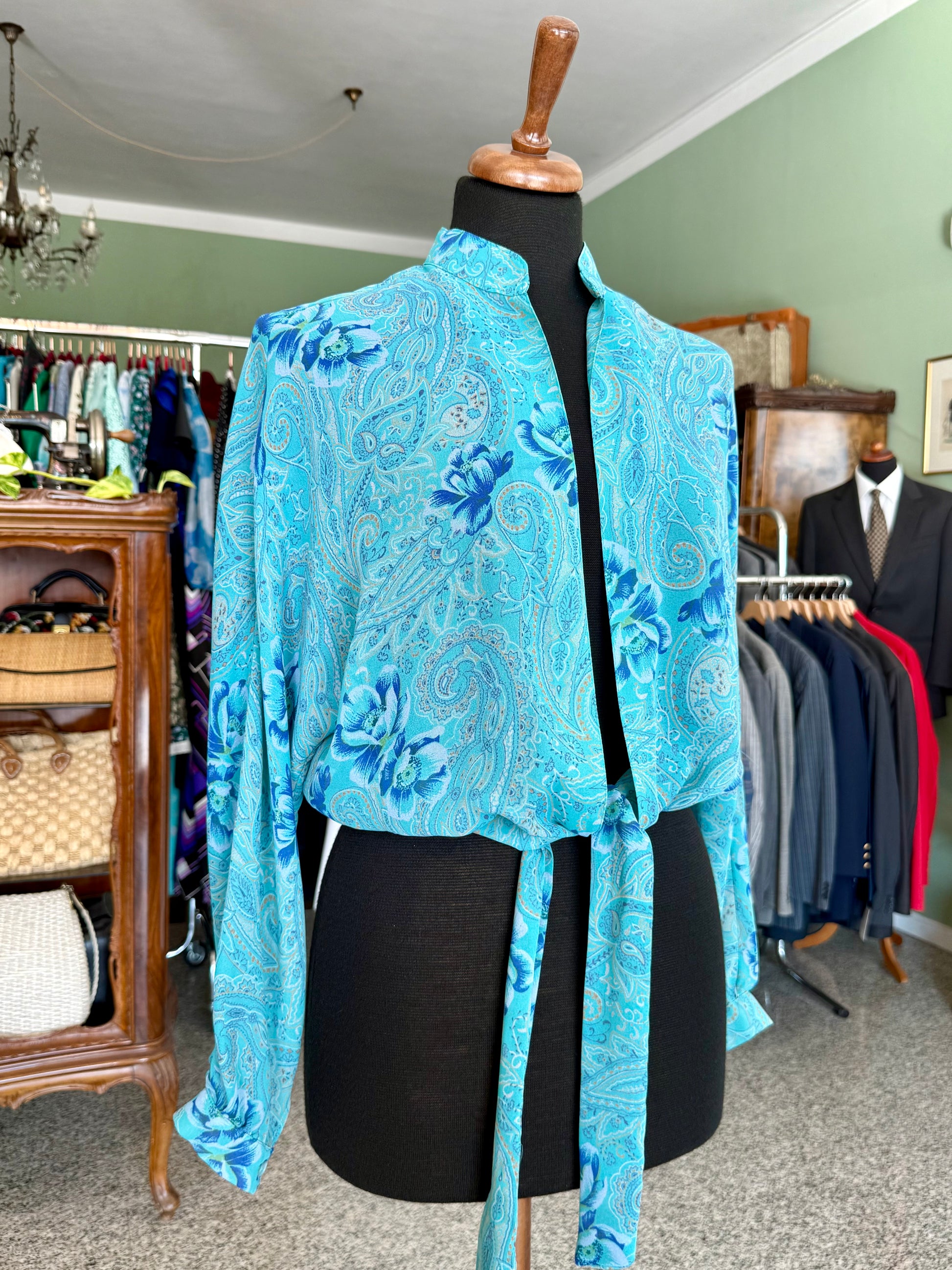 Elegante completo vintage anni ’70 composto da abito midi e bolerino coordinato nello stesso tessuto leggero e fluido, caratterizzato da una vivace fantasia paisley nei toni del turchese con fiori blu. L’abito ha un taglio morbido e femminile con punto vita definito, mentre il bolerino con colletto stondato e cintura da annodare aggiunge un tocco raffinato e versatile. Indossati insieme o separati, sono perfetti per creare un look elegante e senza tempo