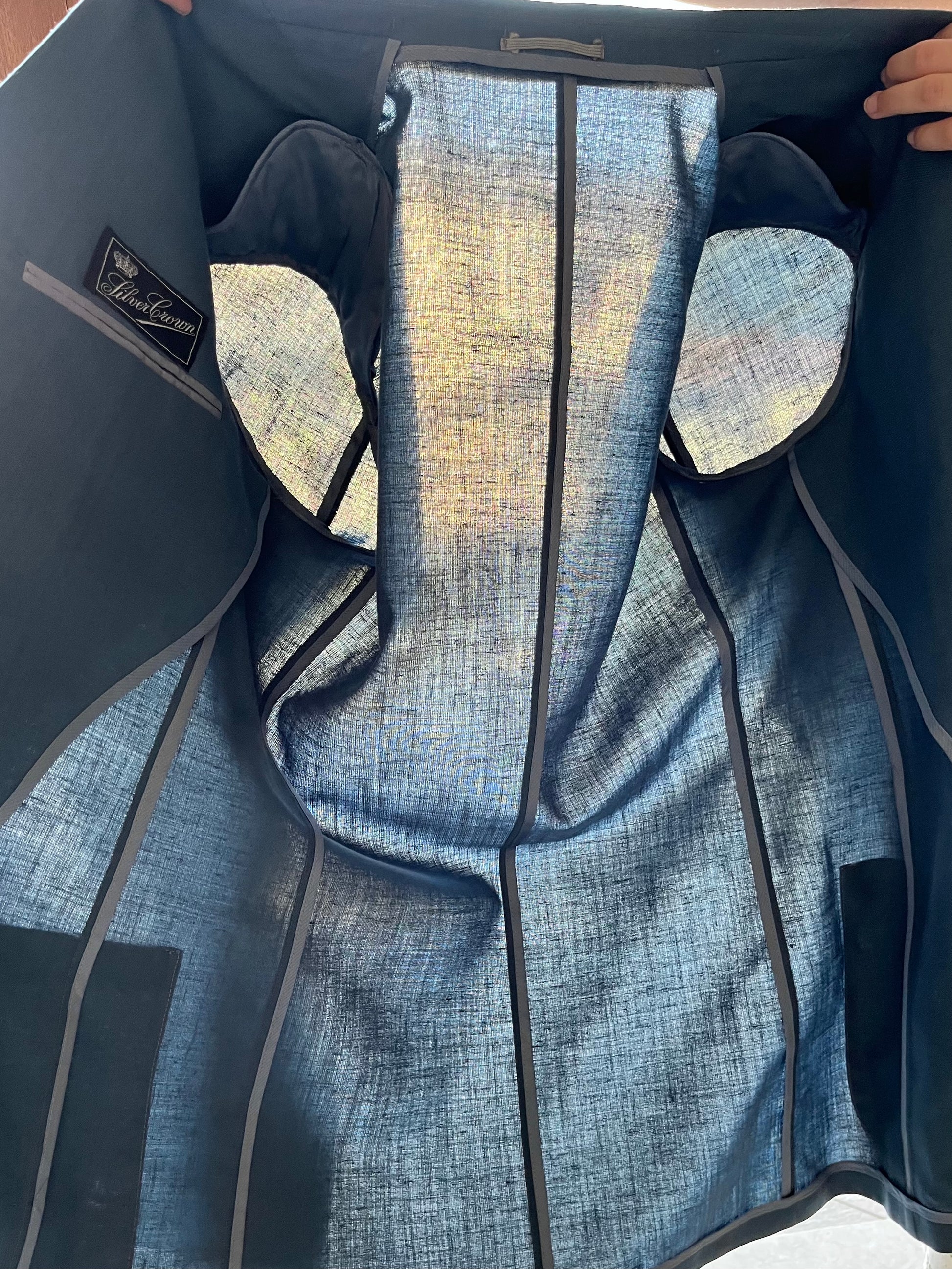 La giacca è un monopetto, due bottoni, baveri a dente, tasche a toppa e nessuno spacco sul retro. Sì presenta inoltre come totalmente sfoderata, quindi molto traspirante.