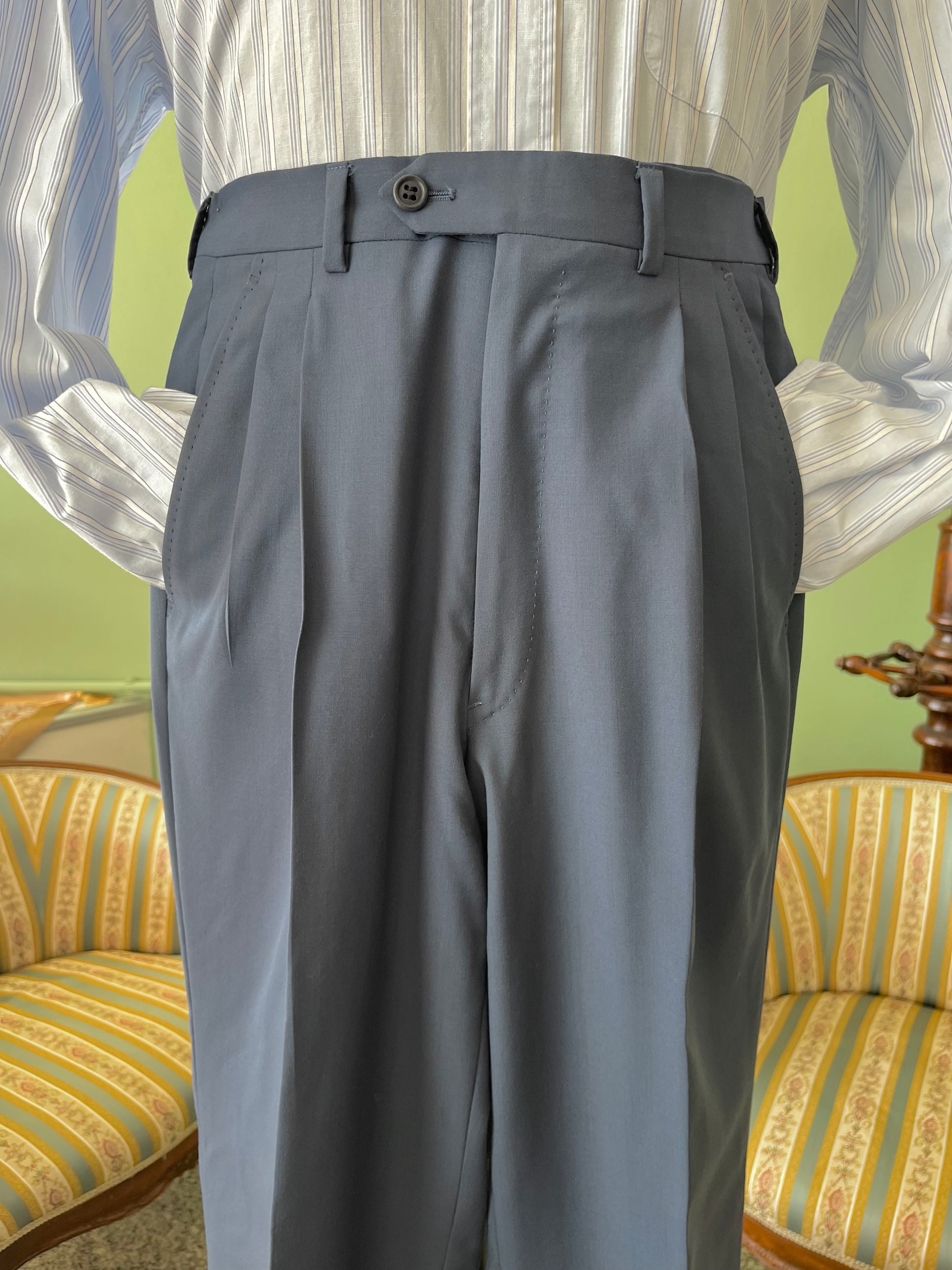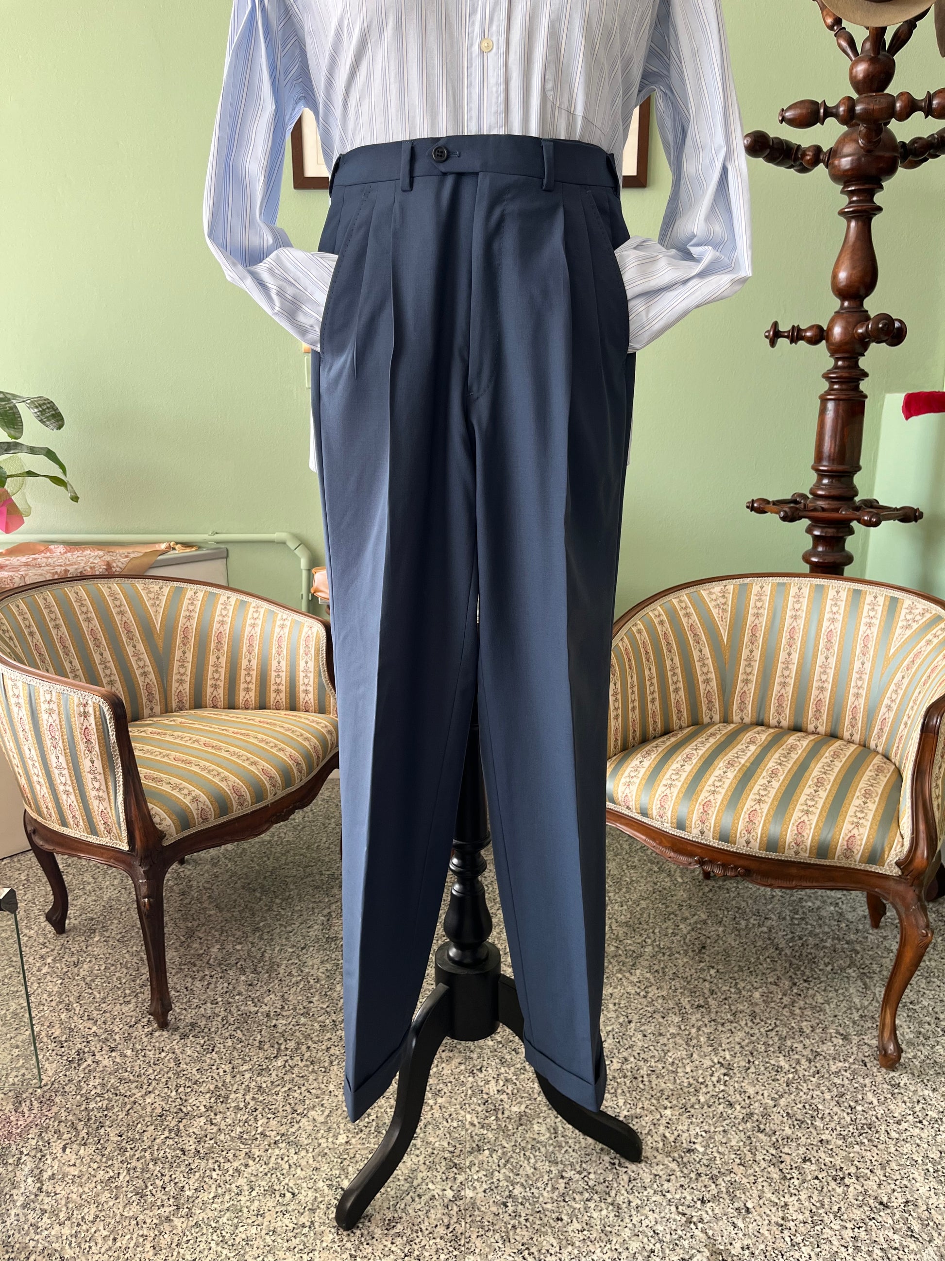 I calzoni hanno un taglio classico, con vita alta, doppia piega in vita ed un taglio dritto.