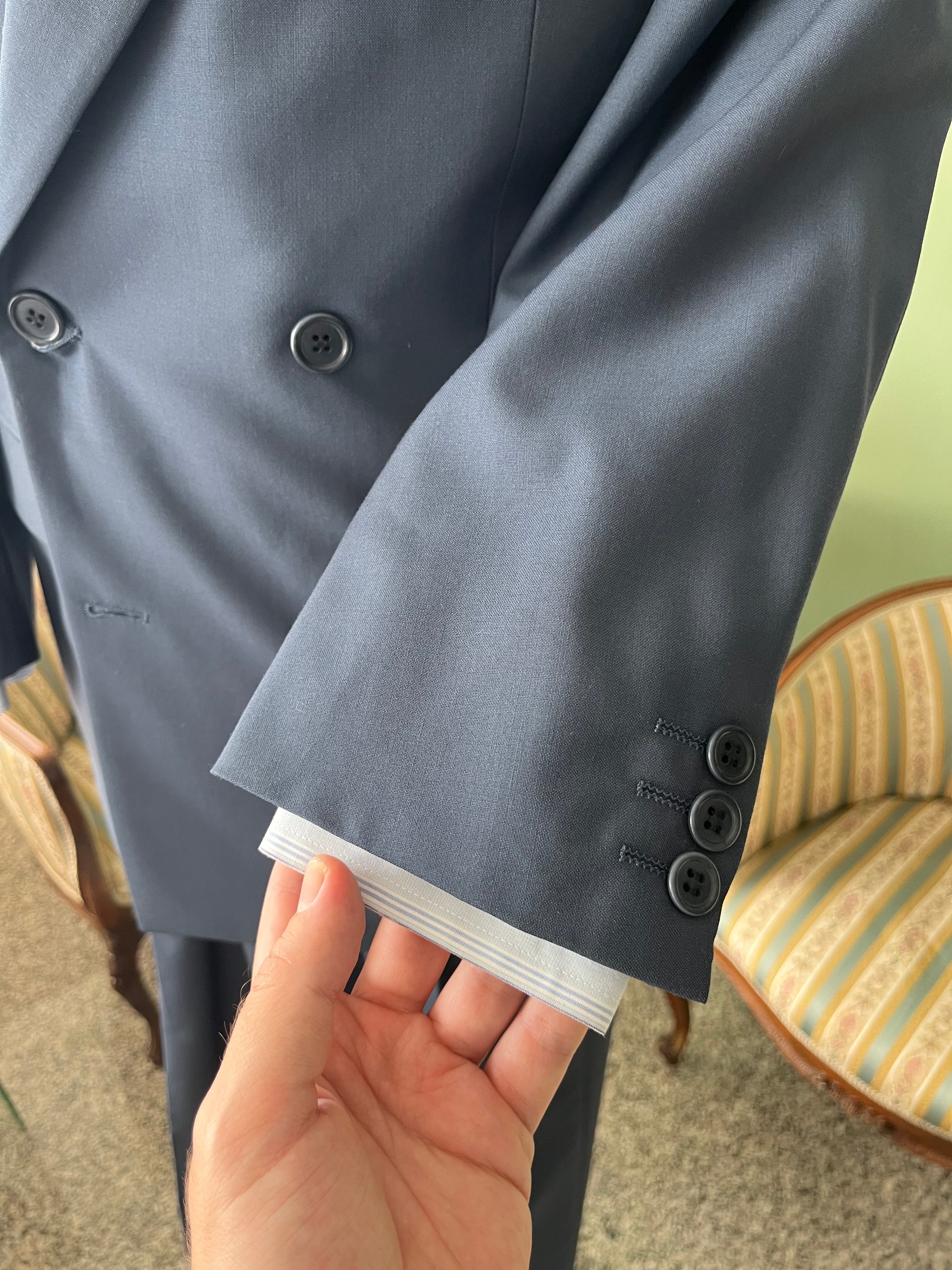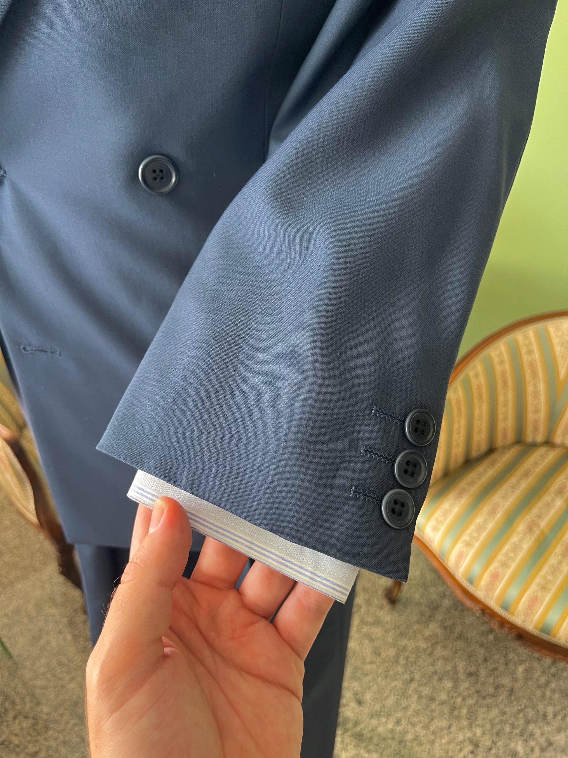 Il tessuto è un 100% puro fresco di lana, di colore bluette, ideale per la mezza stagione.