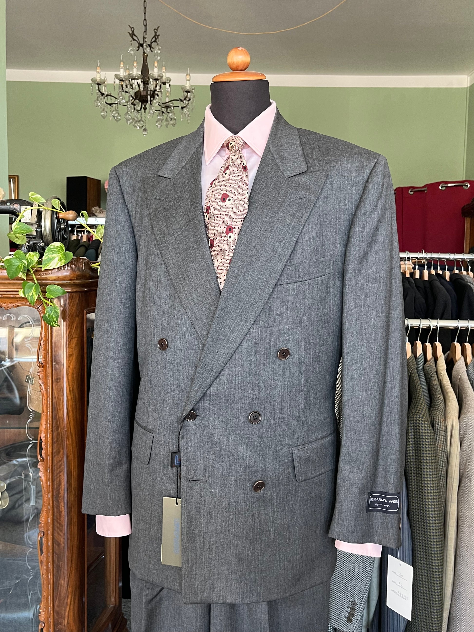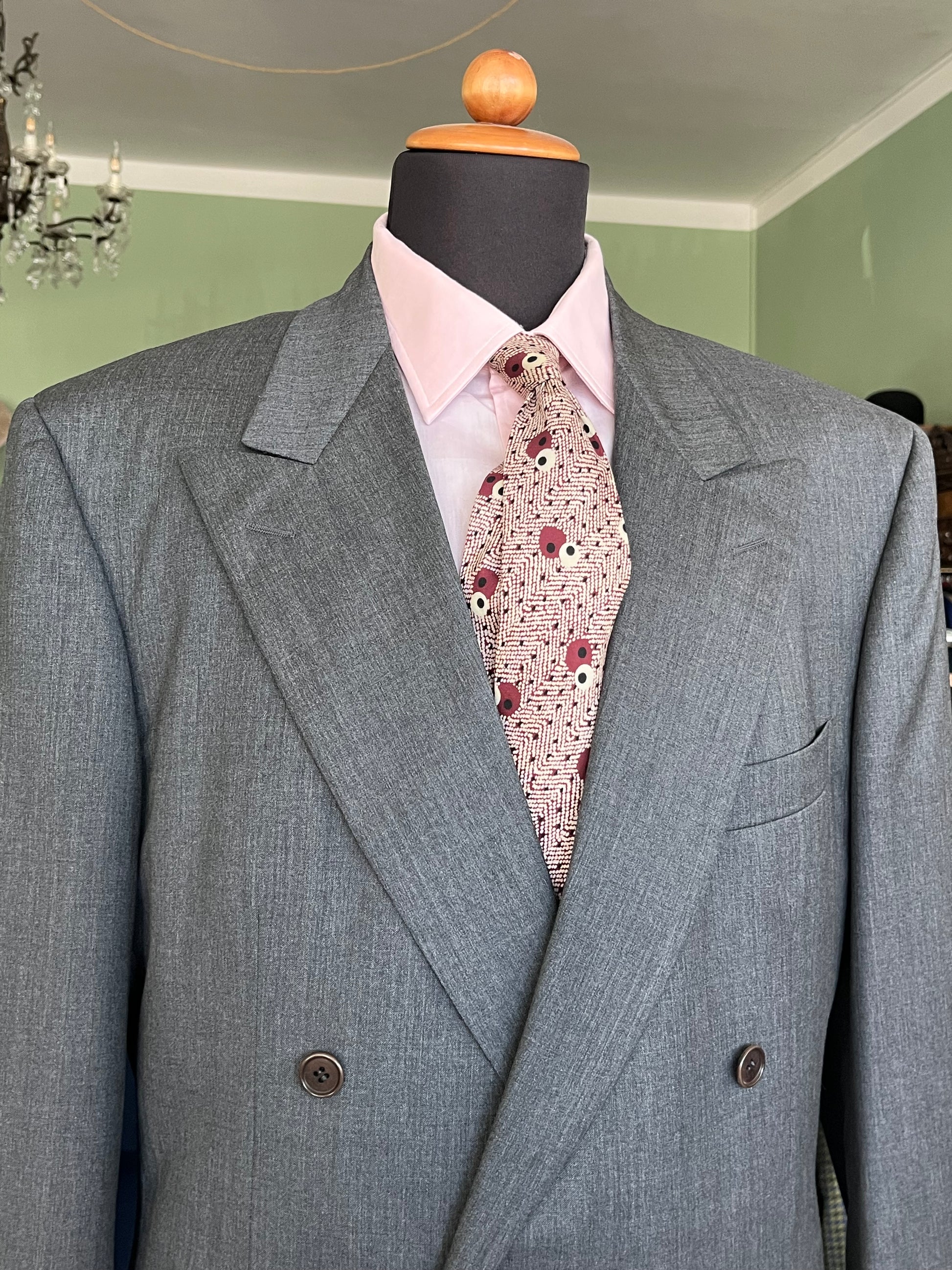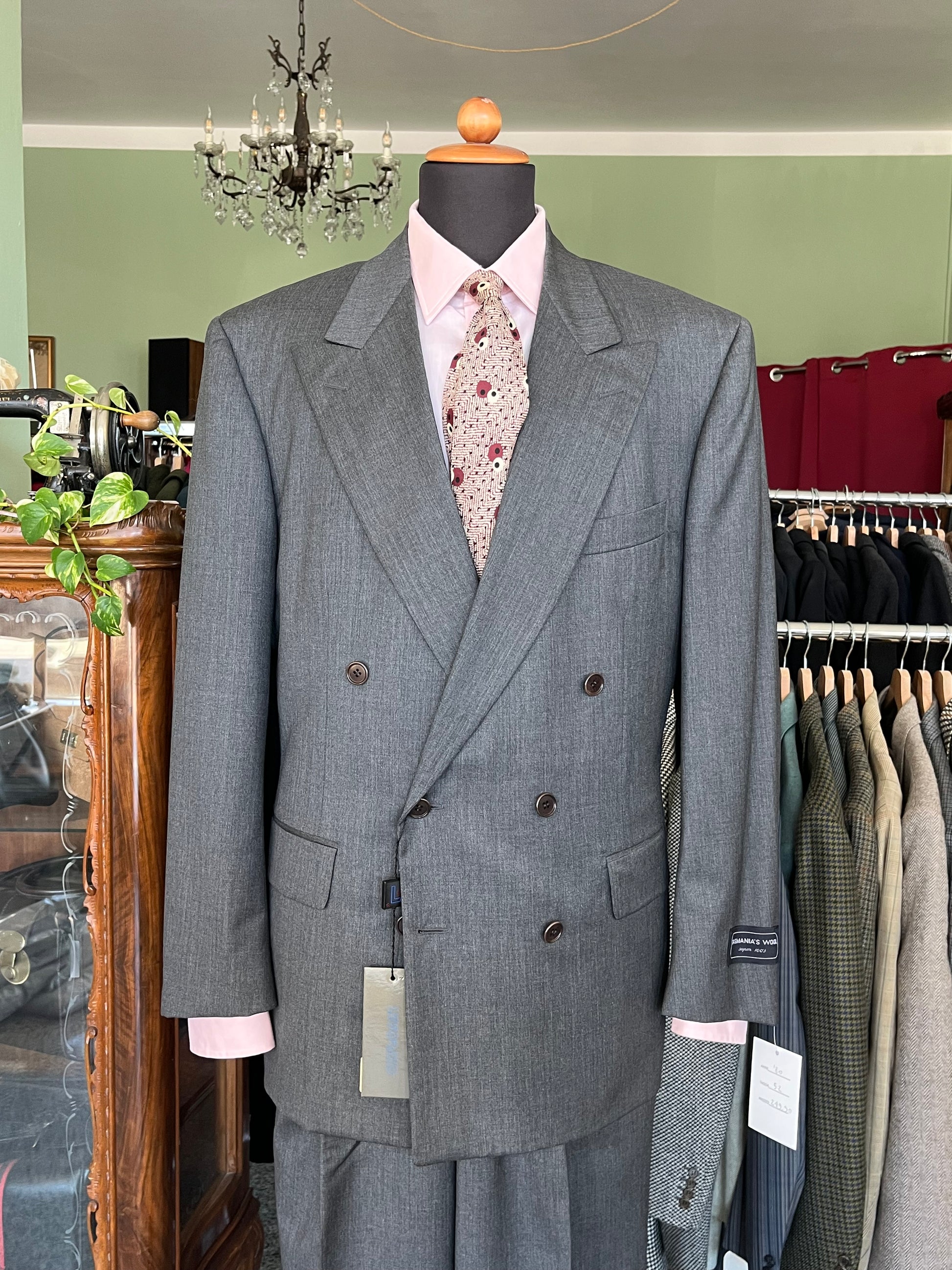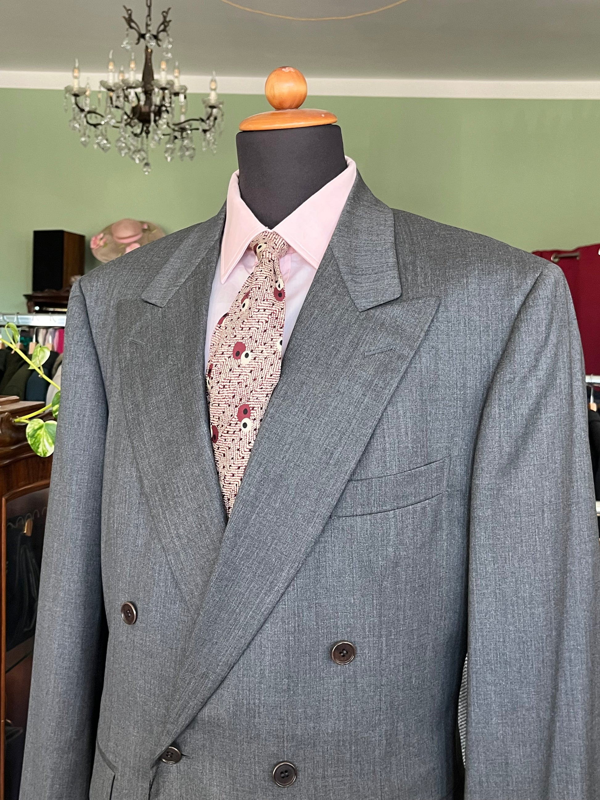 Completo doppiopetto anni ‘80, in pura lana vergine, color grigio medio.