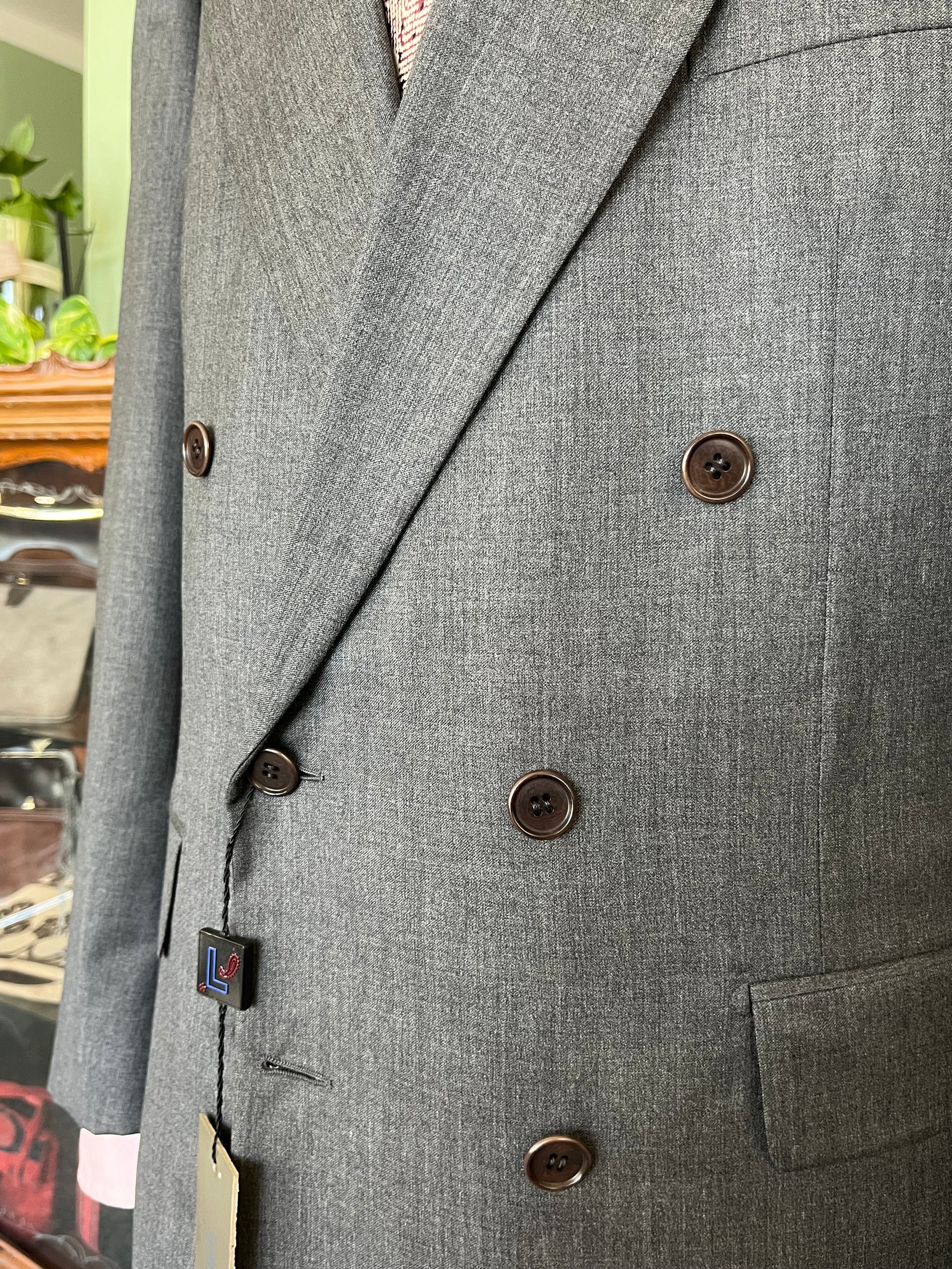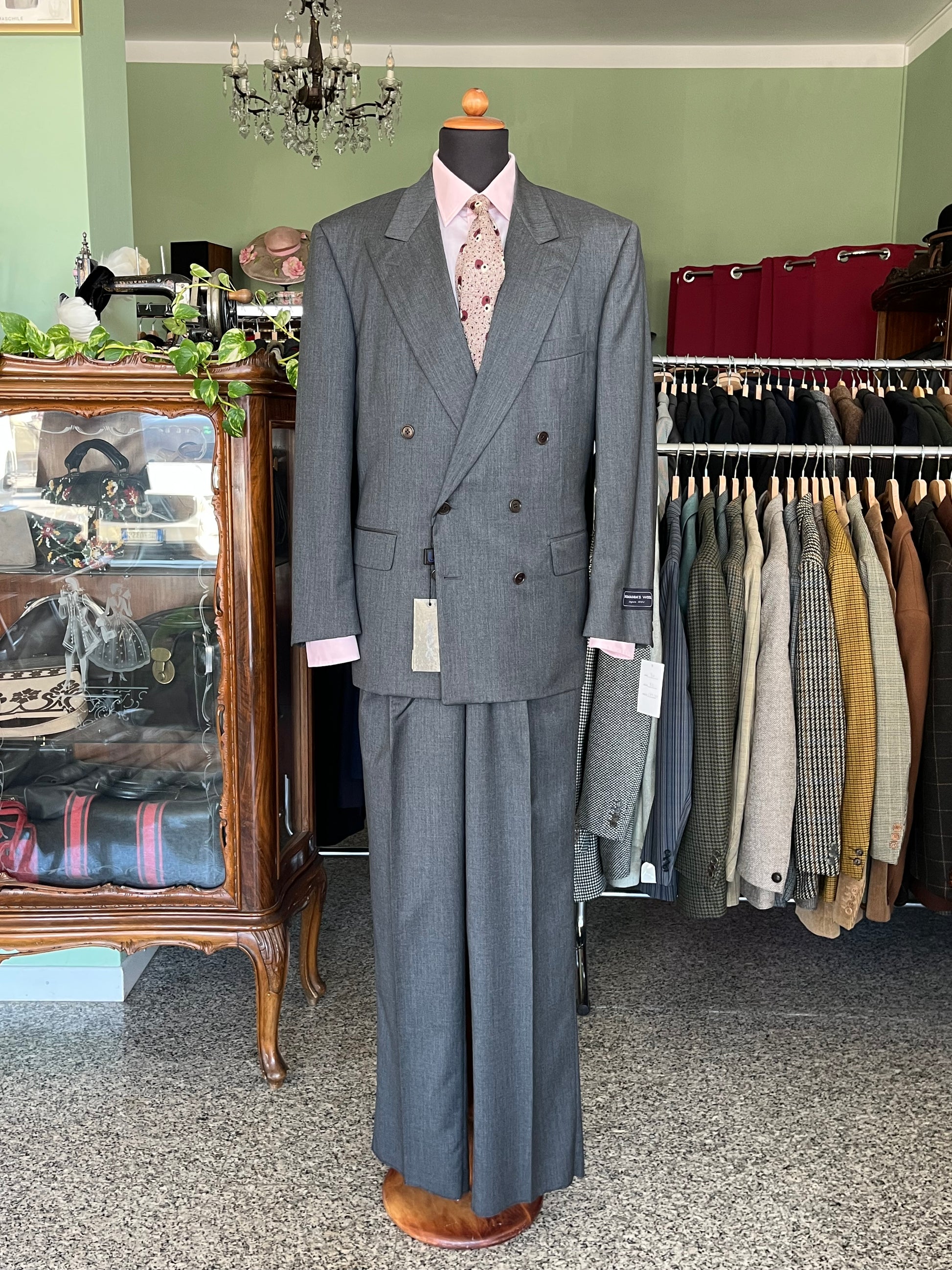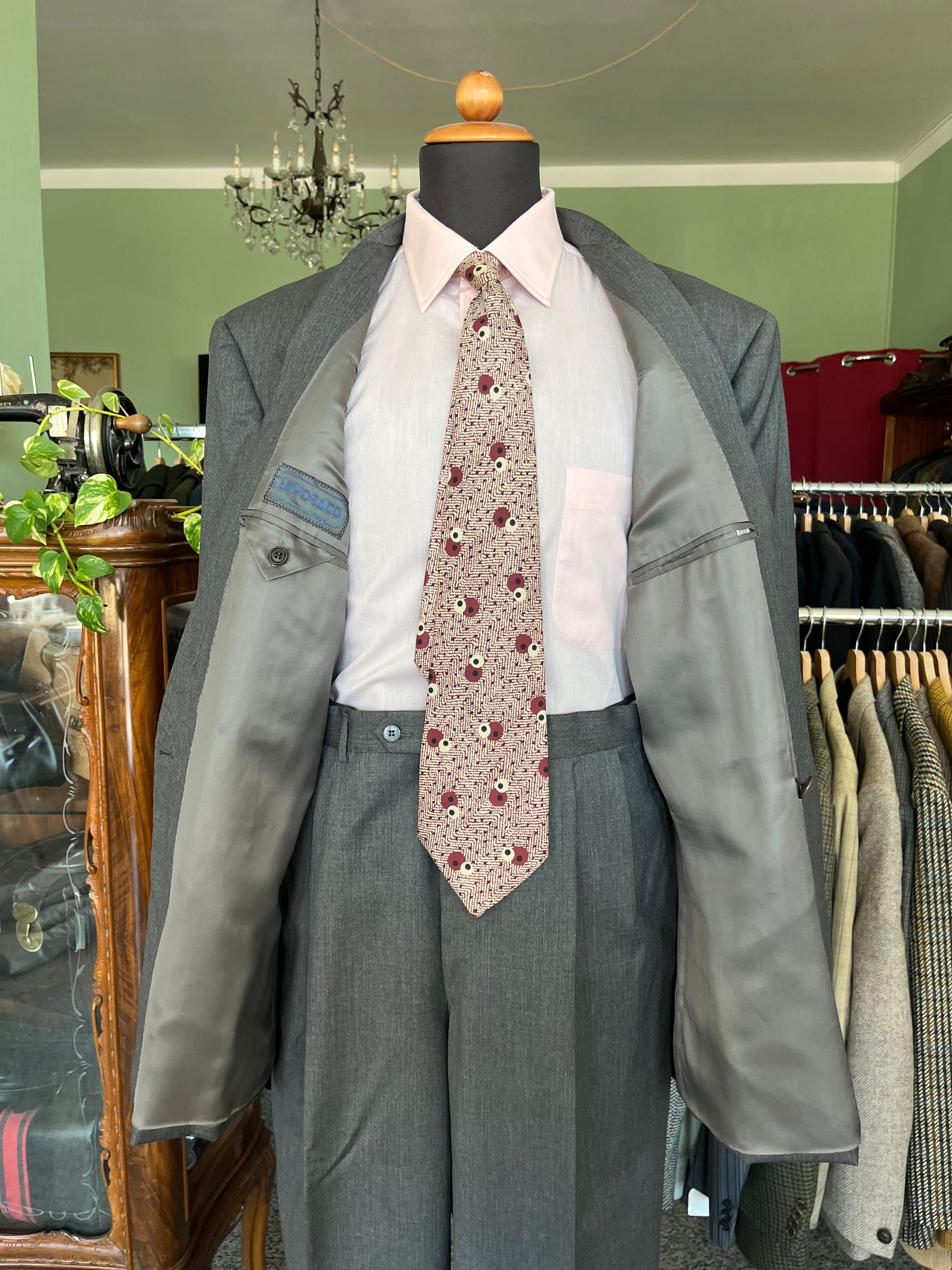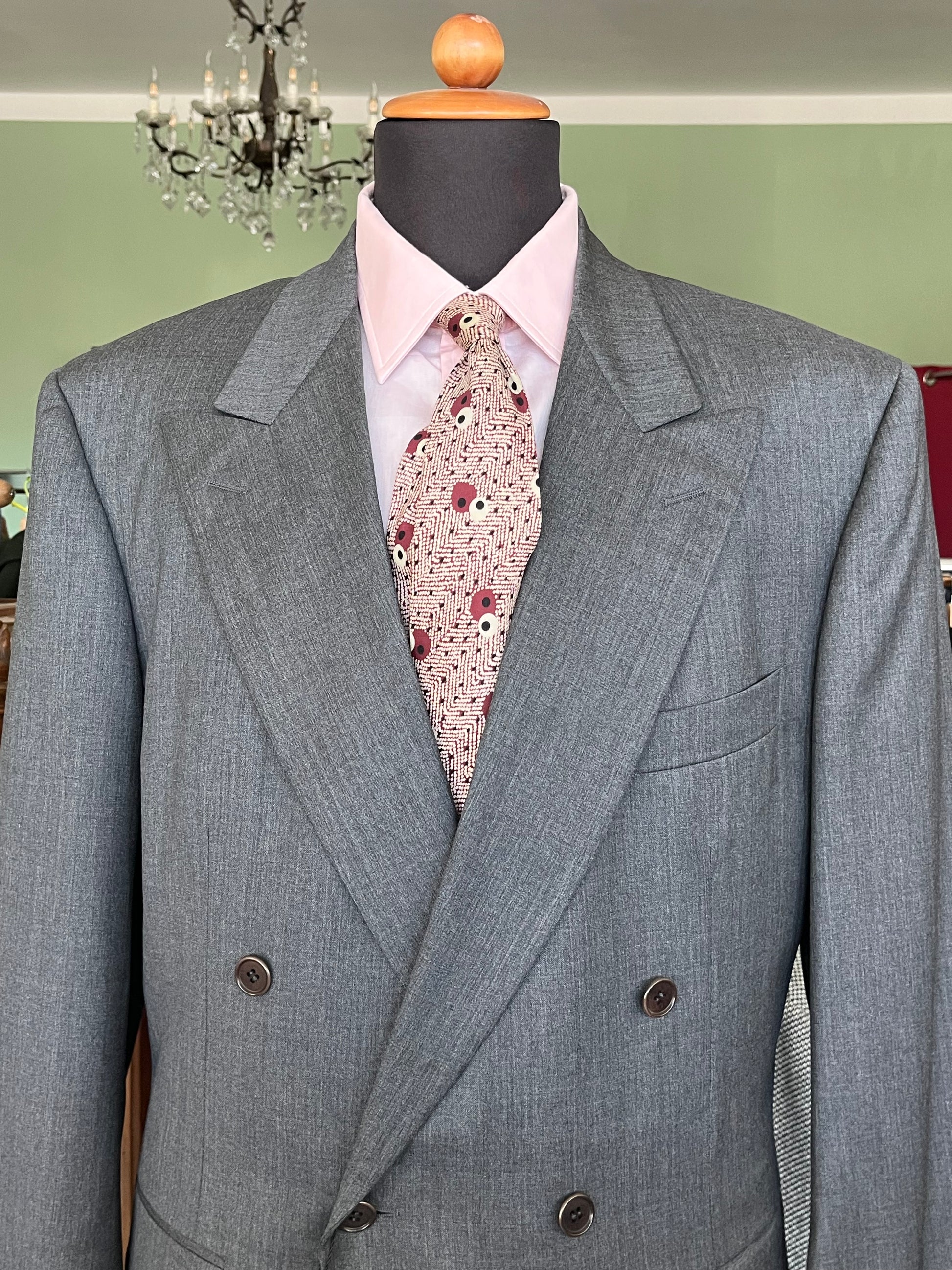 Completo doppiopetto anni ‘80, in pura lana vergine, color grigio medio.