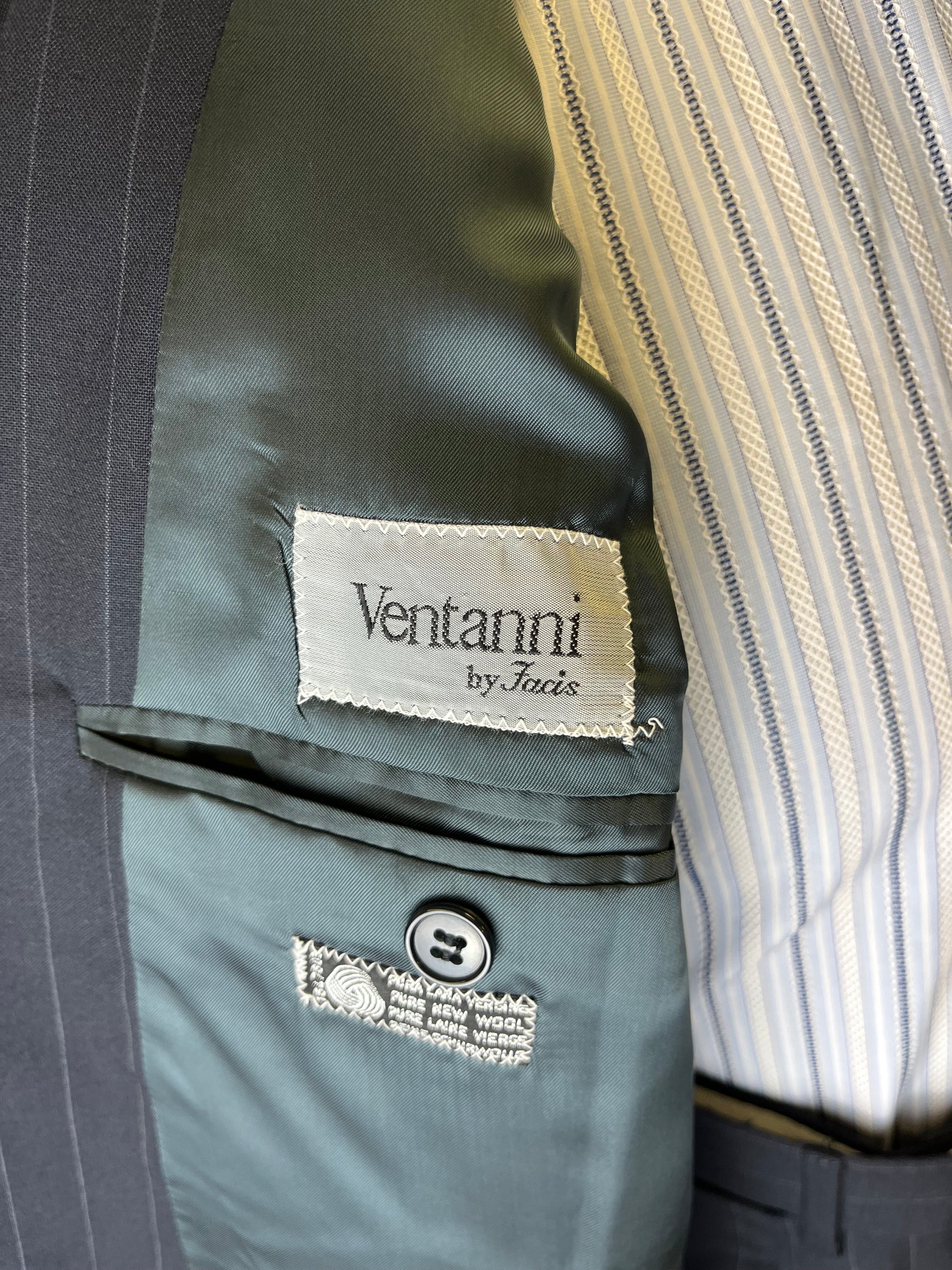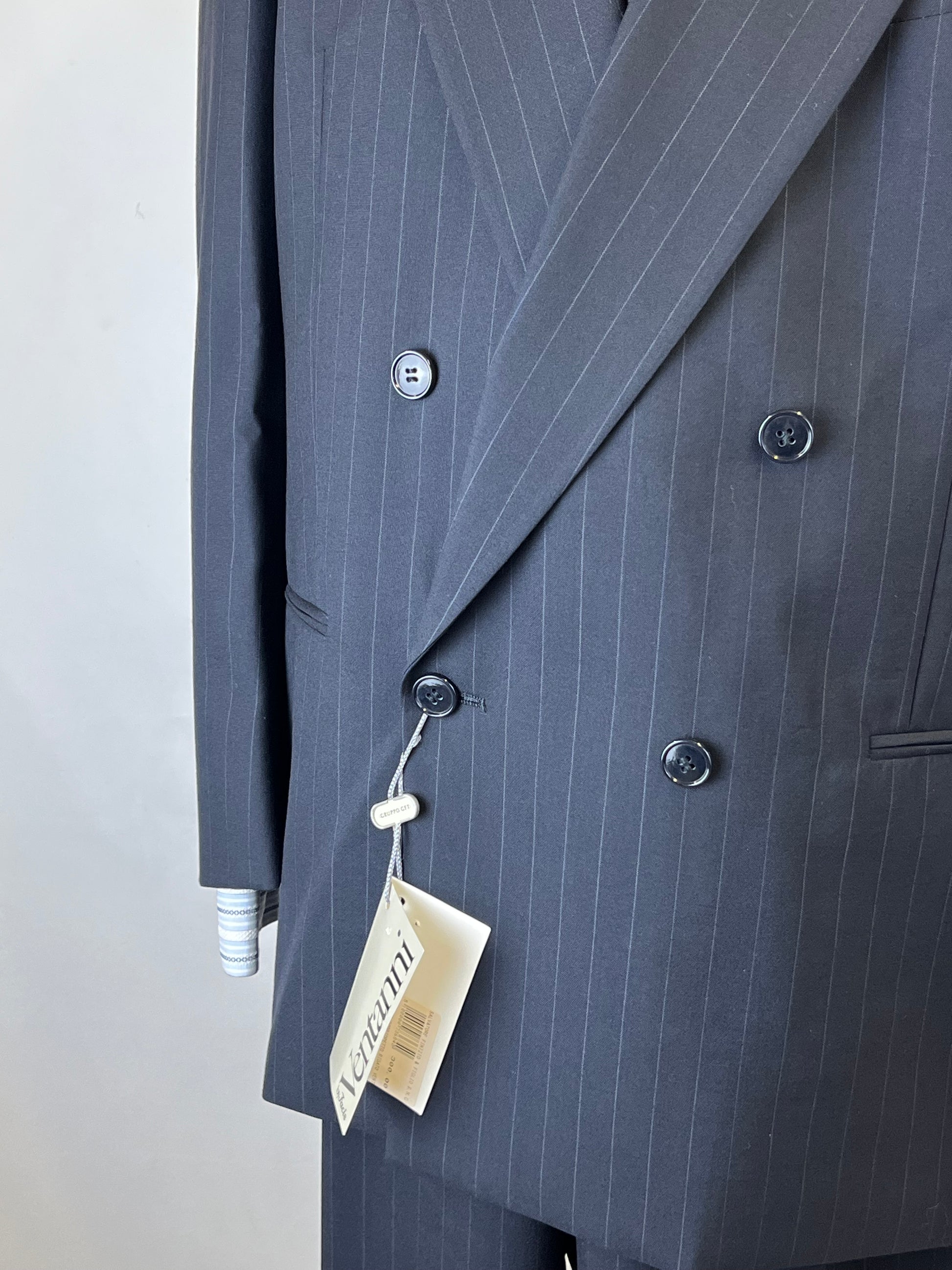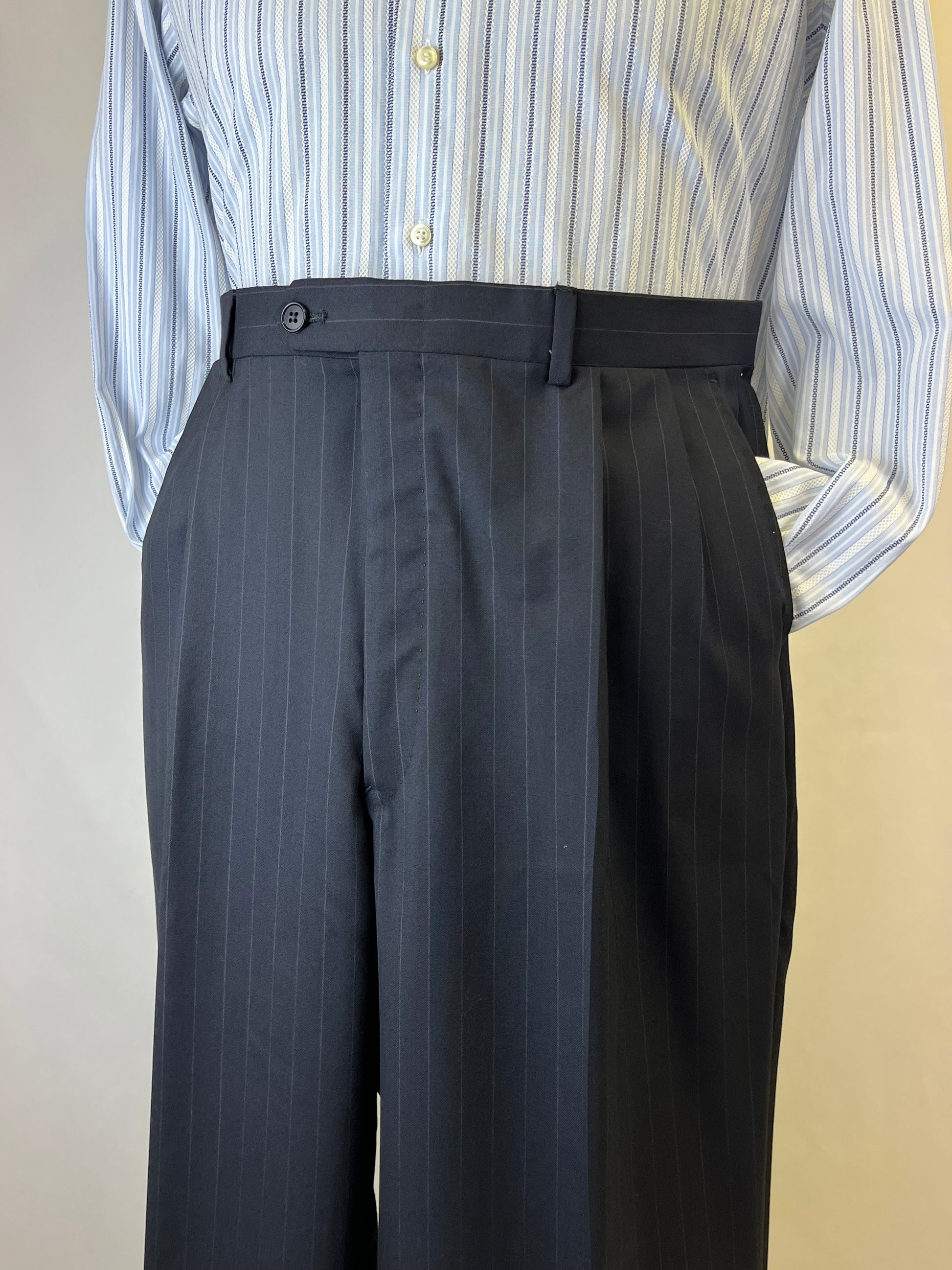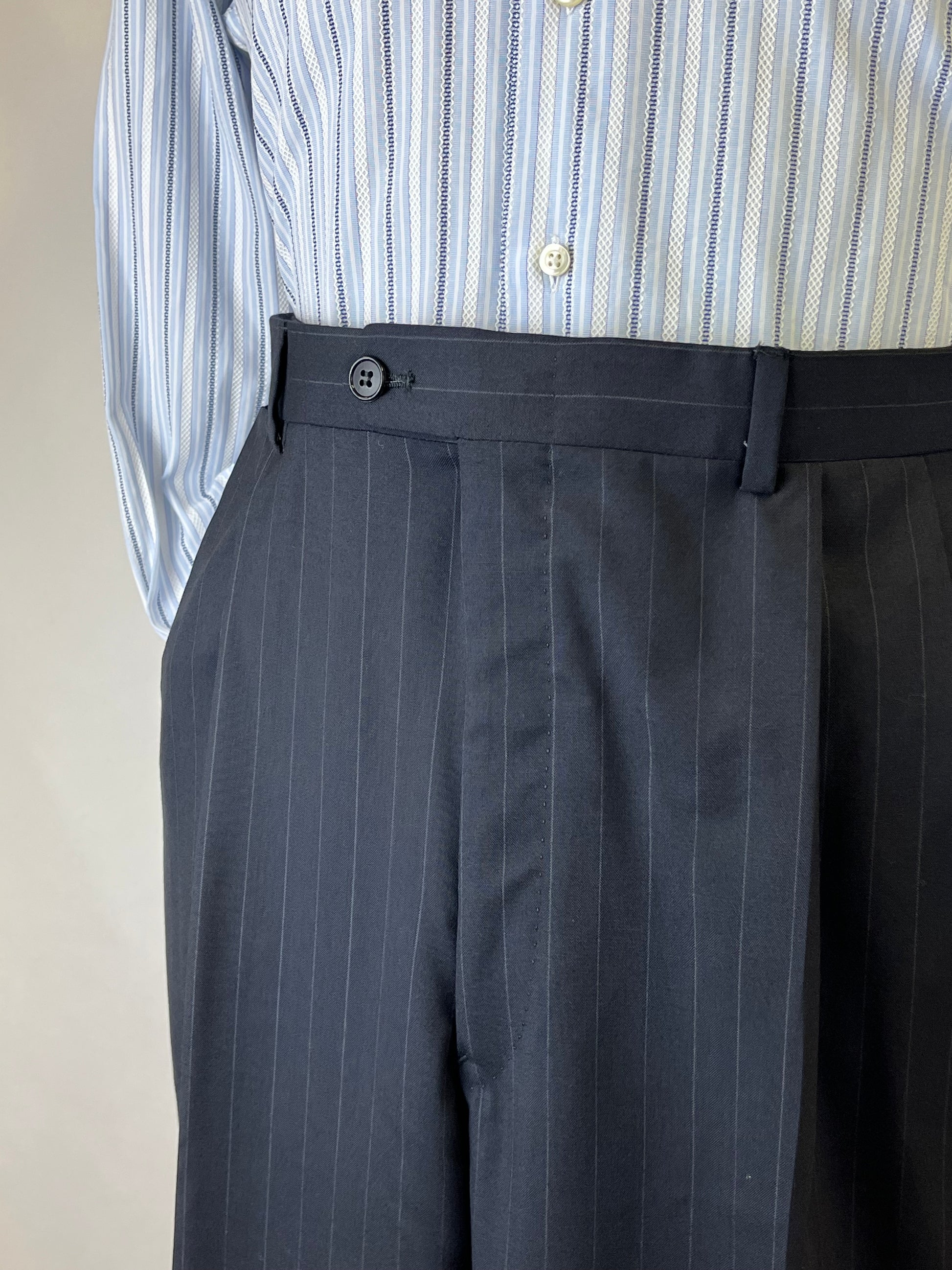 Completo anni ‘80 Facis, linea Ventanni, in pura lana vergine, blu notte gessato.