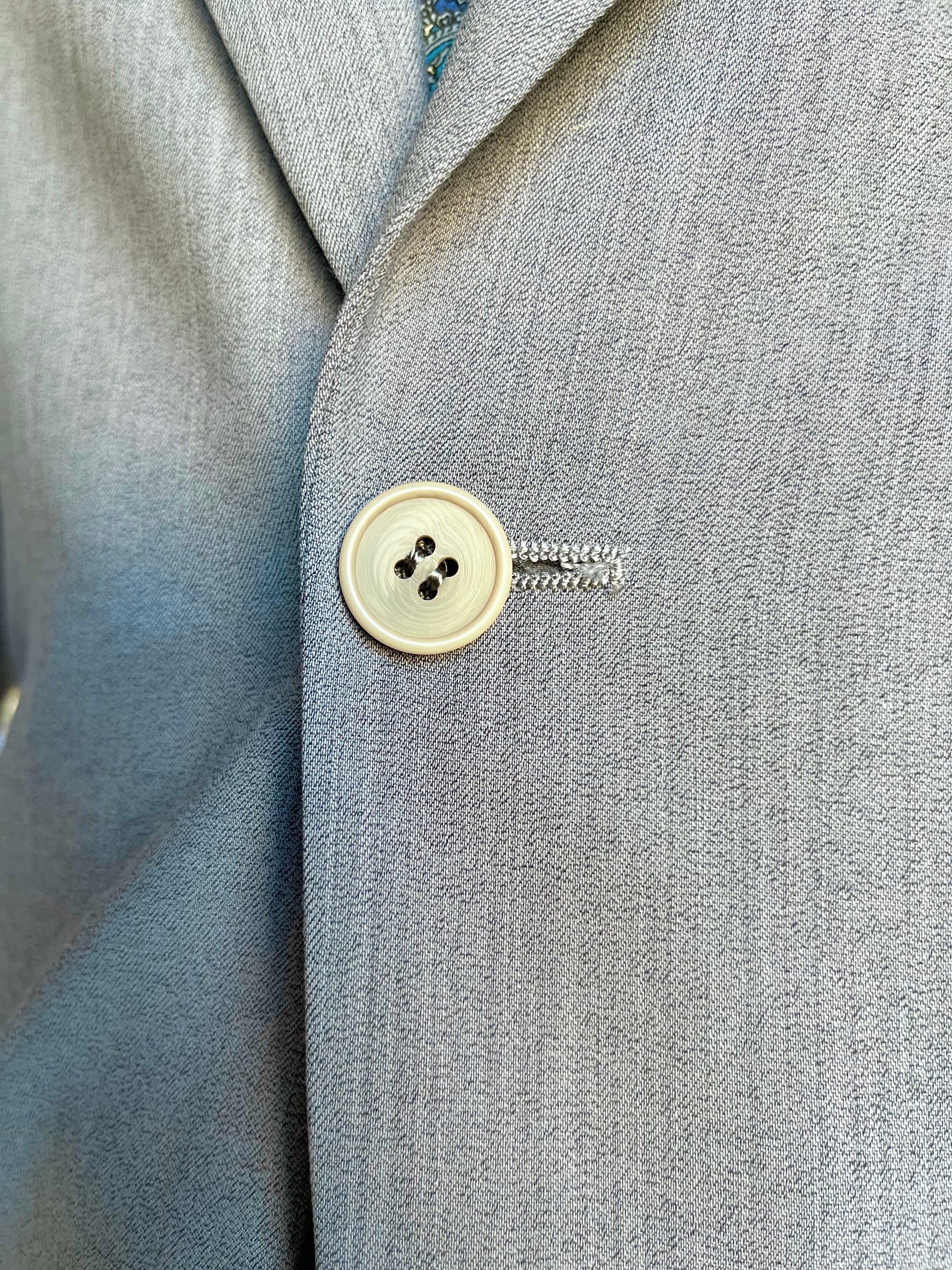La giacca è un monopetto, due bottoni, baveri a dente, tasche a pattina e nessuno spacco sul retro.