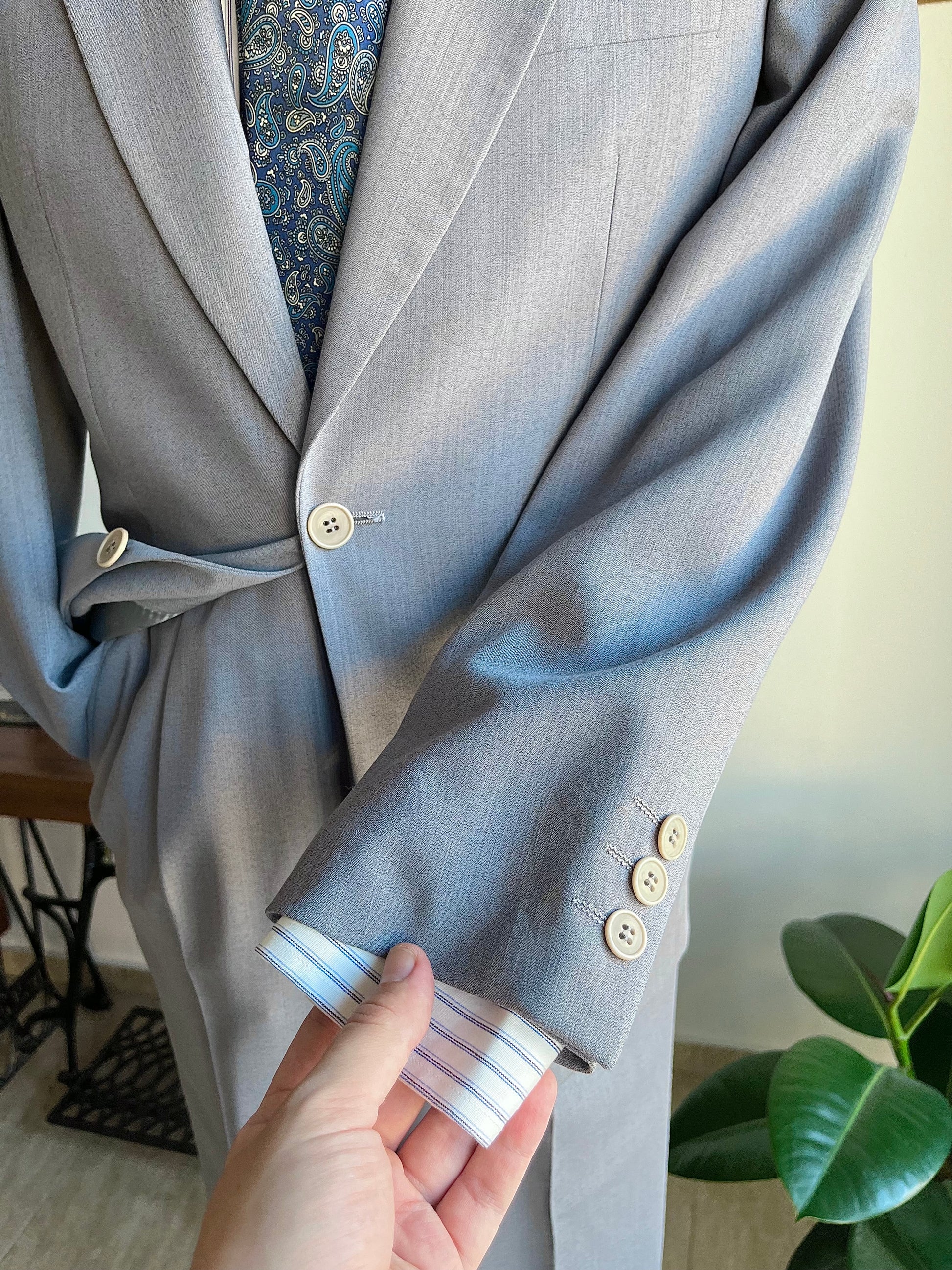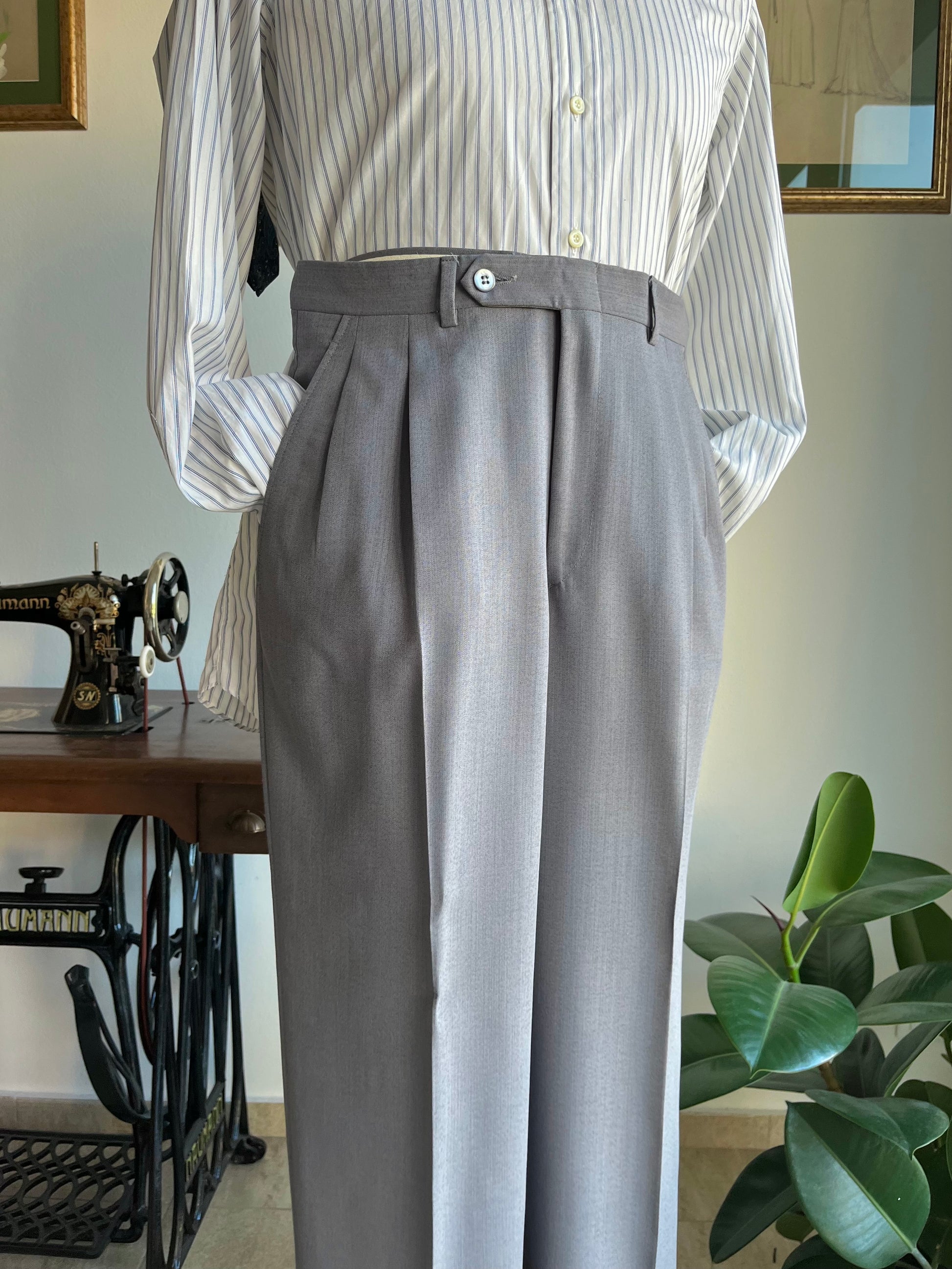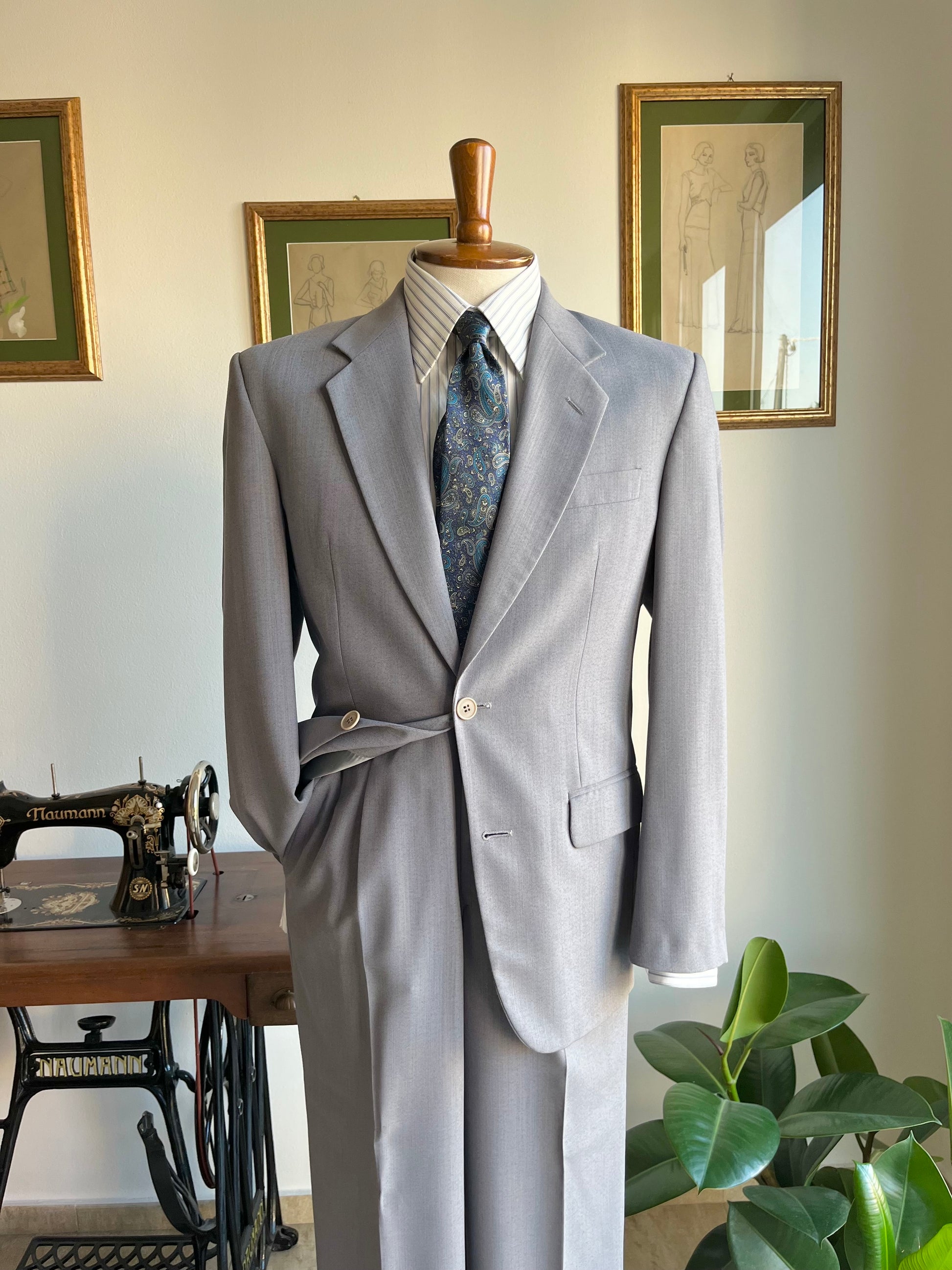 Completo anni ‘80 in puro fresco di lana, colore grigio con sottotono azzurro.