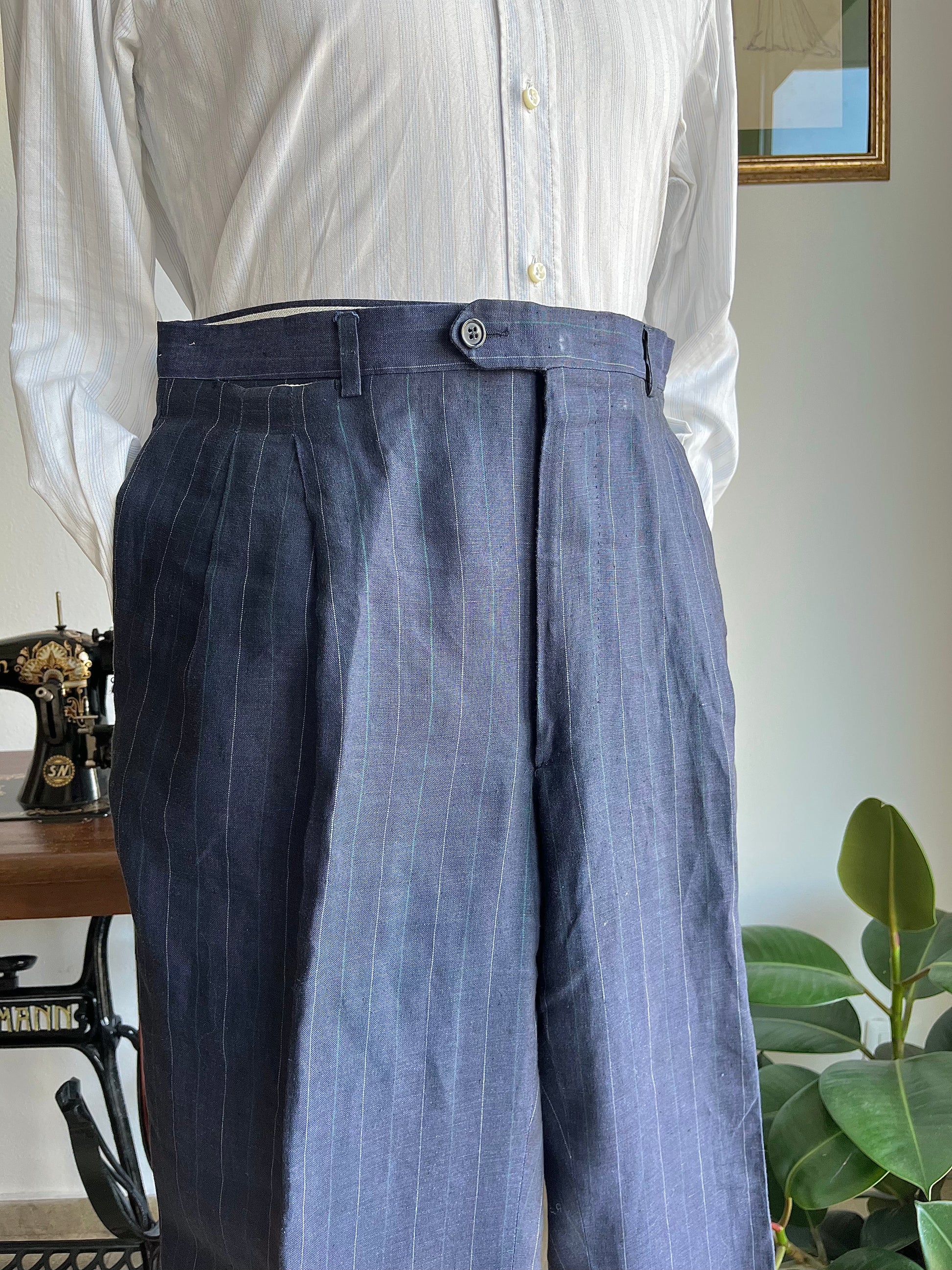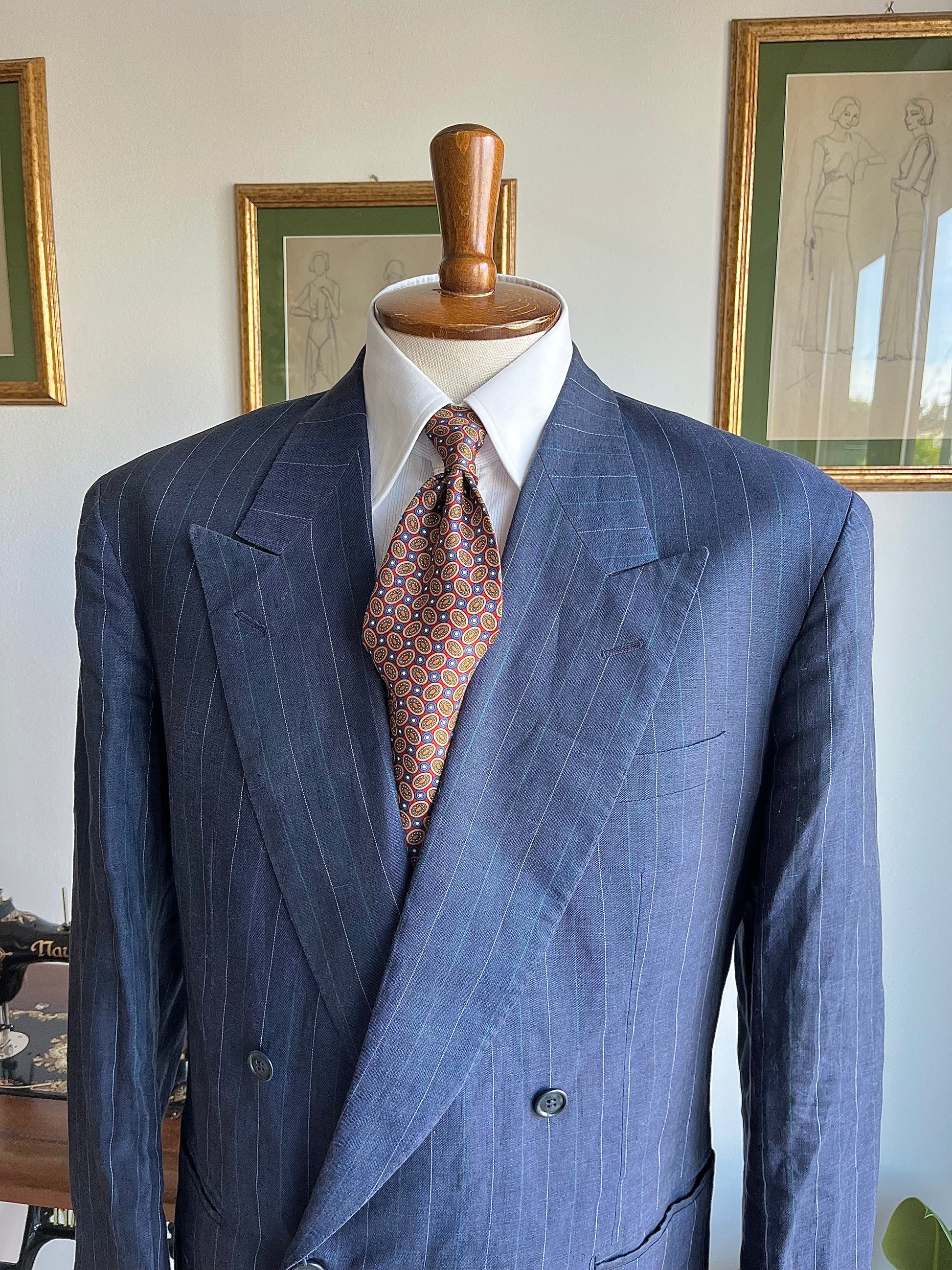 Completo doppiopetto degli anni '80, in 100% lino, color blu notte gessato.