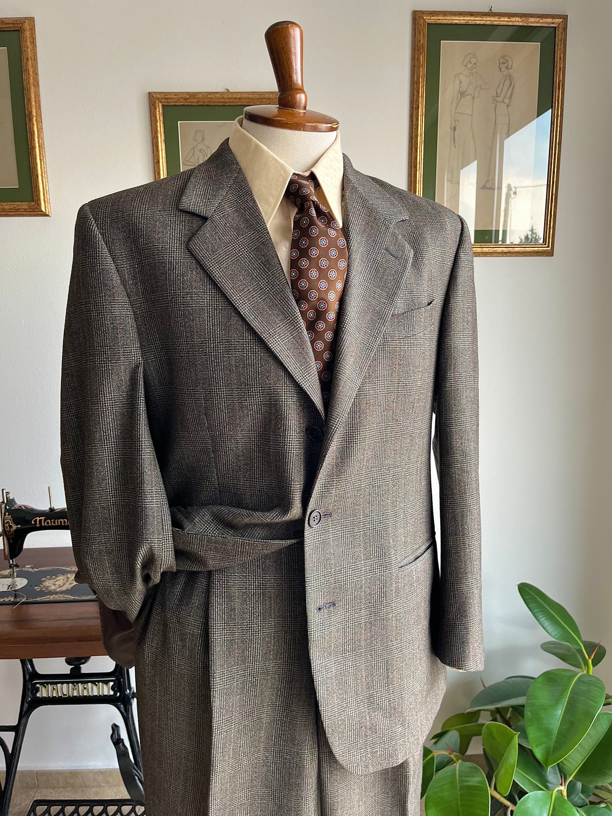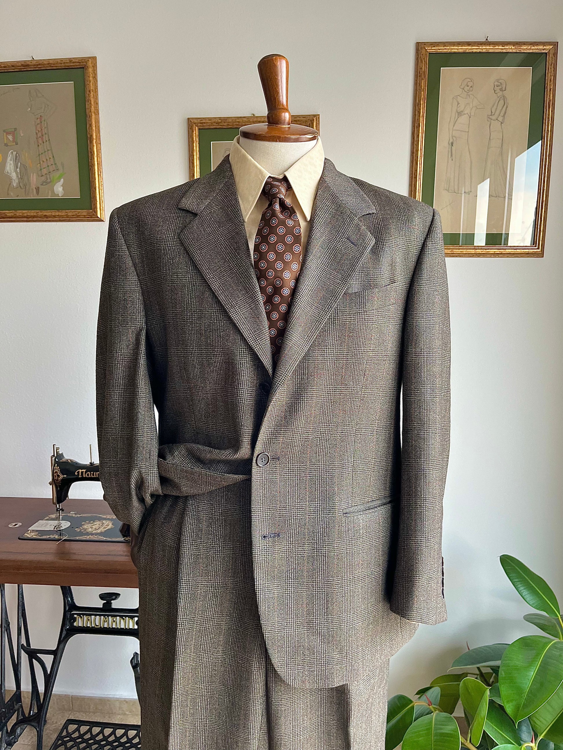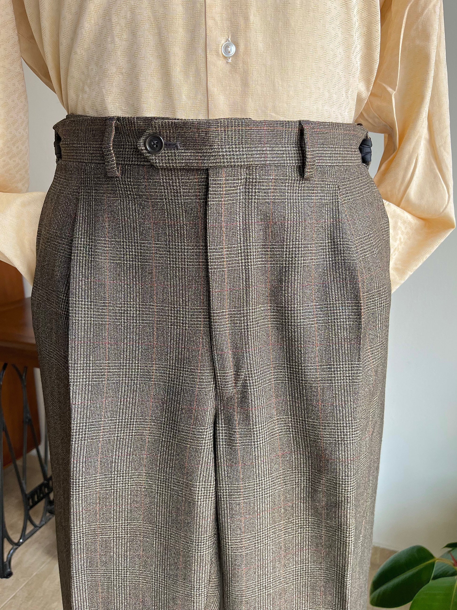 Il tessuto è 100% pura lana molto morbida, con fantasia principe di Galles di colore nocciola.