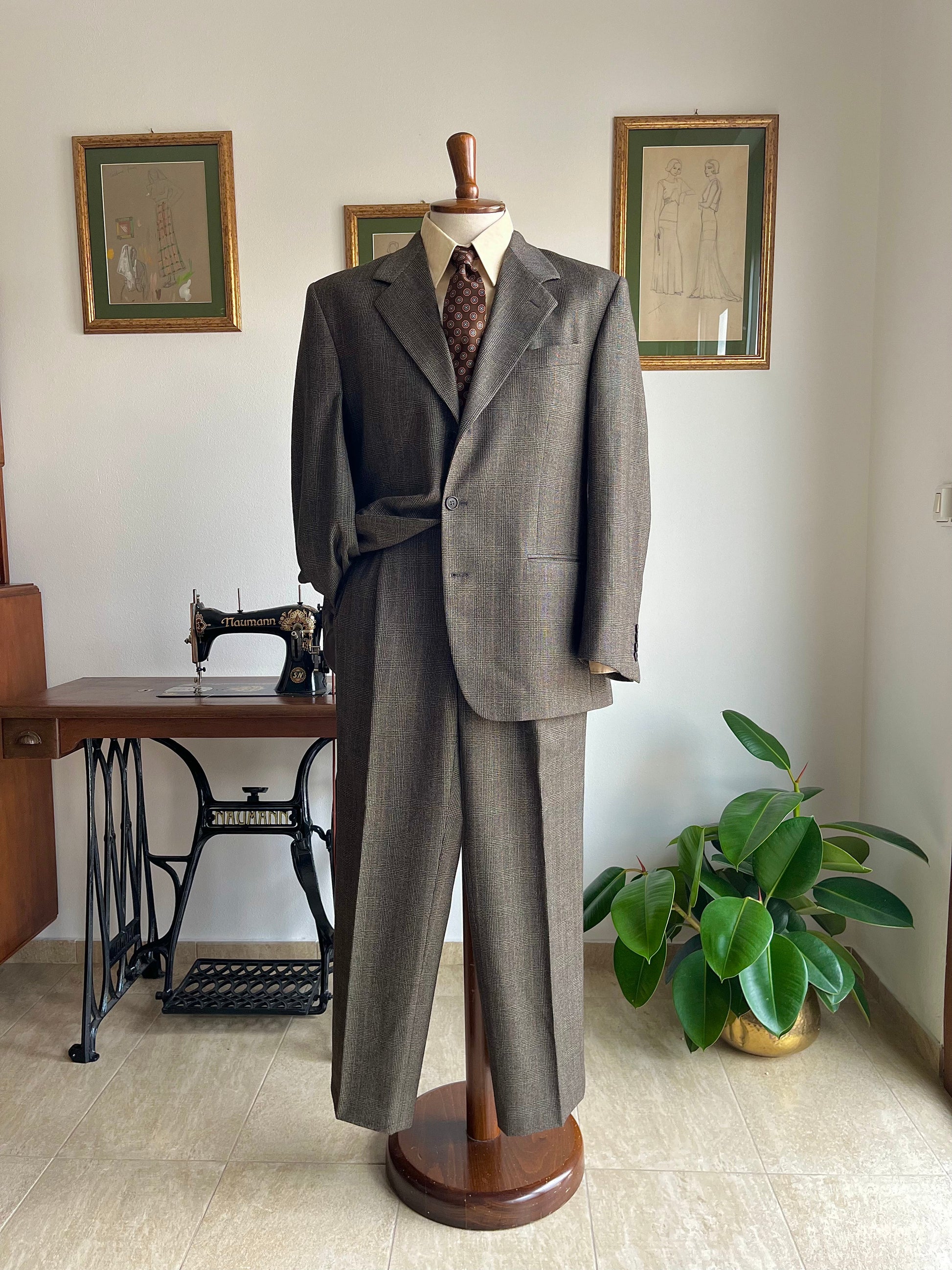La giacca è un monopetto, tre bottoni, baveri a dente, tasche a pattina convertibili a filetto e doppio spacco sul retro.