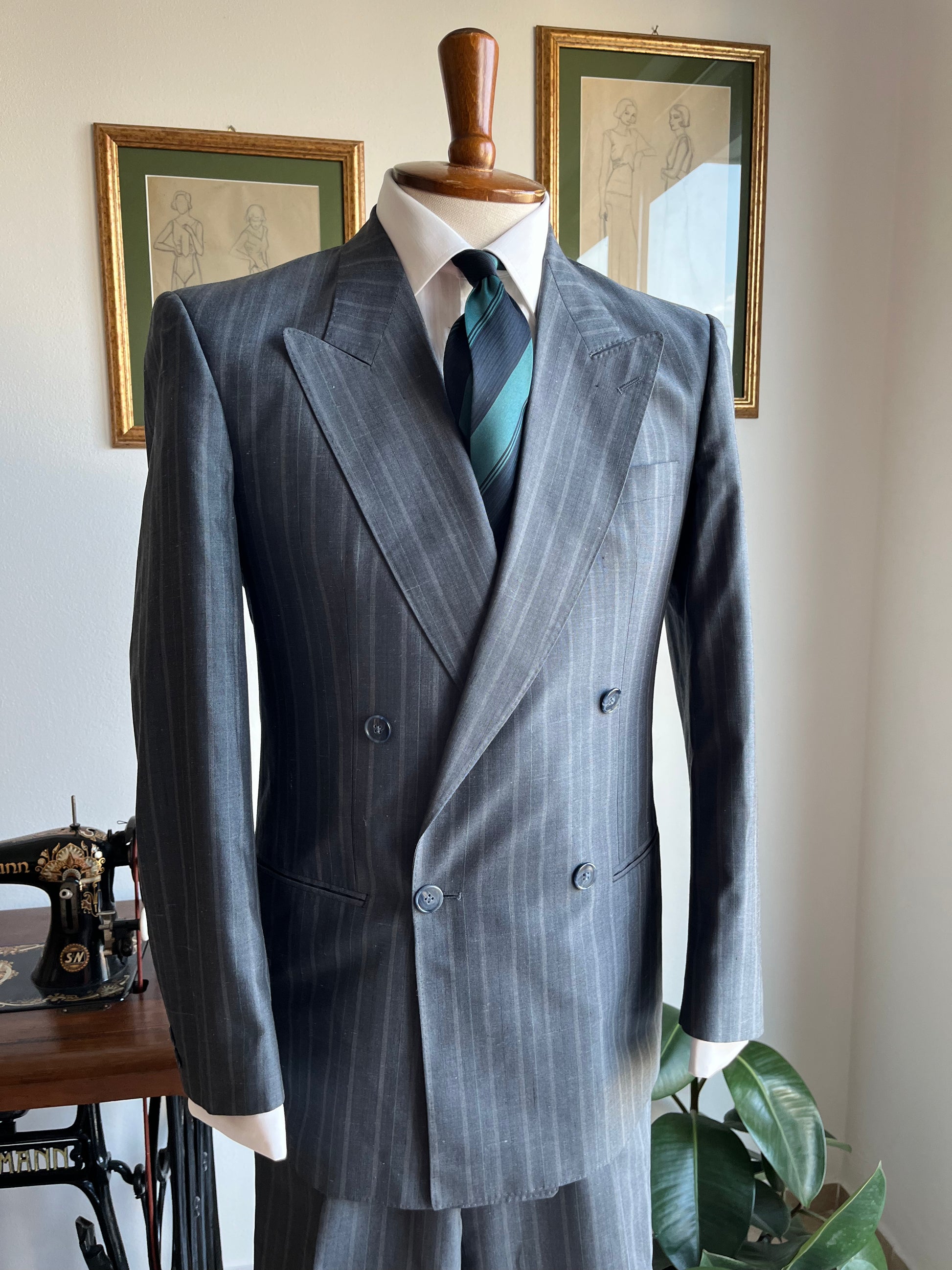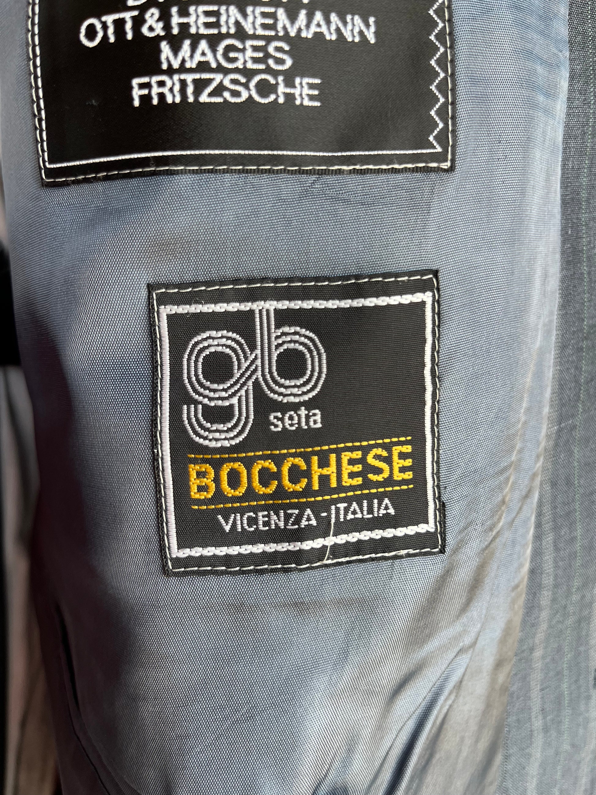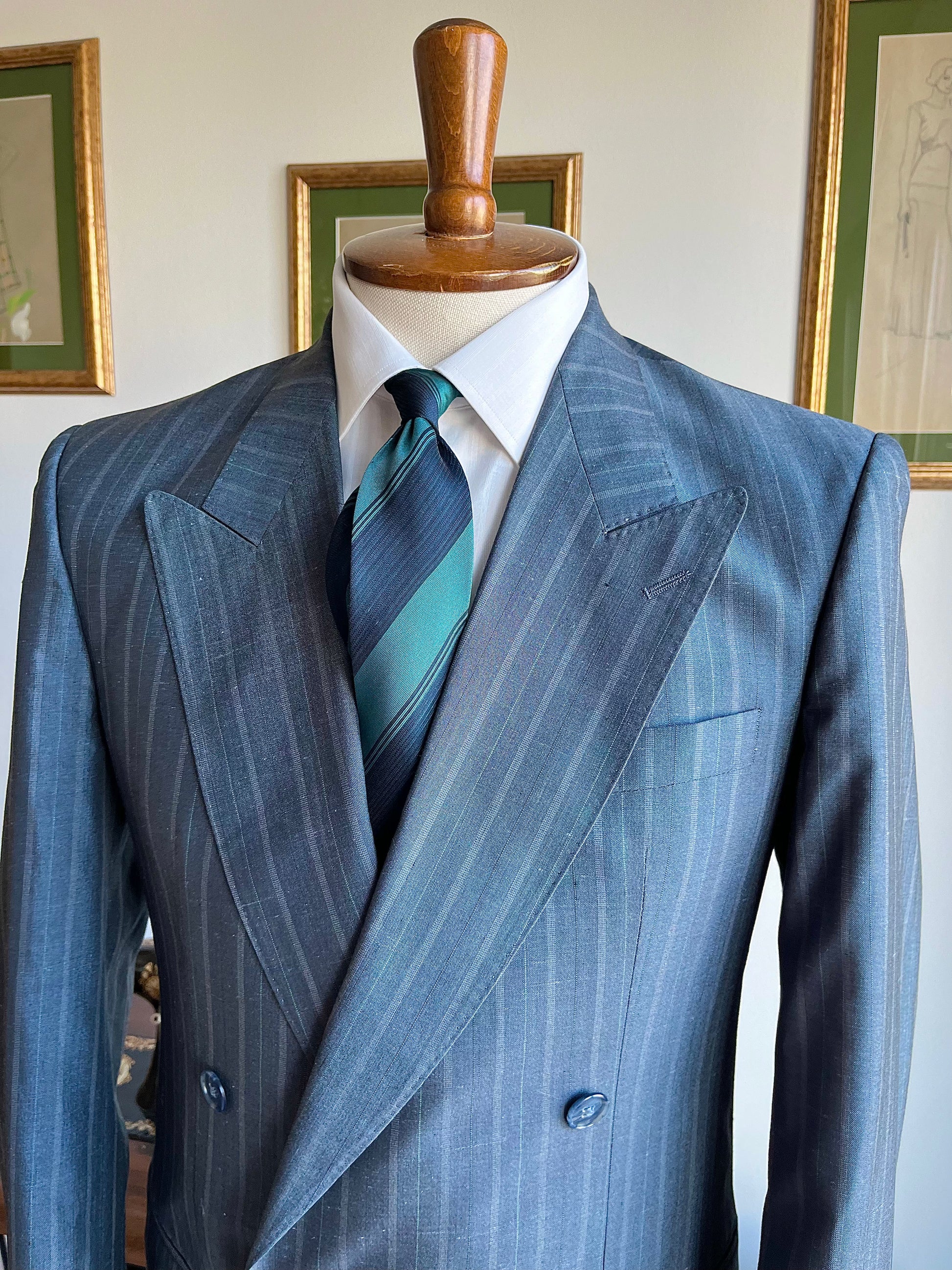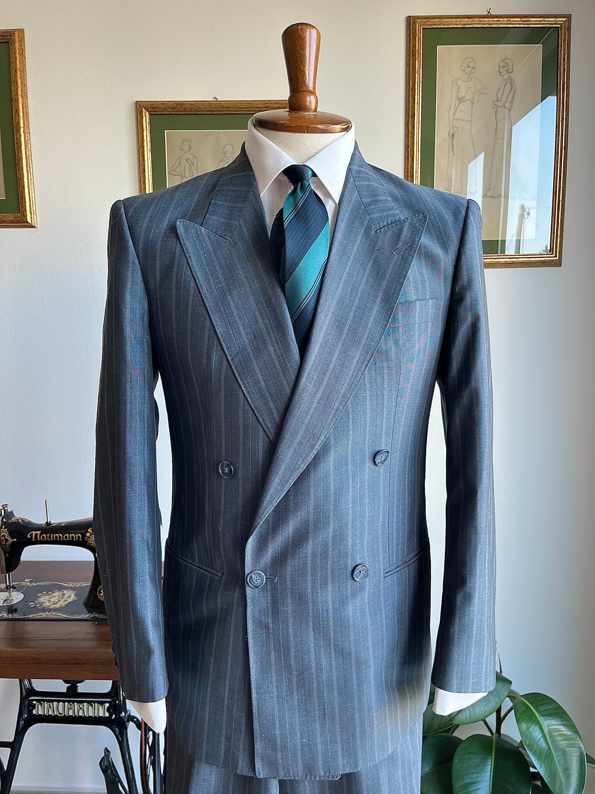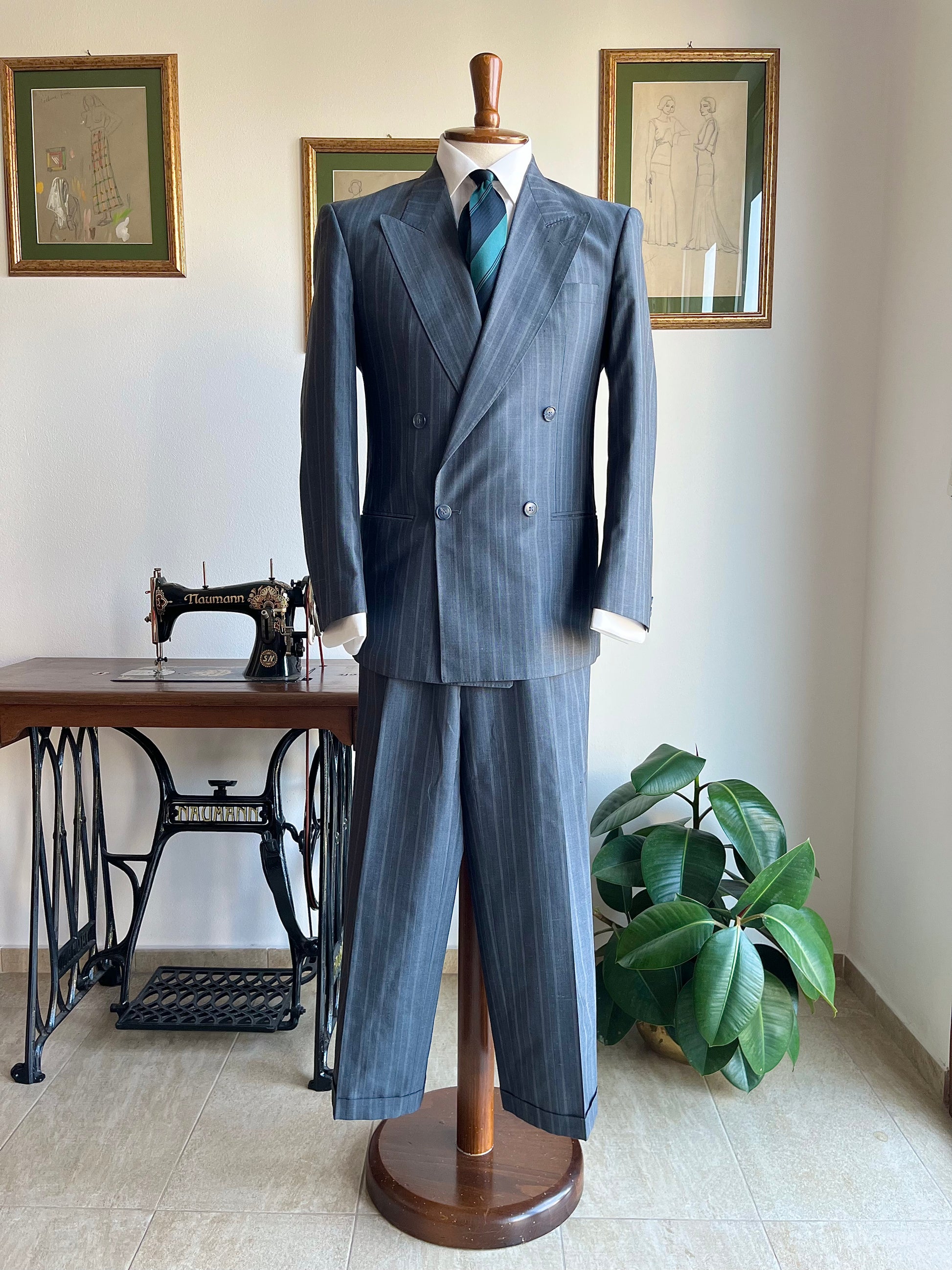Il tessuto è un misto seta e Lino di produzione veneta, blu/grigio gessato.