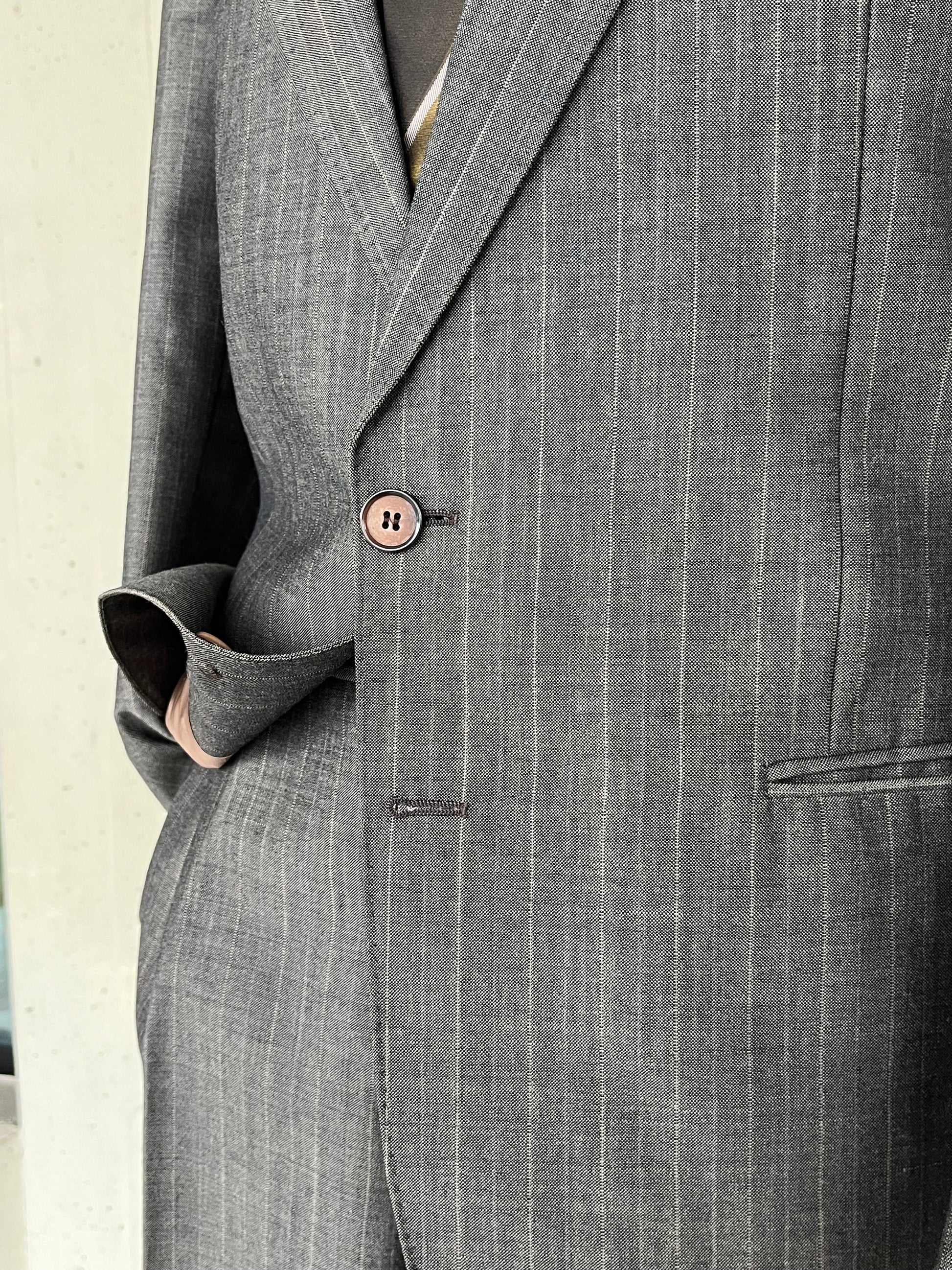 La giacca è un monopetto, due bottoni, baveri a dente e tasche a filetto.