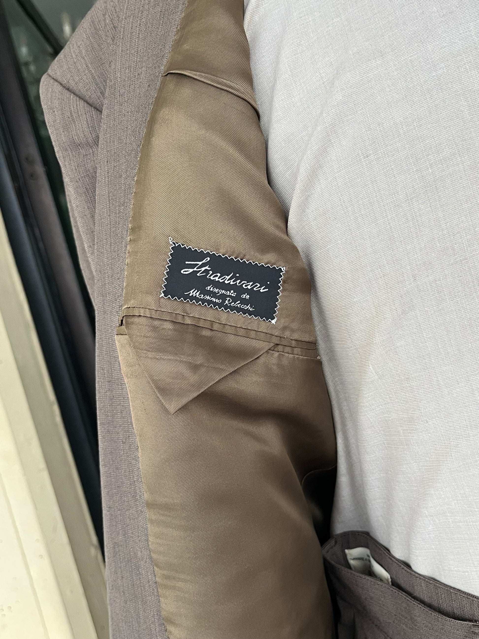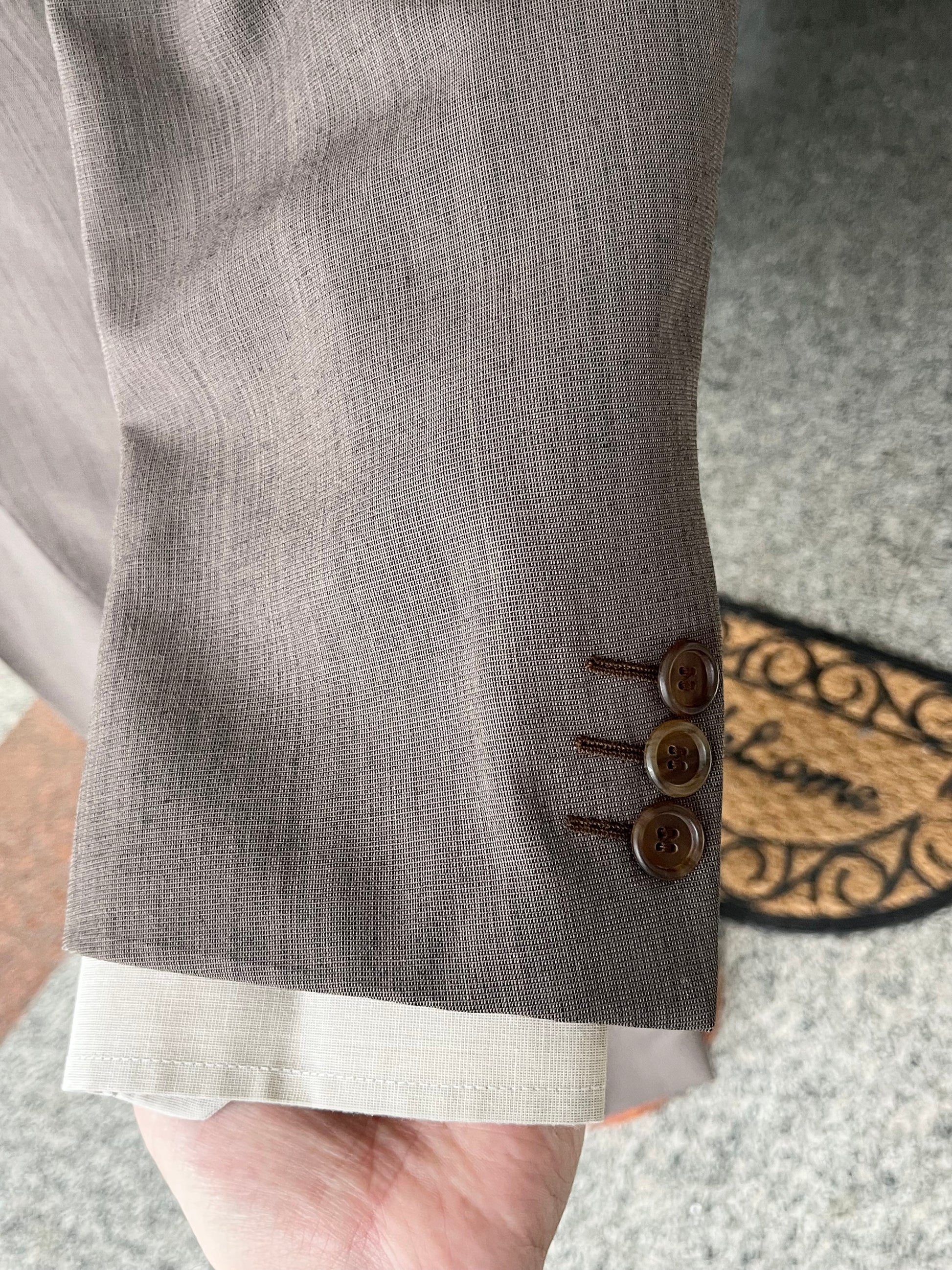 La giacca è un monopetto, due bottoni, baveri a dente, tasche a filetto e doppio spacco sul retro. È inoltre semi-sfoderata.