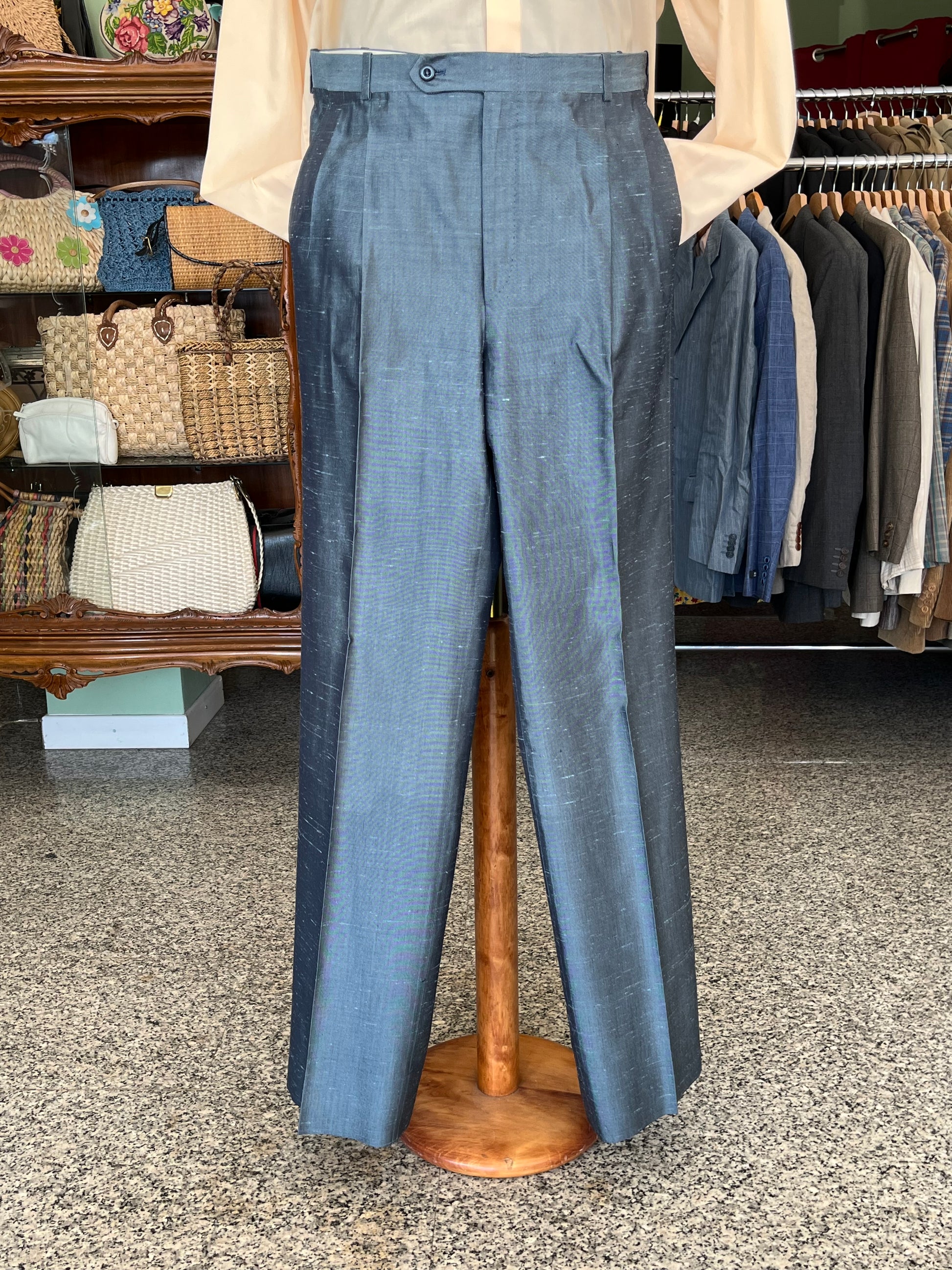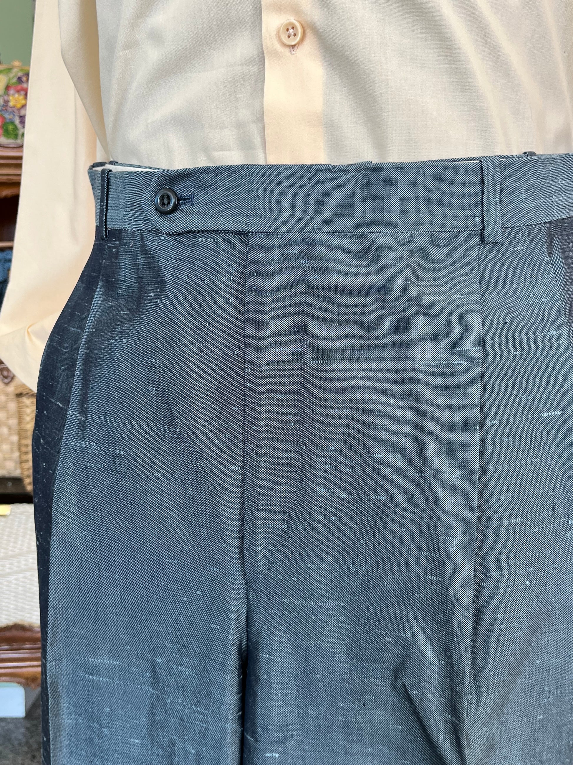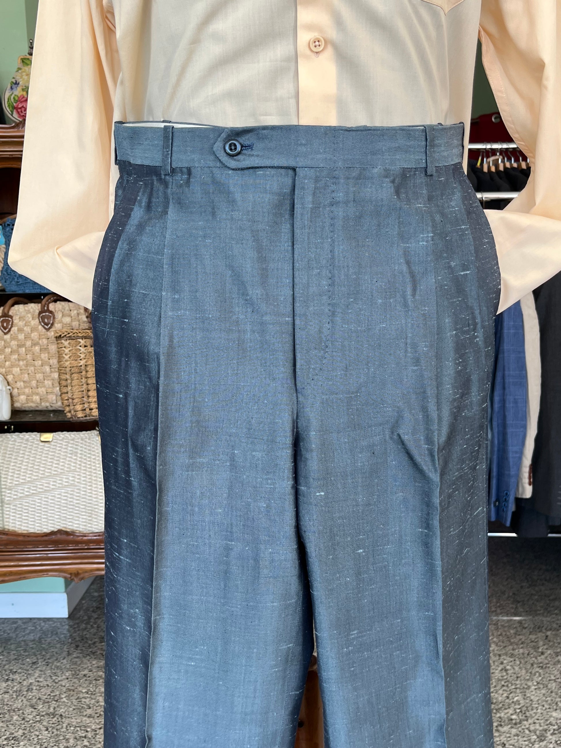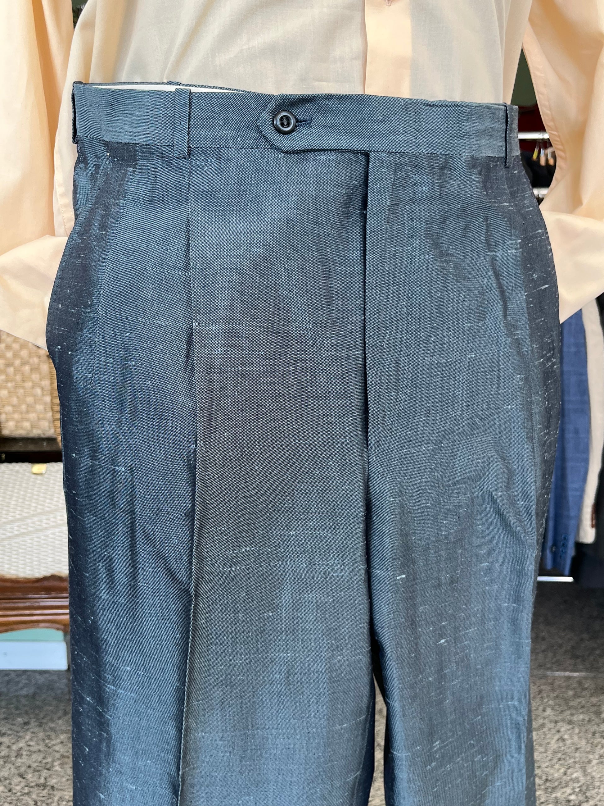 I calzoni hanno un taglio classico, a vita alta, doppia piega in vita e gamba svasata (come in voga nei primi anni ‘80).