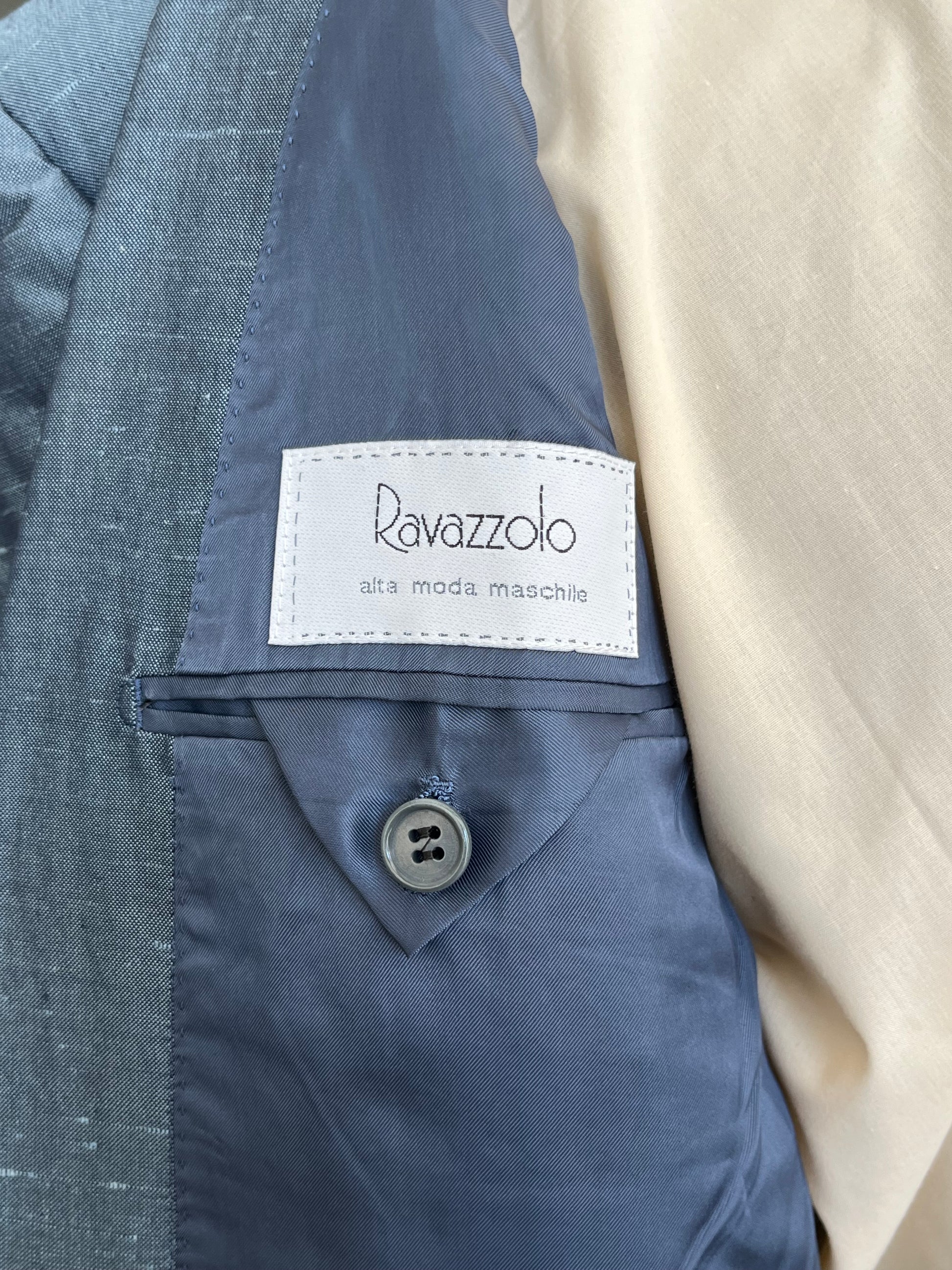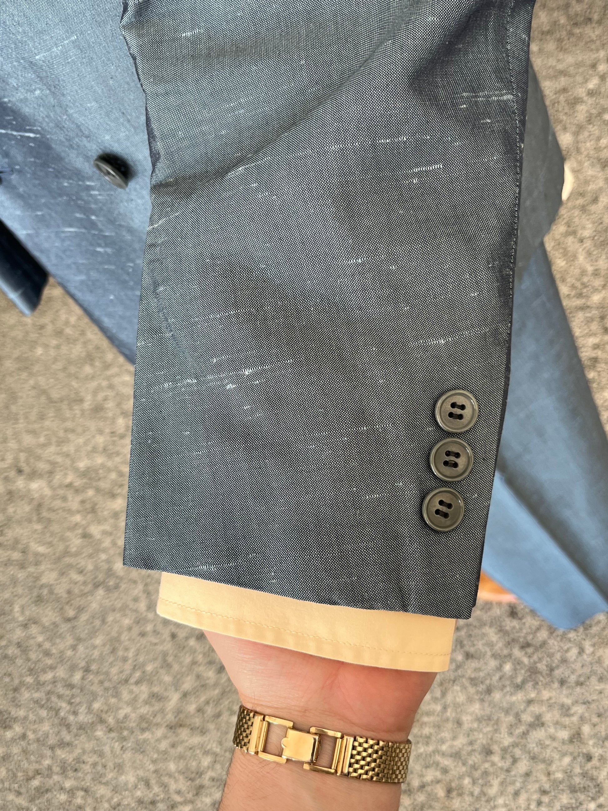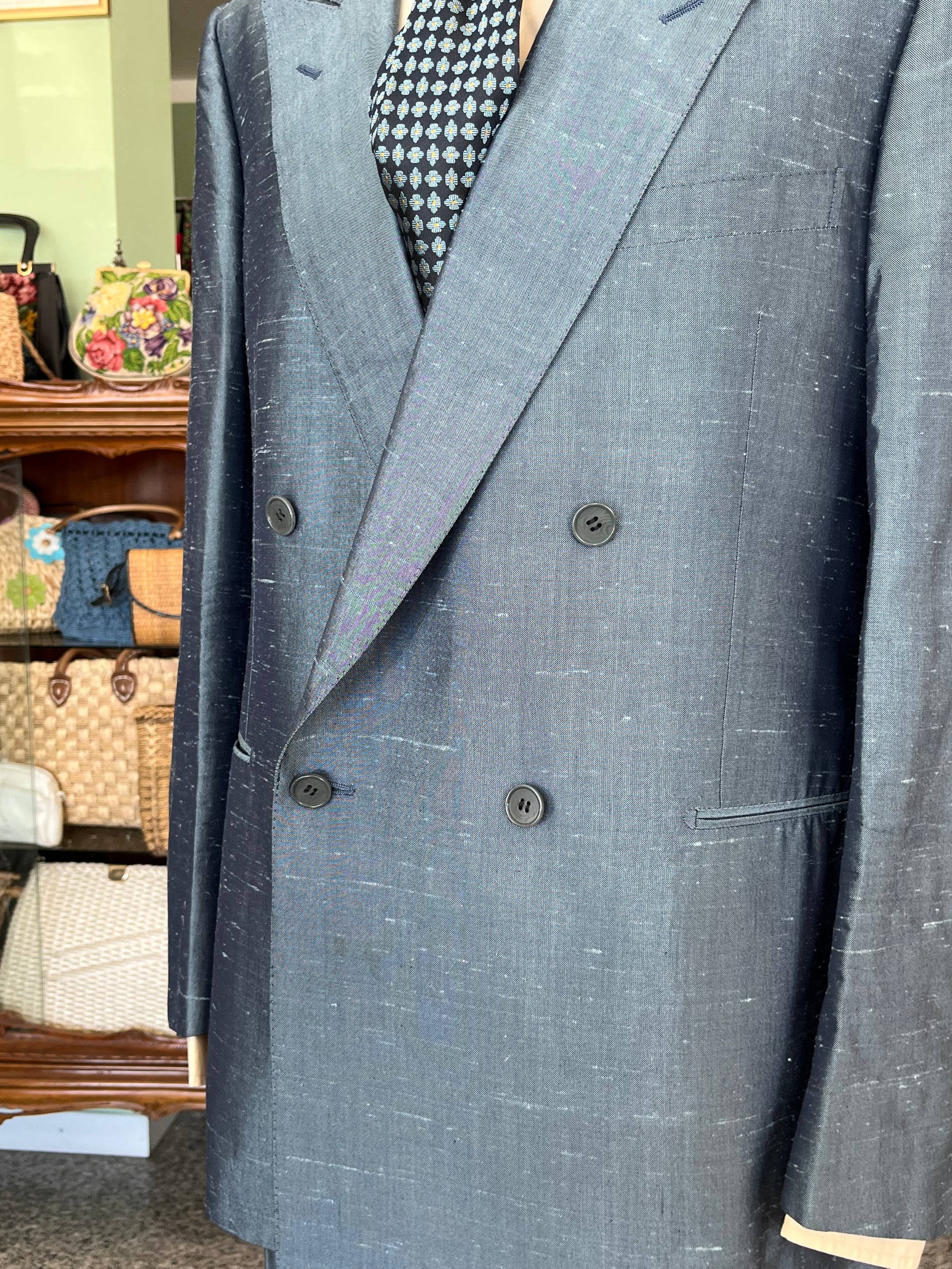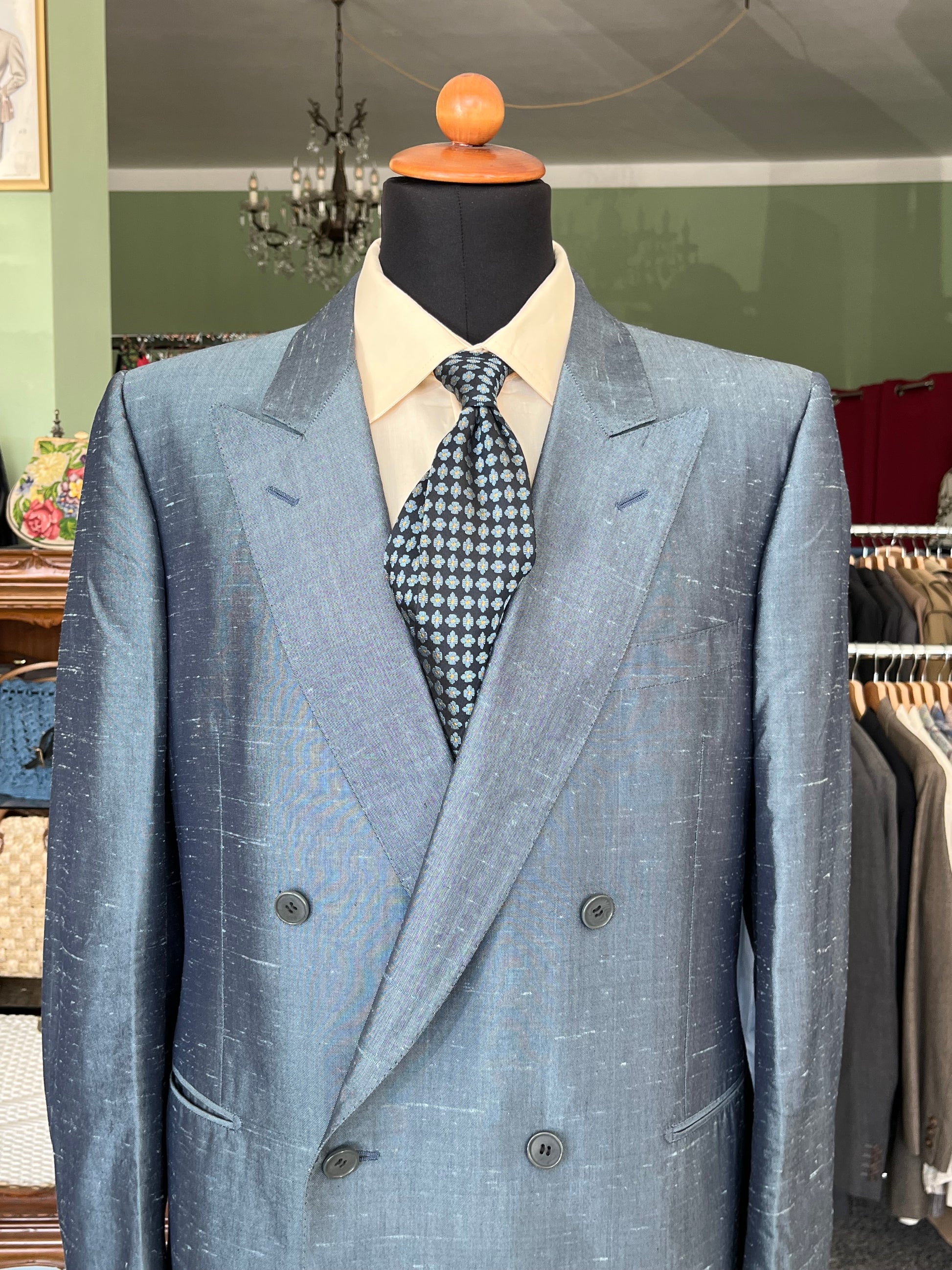 La giacca è un doppiopetto, abbottonatura 4x1, baveri a lancia e tasche a filetto.