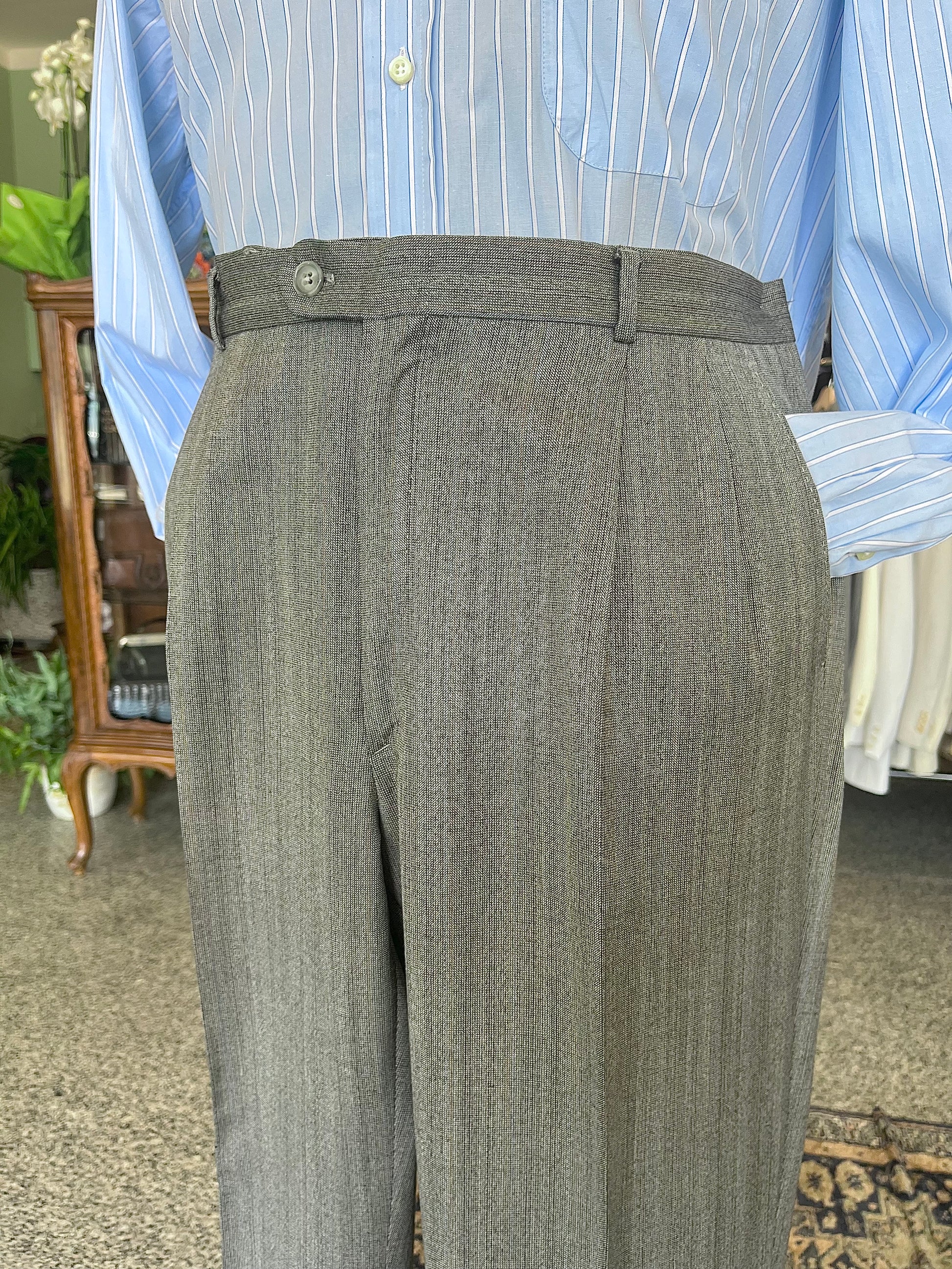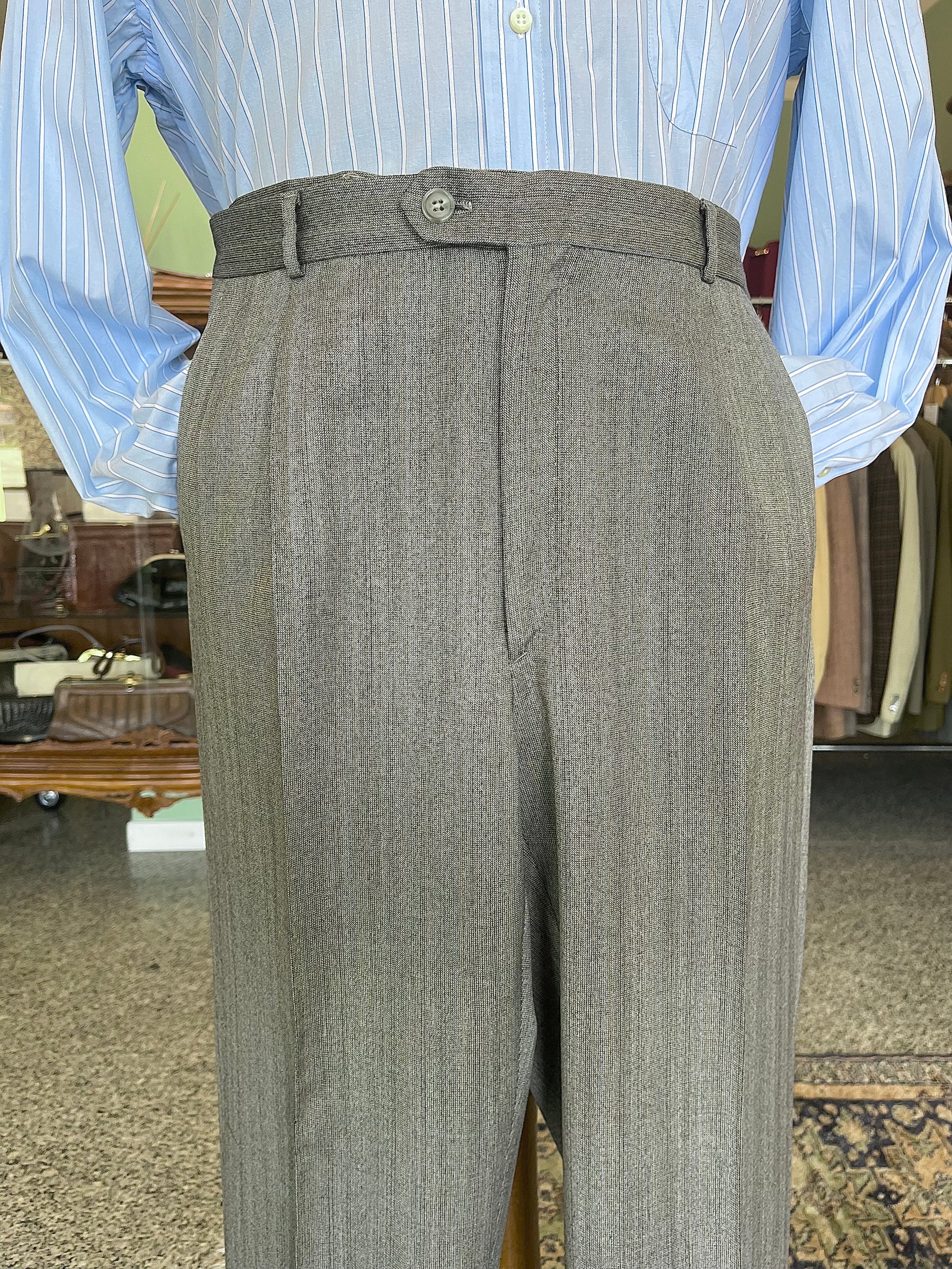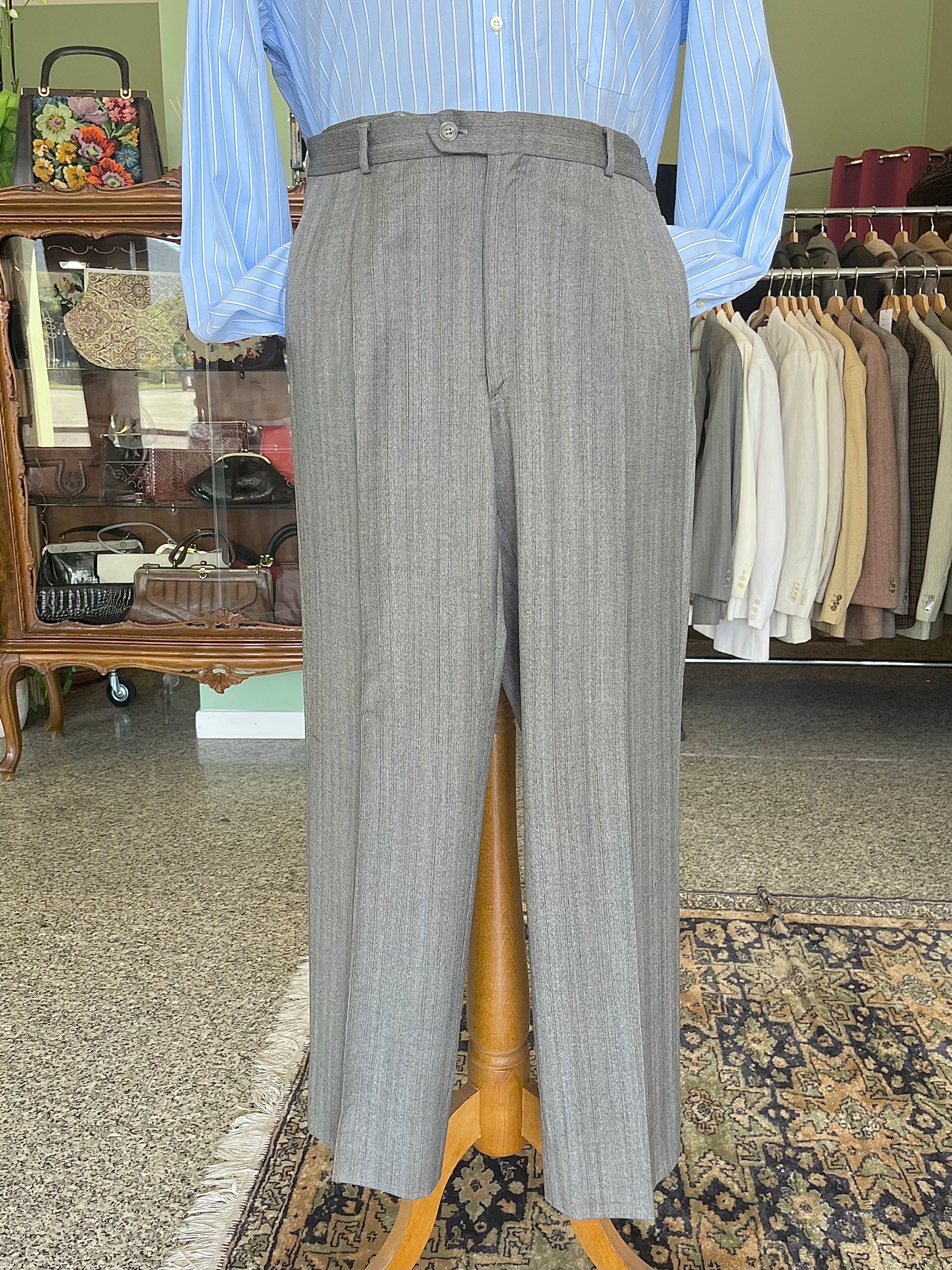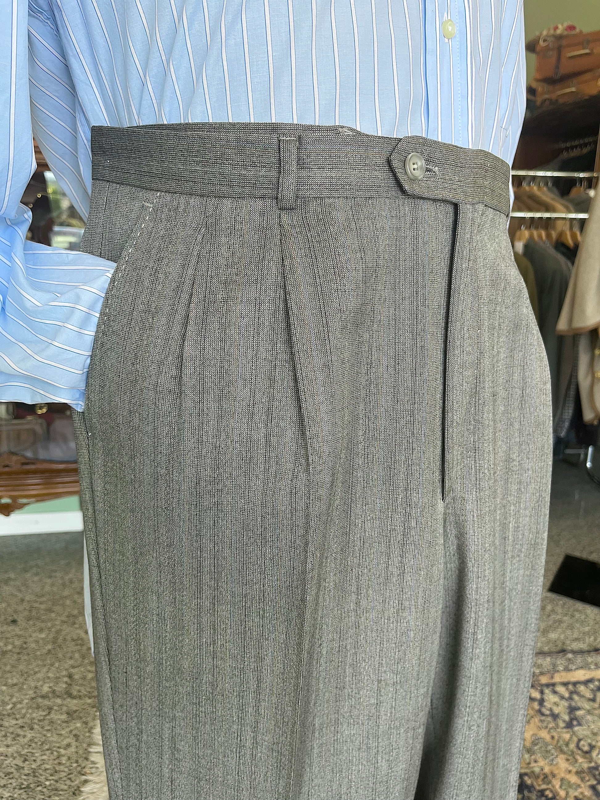I calzoni hanno un taglio classico, a vita alta, con doppia piega in vita e gamba dritta.