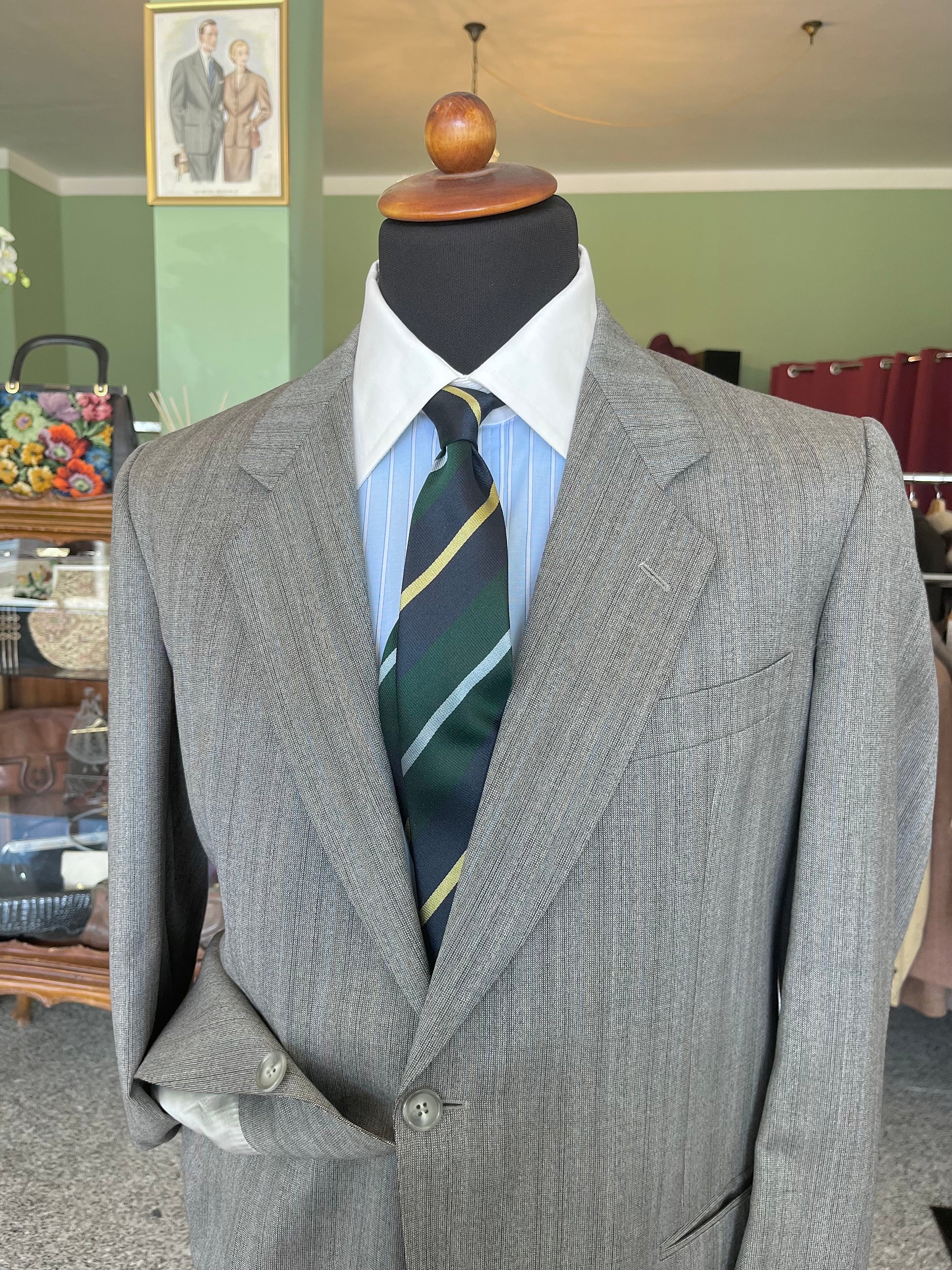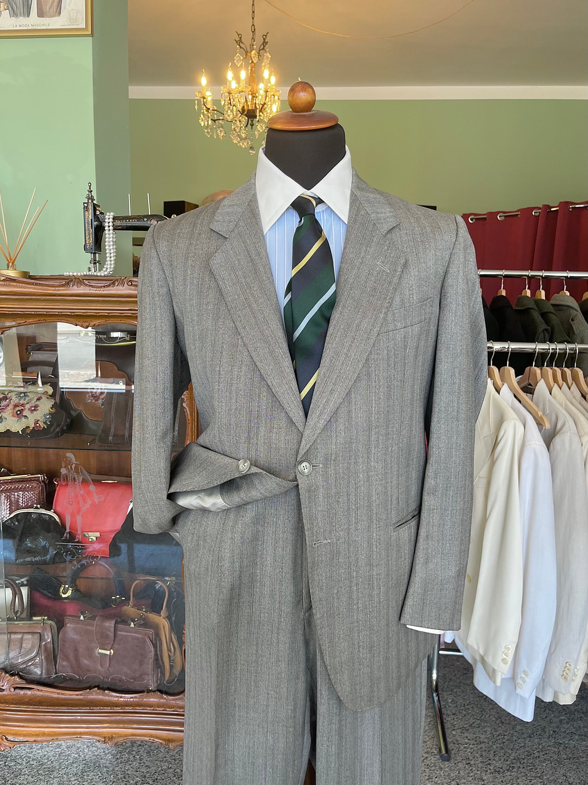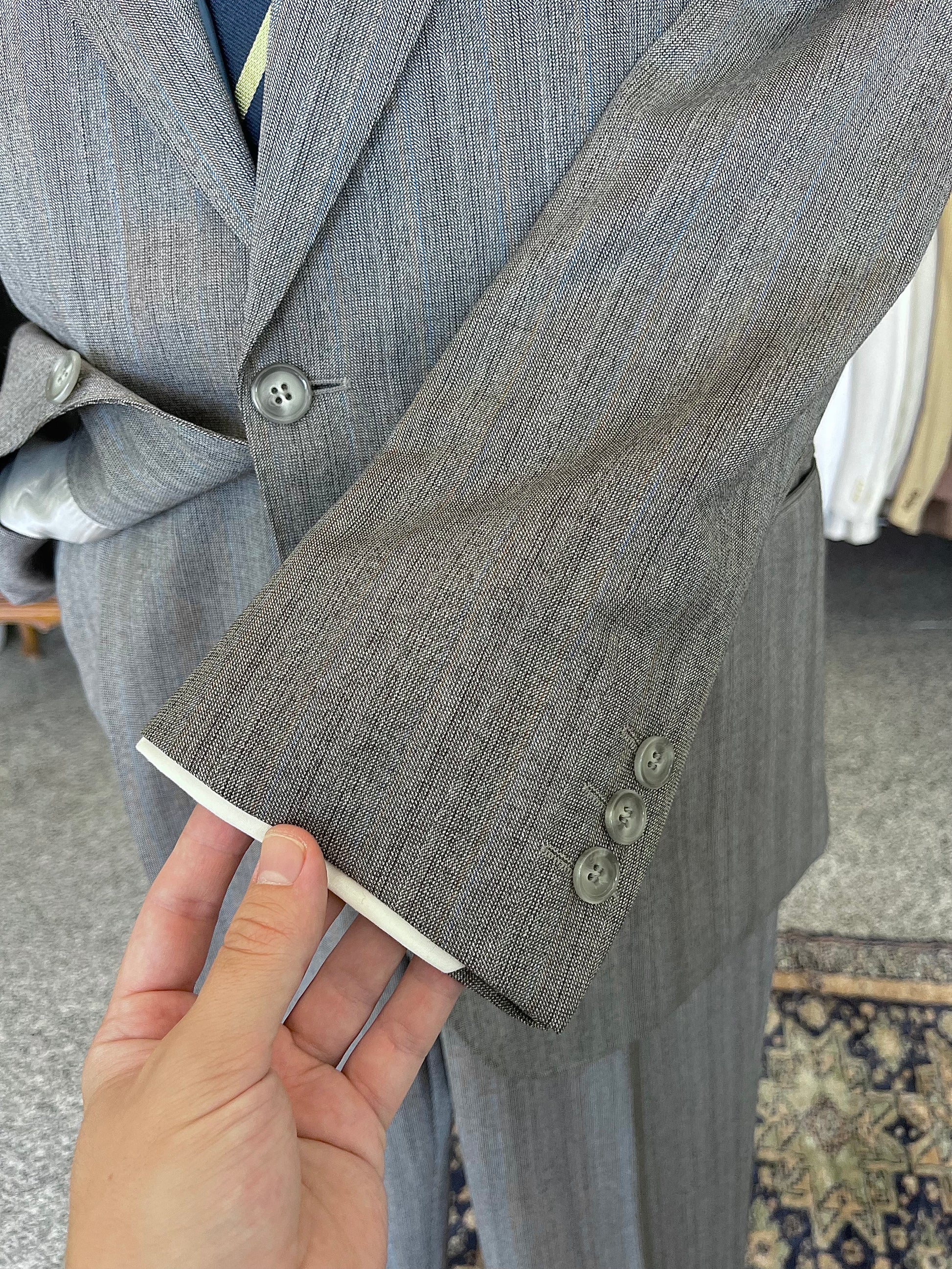 Il tessuto è 100% pura lana, di pesantezza media, quindi ideale per la mezza stagione, di colore grigio medio con leggera gessatura.