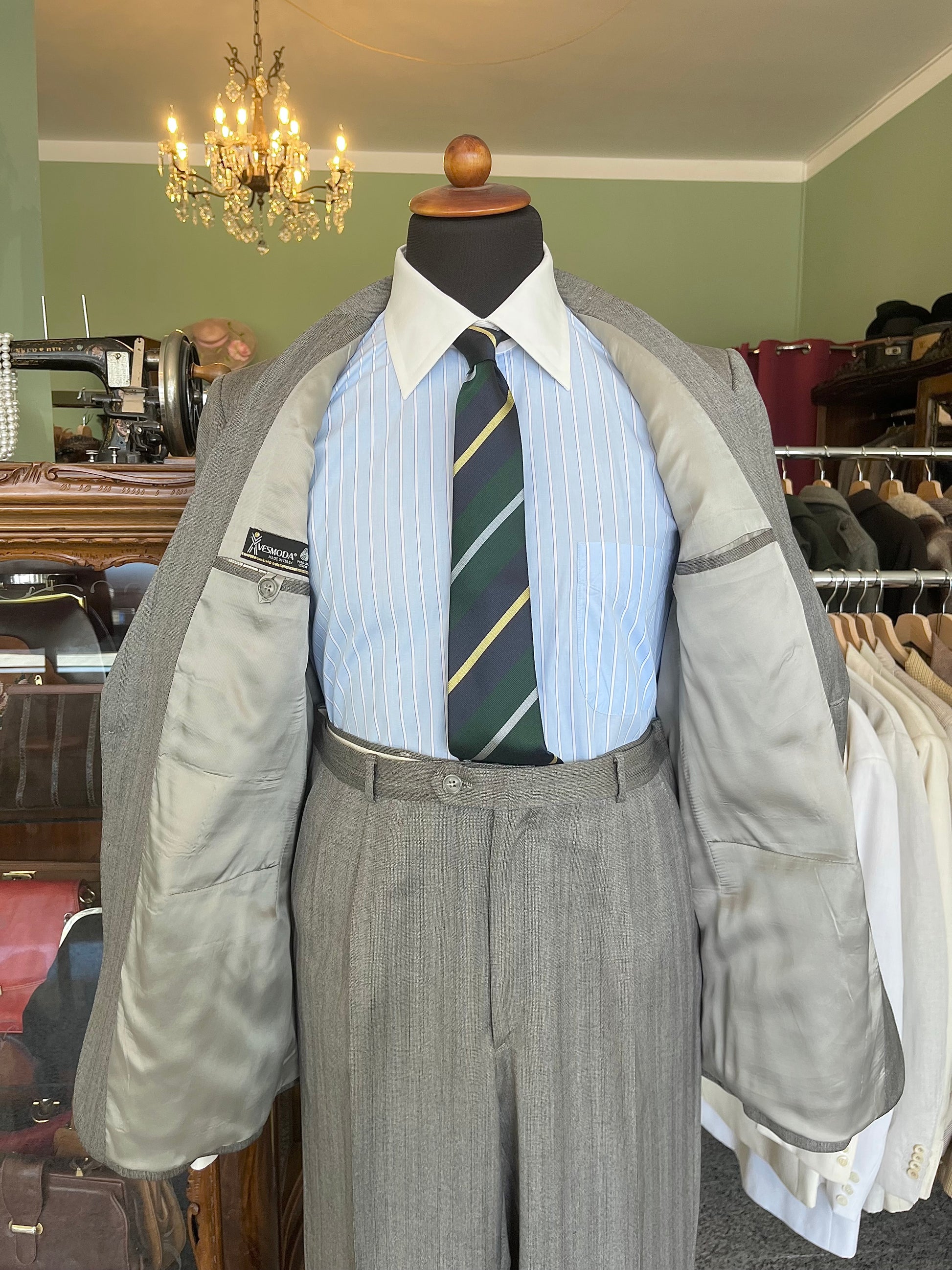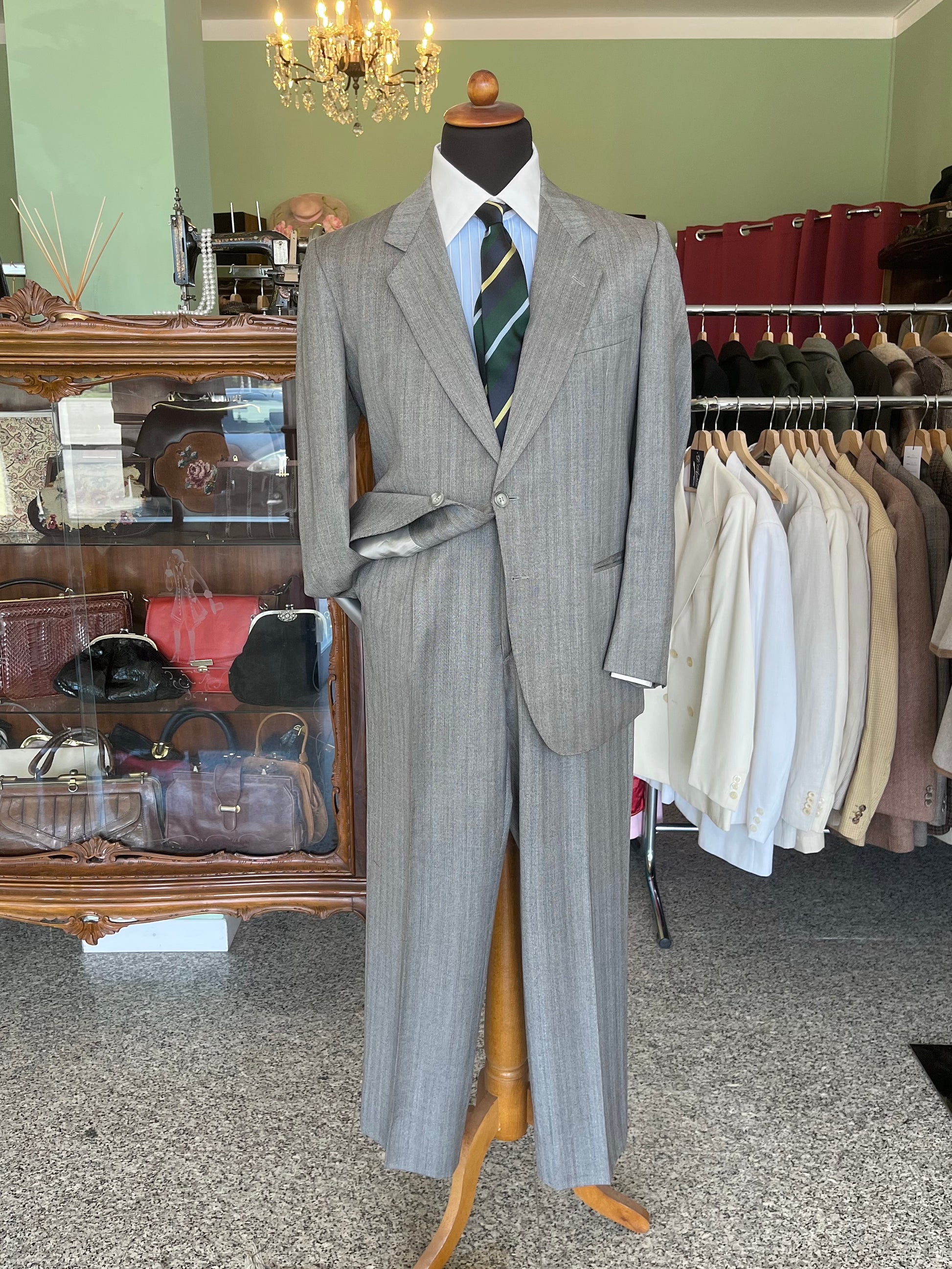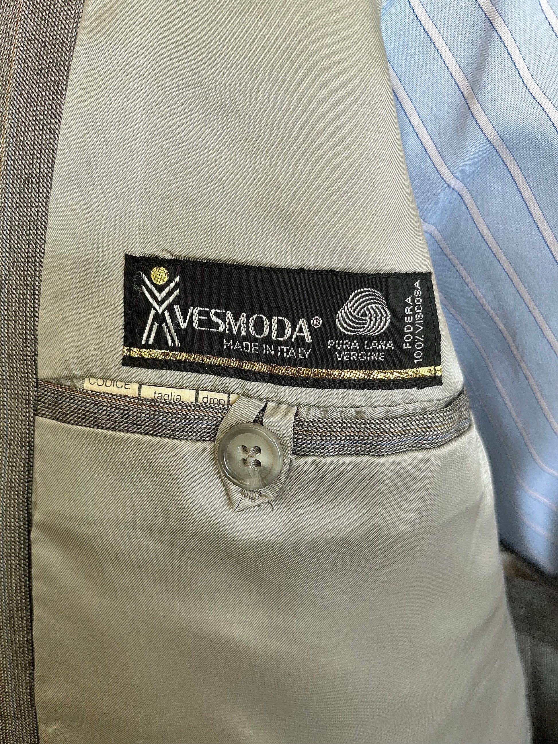 Il tessuto è 100% pura lana, di pesantezza media, quindi ideale per la mezza stagione, di colore grigio medio con leggera gessatura.