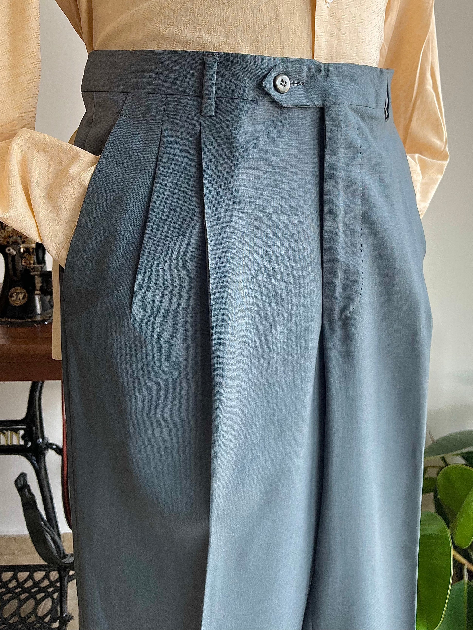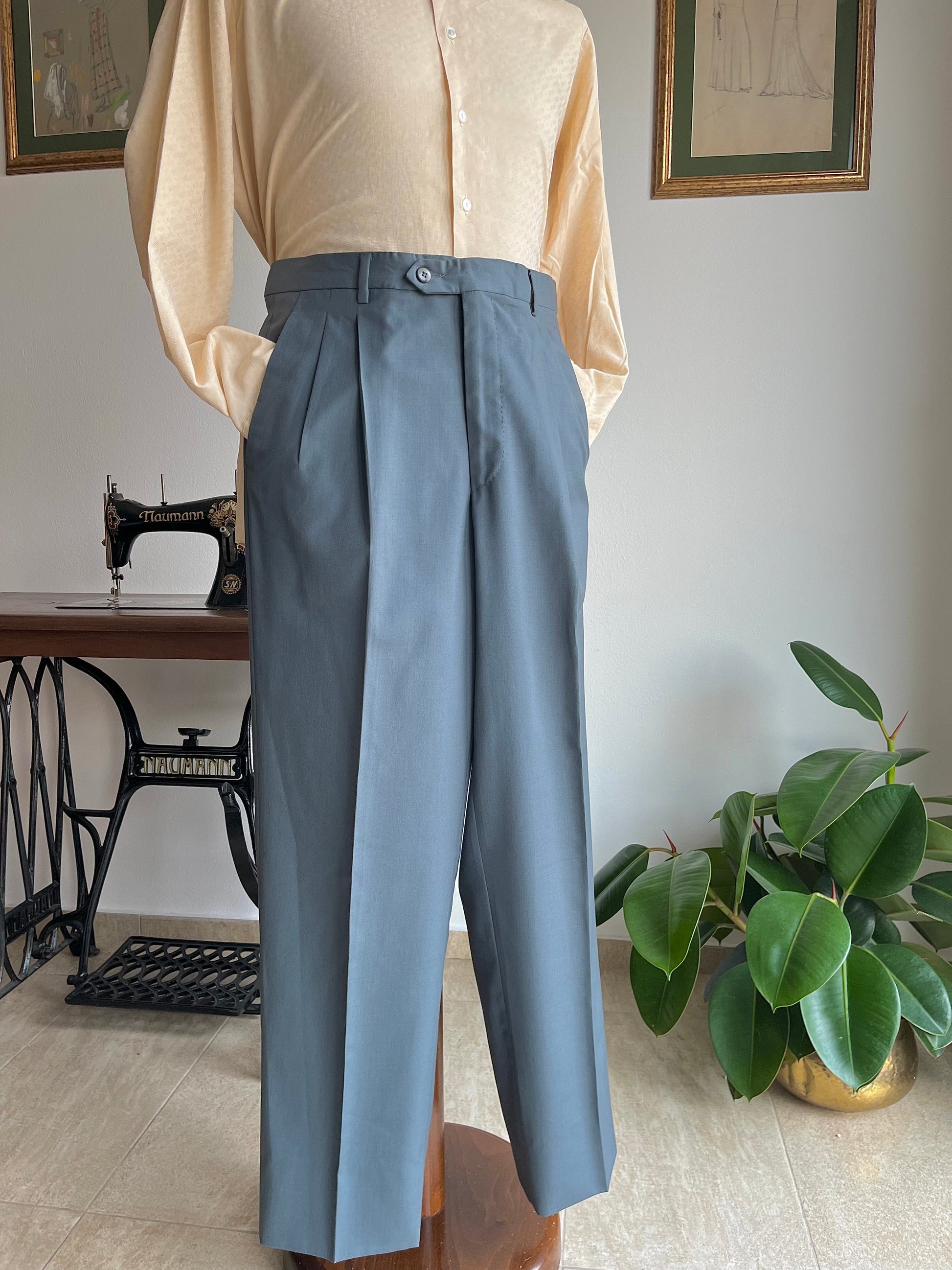 I calzoni hanno un taglio classico, con vita alta, doppia piega in vita ed un taglio dritto.