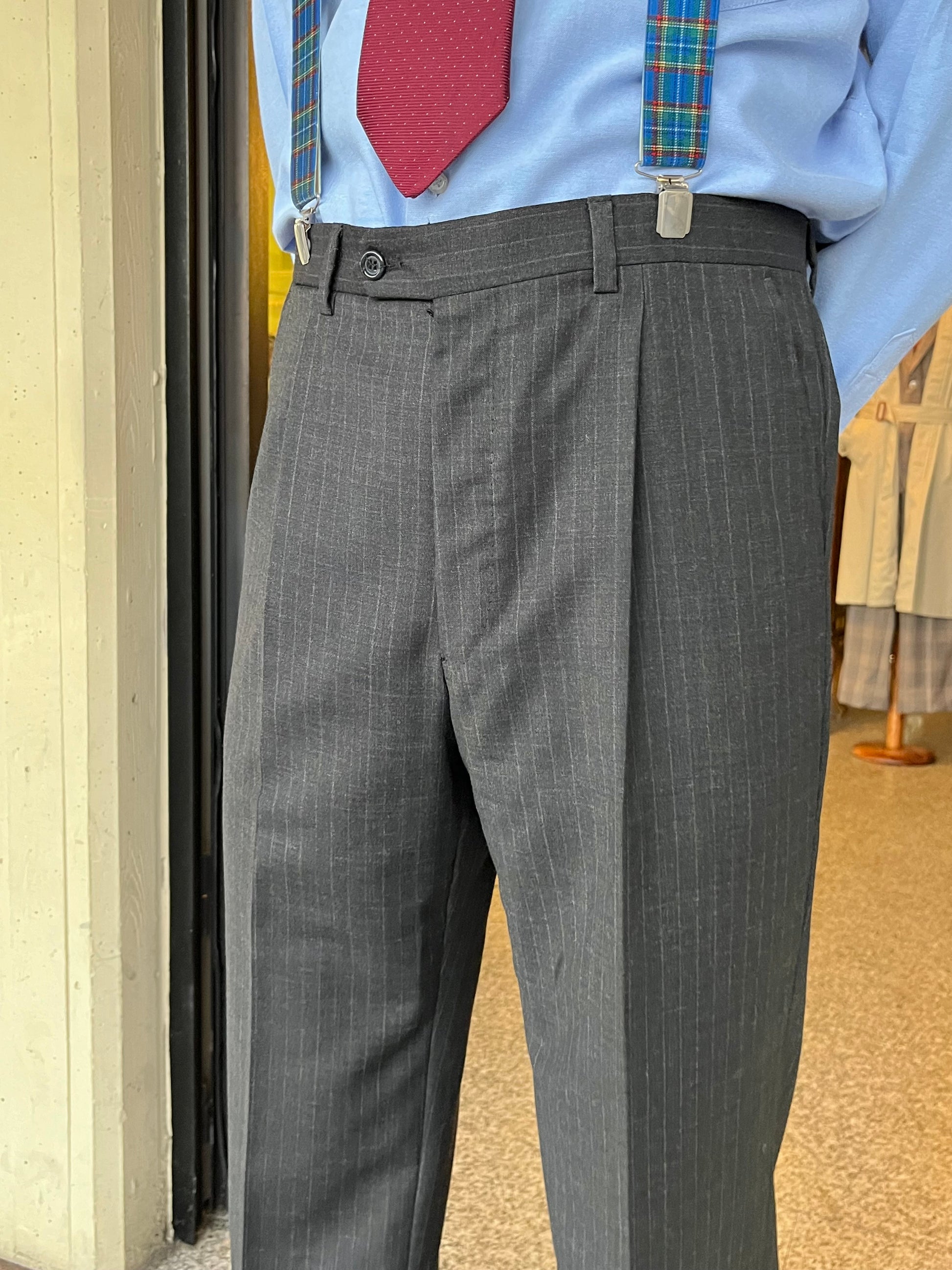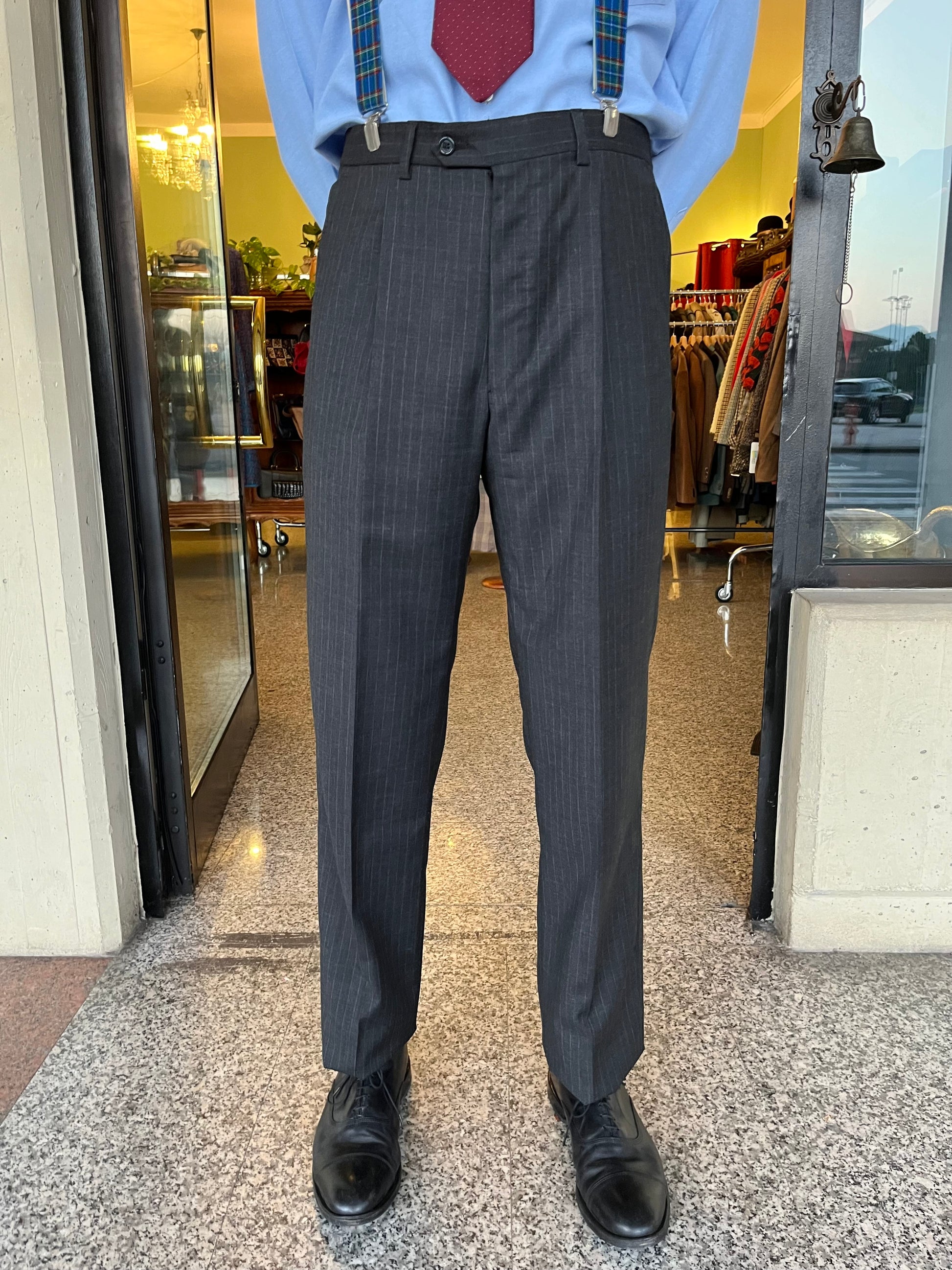 Completo anni ‘90, in pura lana vergine, color grigio medio gessato.