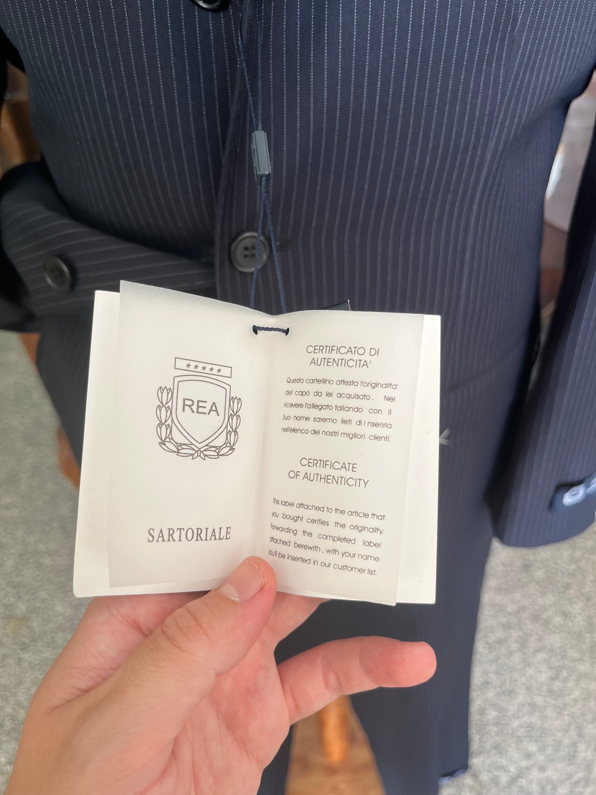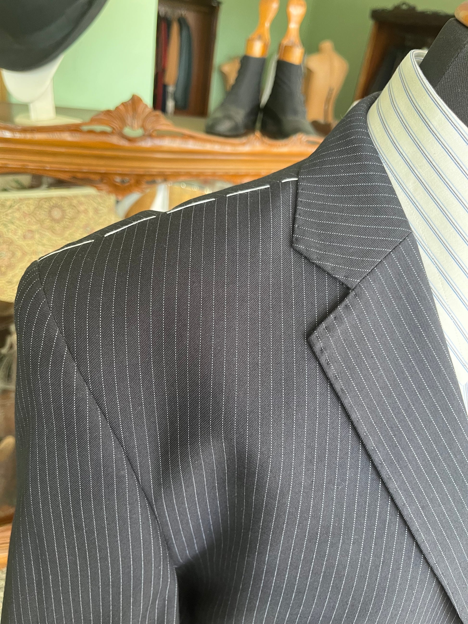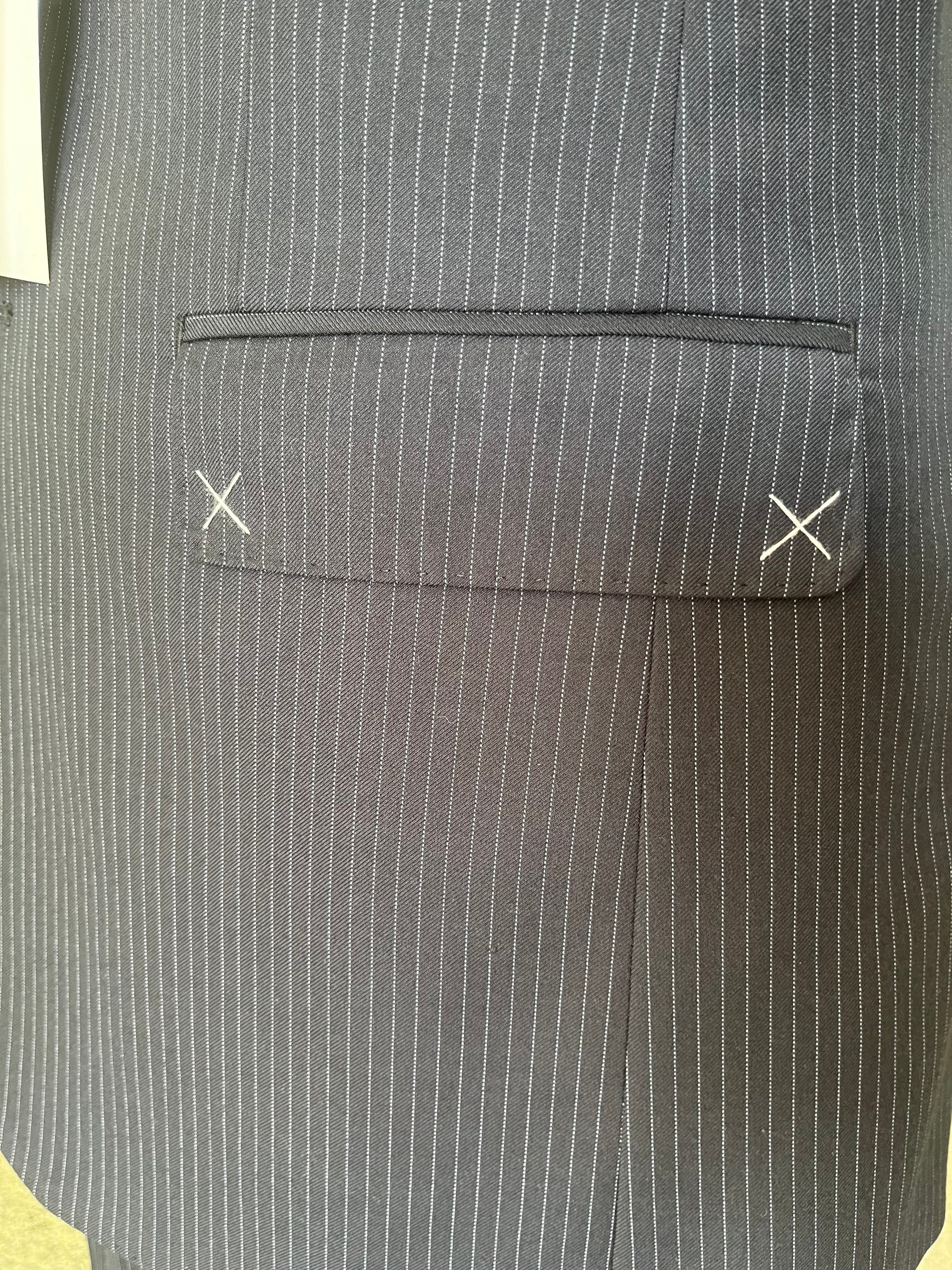 Il tessuto è 100% pura lana Tasmania di colore blu notte gessato e pesantezza medio-leggera.
