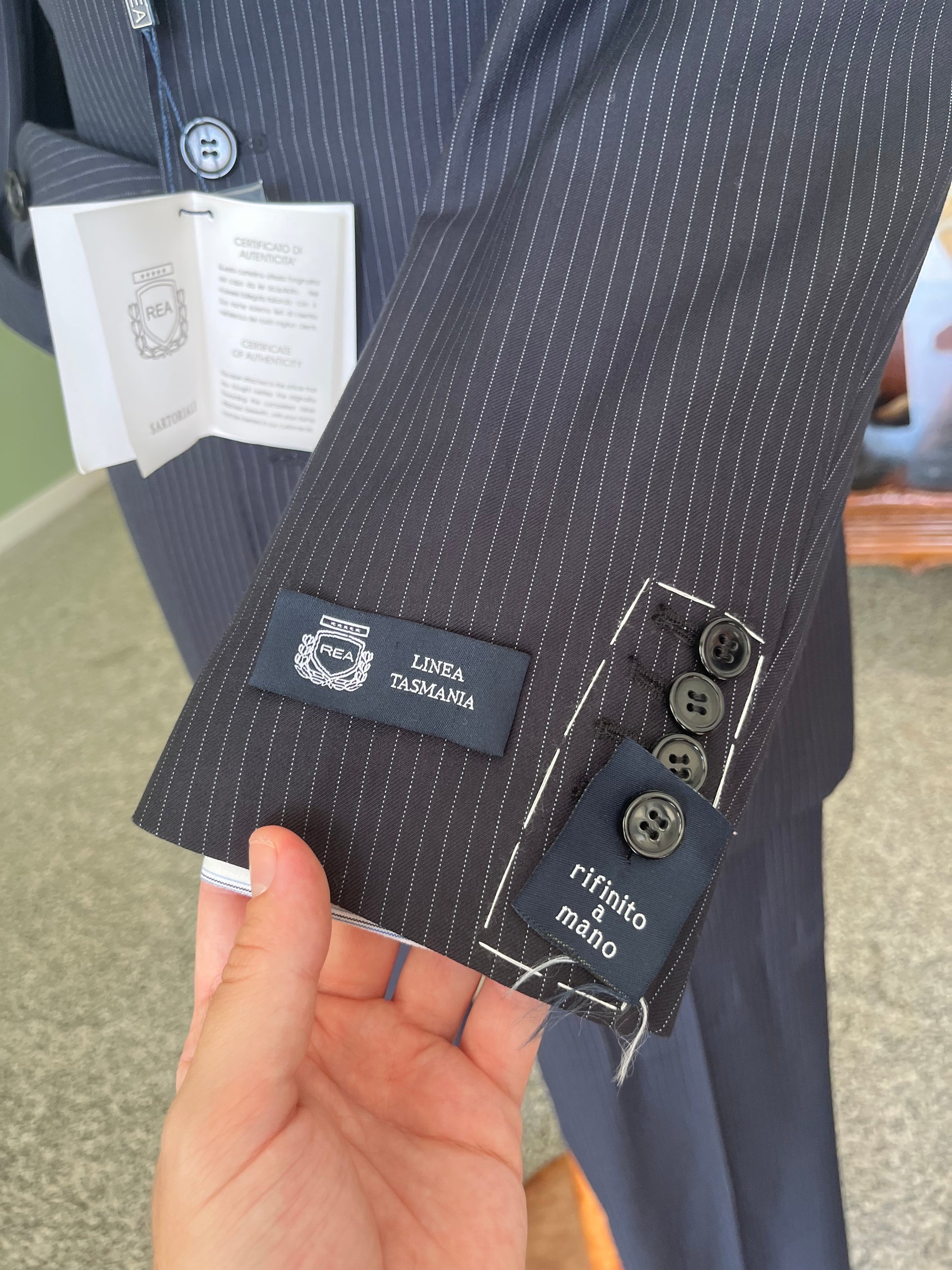 Il completo è un fondo di magazzino, quindi mai utilizzato, con ancora le imbastiture. Presenta inoltre lavorazioni fatte a mano.