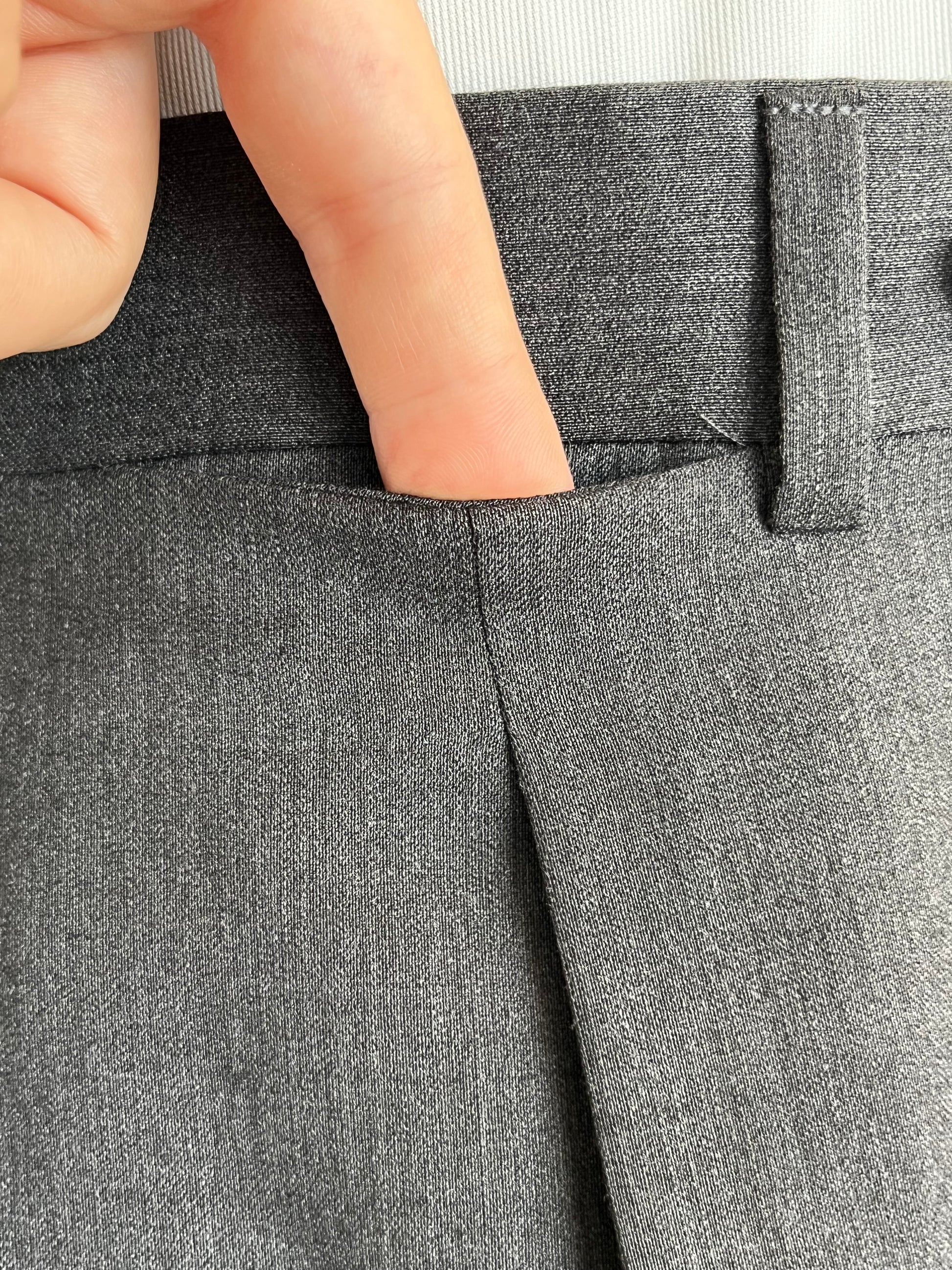 I calzoni hanno un taglio classico, con vita alta , doppia piega in vita e taschino da orologio.