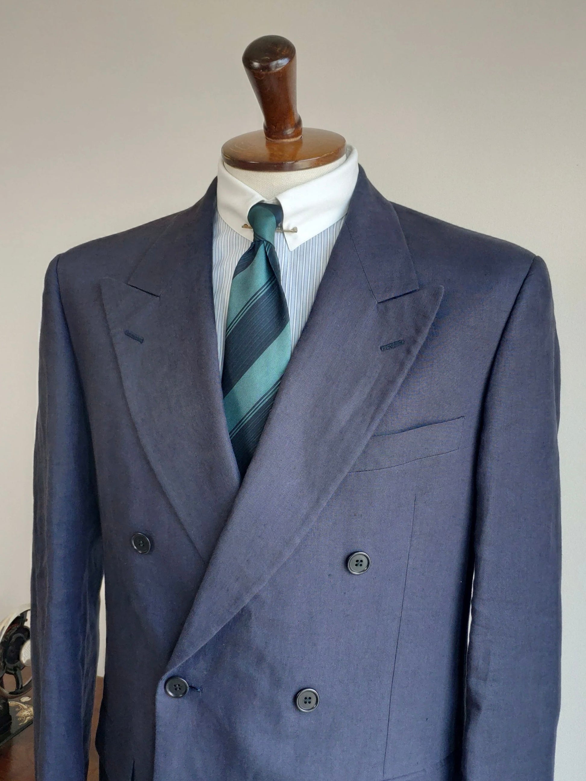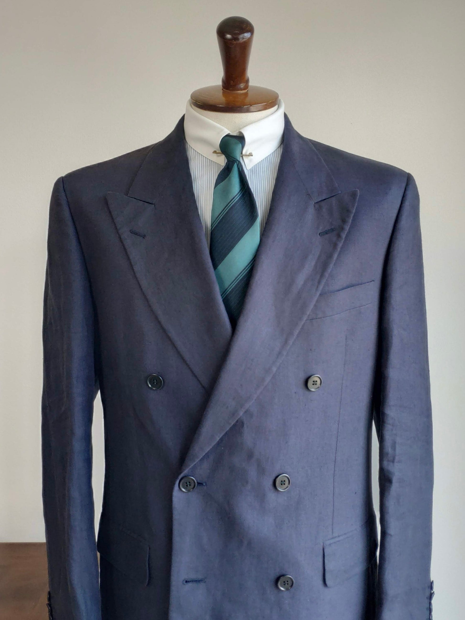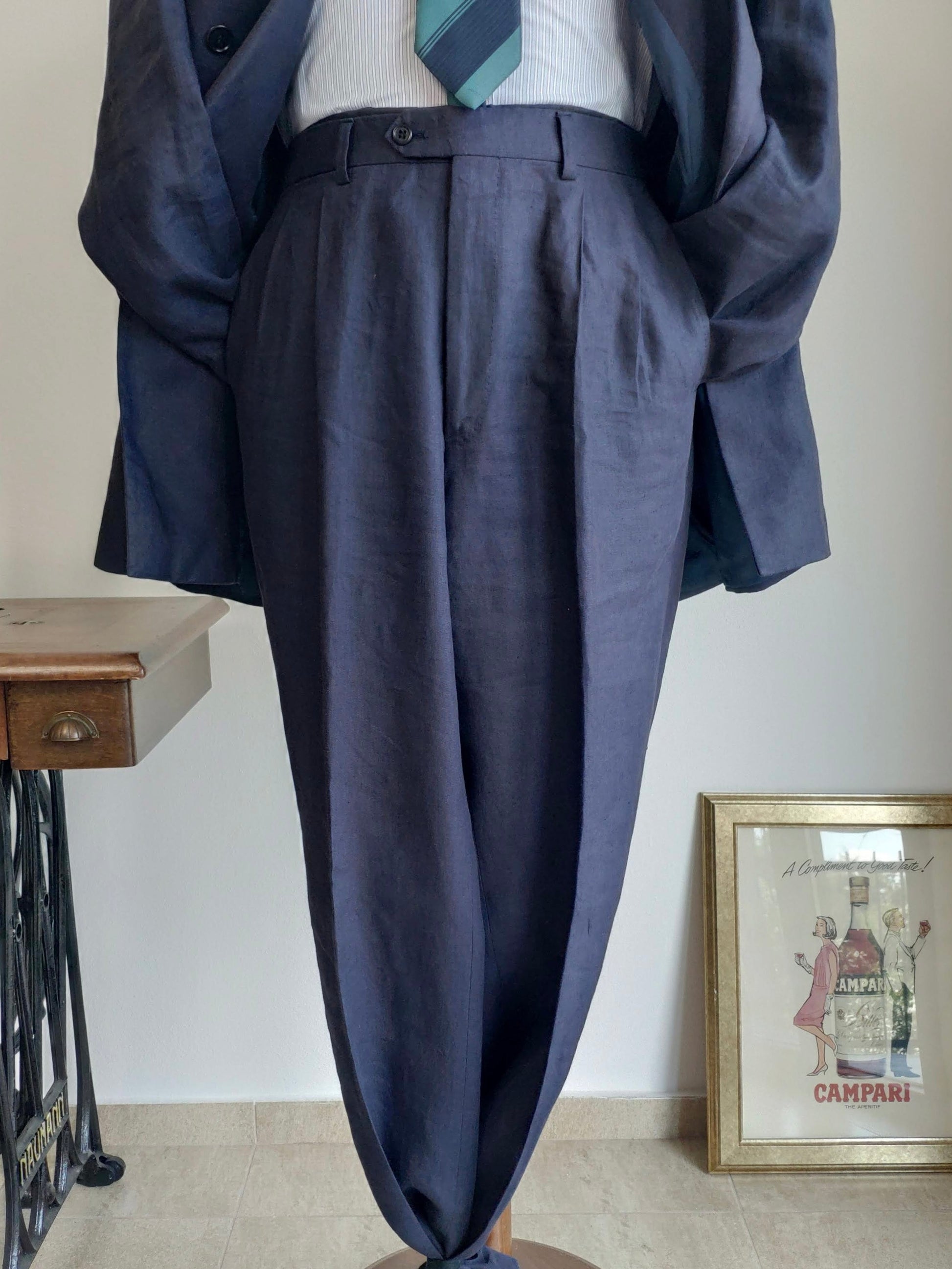 Completo doppiopetto degli anni '80, in 100% lino, color blu notte.