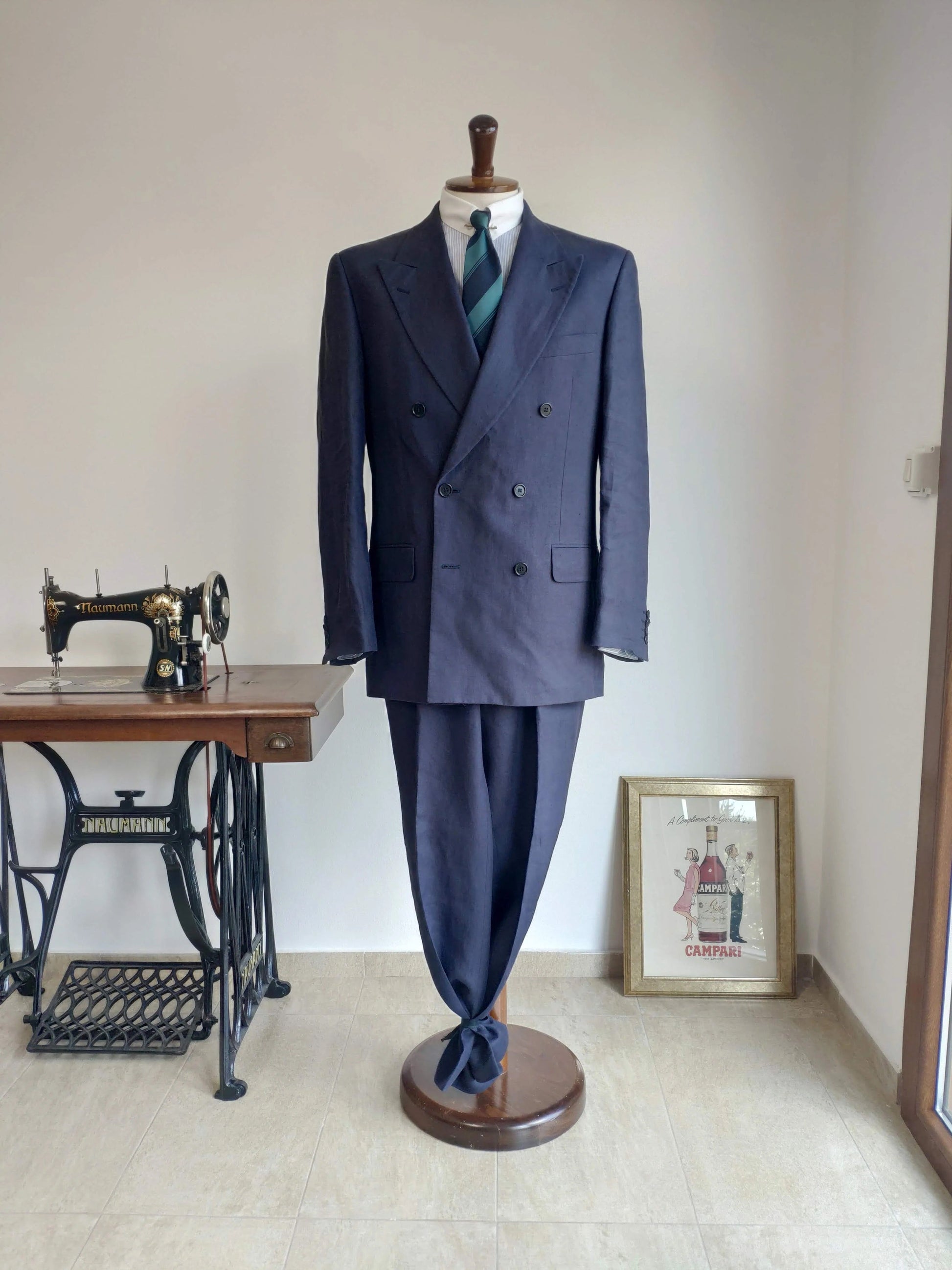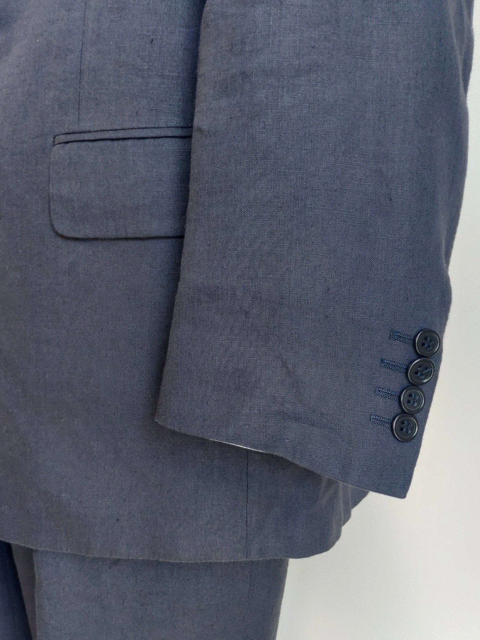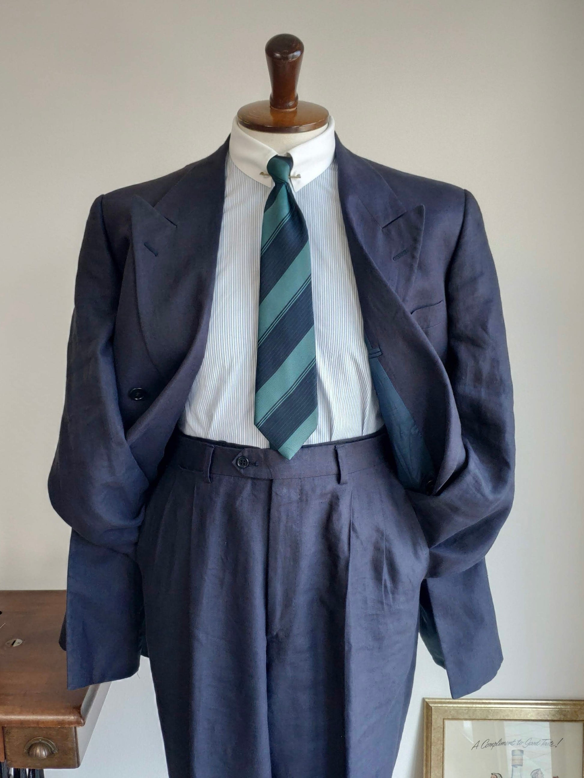 Completo doppiopetto degli anni '80, in 100% lino, color blu notte.