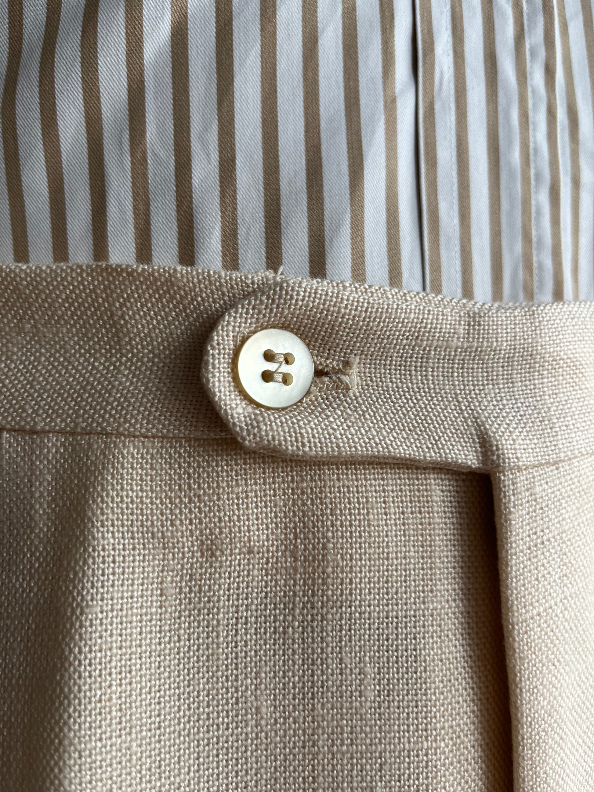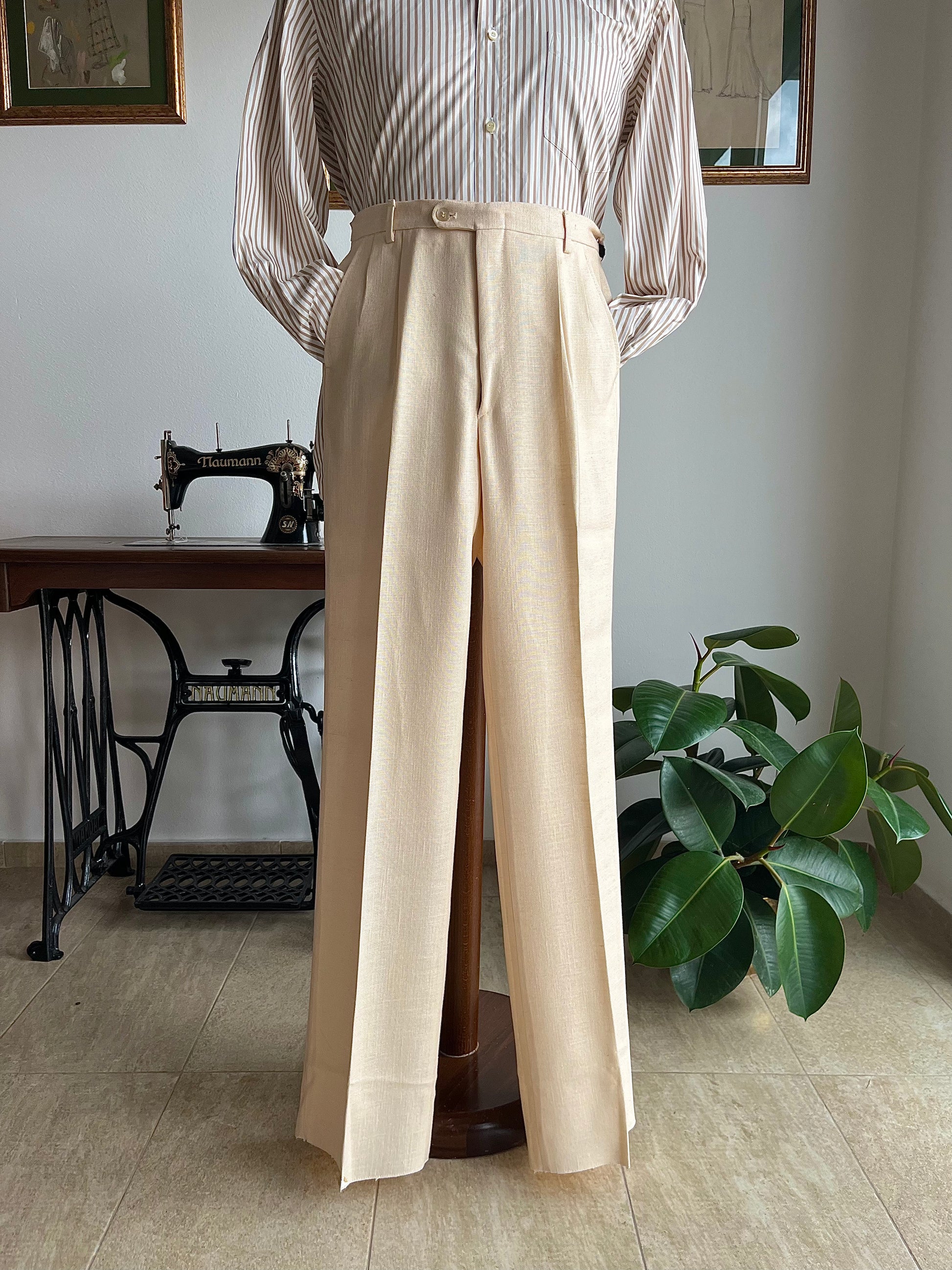 Il tessuto è 100% puro lino di color burro. Il completo è un fondo di magazzino, quindi mai utilizzato con orli ancora da chiudere. È inoltre rifinito a mano.